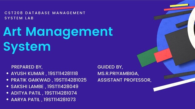 A T A B A S E M A N A G E M E N T S Y S T E M L A B GUIDED BY, MS.R.PRIYAMBIGA, ASSISTANT PROFESSOR, AYUSH KUMAR , 19ST114281118 PRATIK GAIKWAD , 19ST114281025 SAKSHI LAMBE , 19ST11428049 ADITYA PATIL , 19ST114281074 AARYA PATIL , 19ST114281073 PREPARED BY,