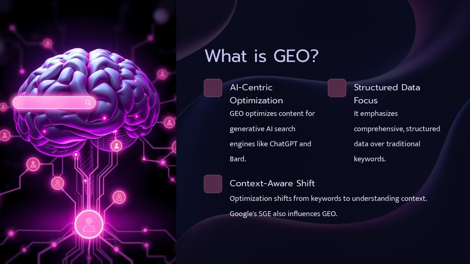 AI search engines like ChatGPT and Bard. Structured Data Focus It emphasizes comprehensive, structured data over traditional keywords. Context-Aware Shift Optimization shifts from keywords to understanding context. Google's SGE also influences GEO.