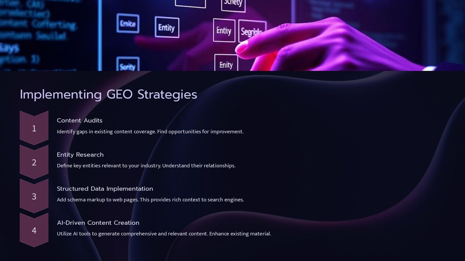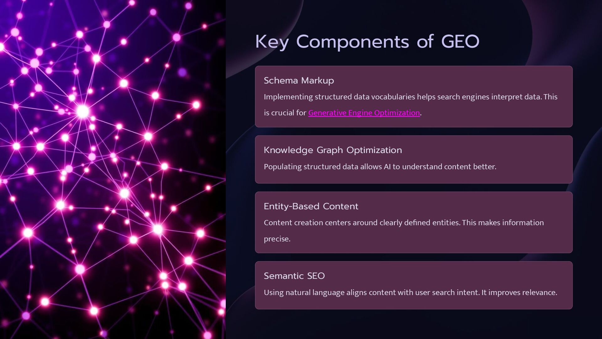 helps search engines interpret data. This is crucial for Generative Engine Optimization. Knowledge Graph Optimization Populating structured data allows AI to understand content better. Entity-Based Content Content creation centers around clearly defined entities. This makes information precise. Semantic SEO Using natural language aligns content with user search intent. It improves relevance.