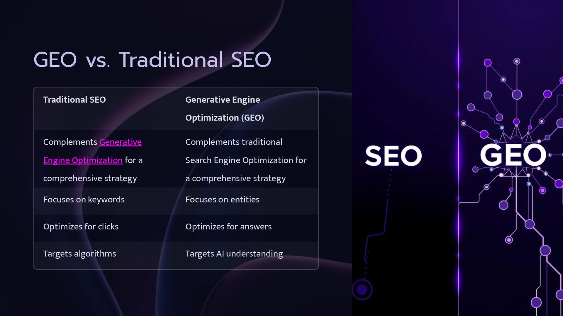 Complements Generative Engine Optimization for a comprehensive strategy Complements traditional Search Engine Optimization for a comprehensive strategy Focuses on keywords Focuses on entities Optimizes for clicks Optimizes for answers Targets algorithms Targets AI understanding