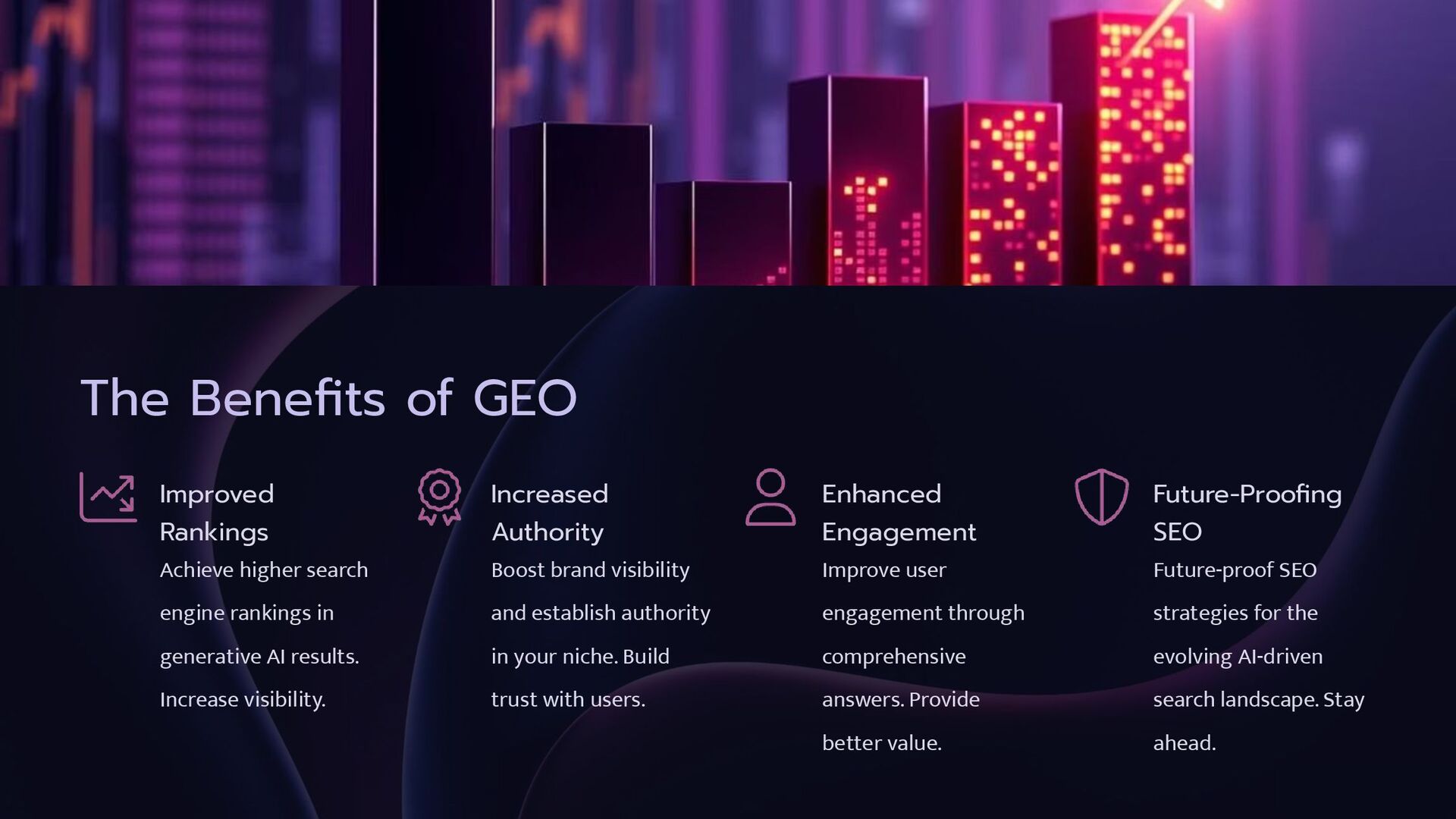 rankings in generative AI results. Increase visibility. Increased Authority Boost brand visibility and establish authority in your niche. Build trust with users. Enhanced Engagement Improve user engagement through comprehensive answers. Provide better value. Future-Proofing SEO Future-proof SEO strategies for the evolving AI-driven search landscape. Stay ahead.