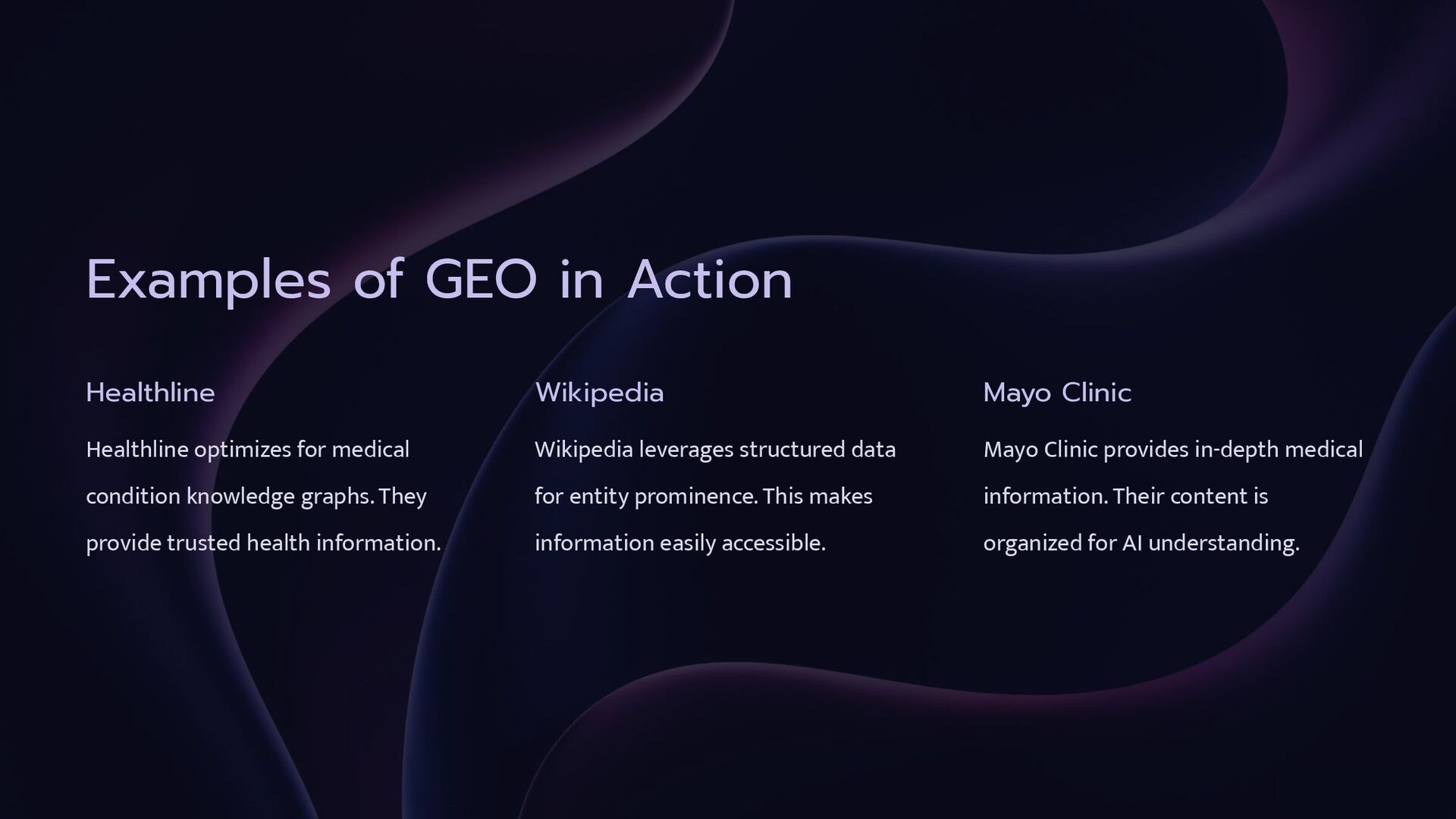 condition knowledge graphs. They provide trusted health information. Wikipedia Wikipedia leverages structured data for entity prominence. This makes information easily accessible. Mayo Clinic Mayo Clinic provides in-depth medical information. Their content is organized for AI understanding.