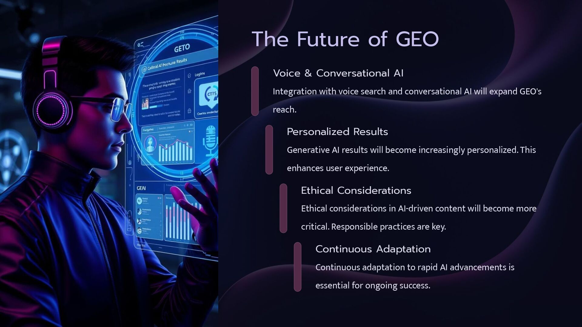 voice search and conversational AI will expand GEO's reach. Personalized Results Generative AI results will become increasingly personalized. This enhances user experience. Ethical Considerations Ethical considerations in AI-driven content will become more critical. Responsible practices are key. Continuous Adaptation Continuous adaptation to rapid AI advancements is essential for ongoing success.