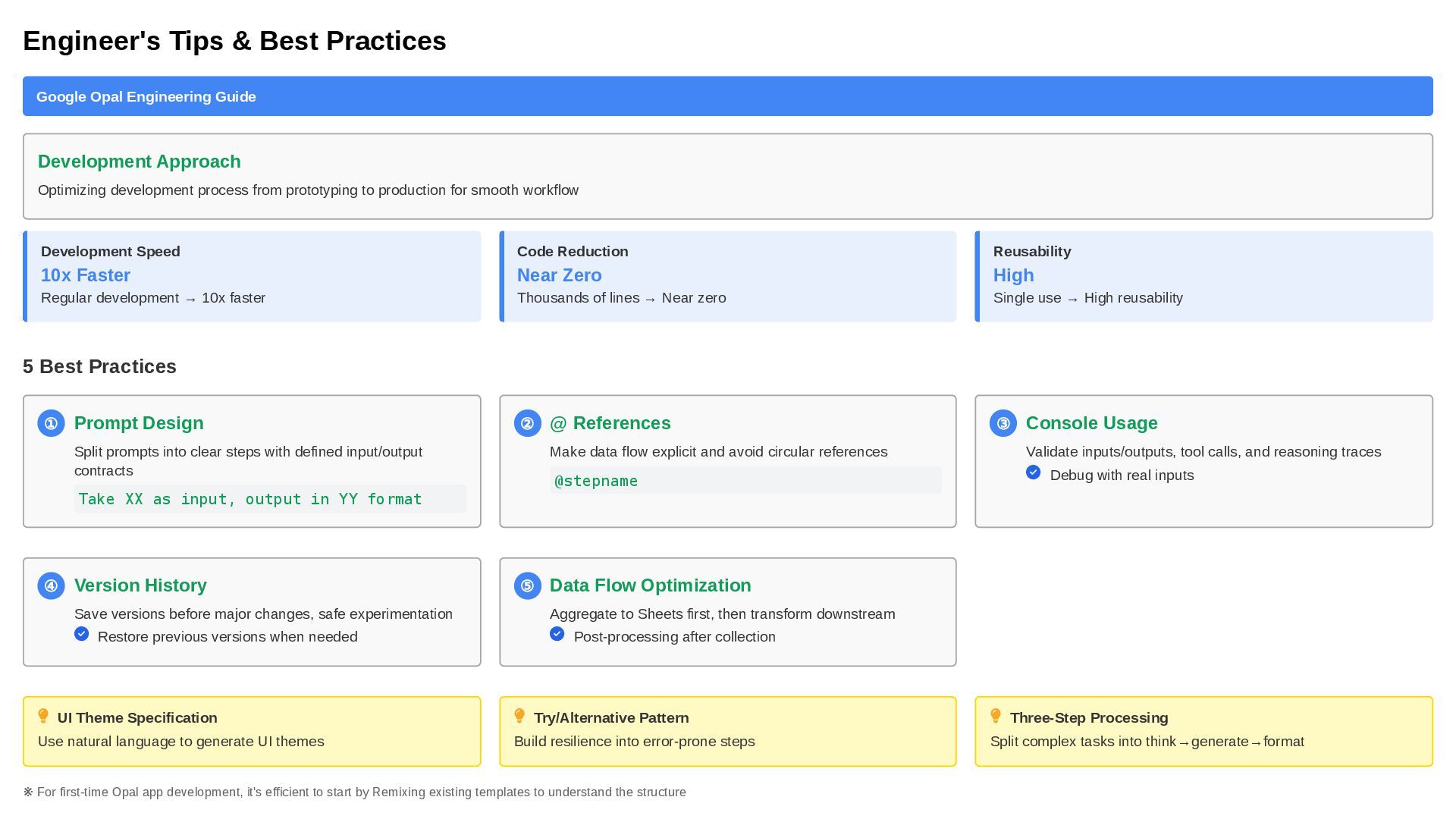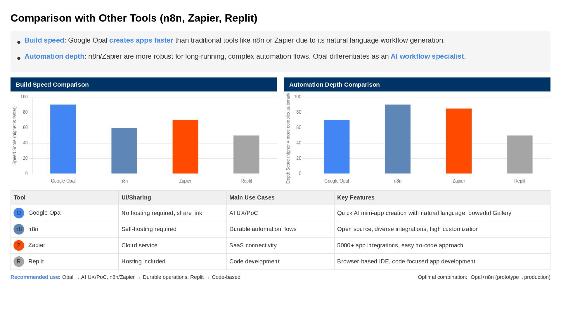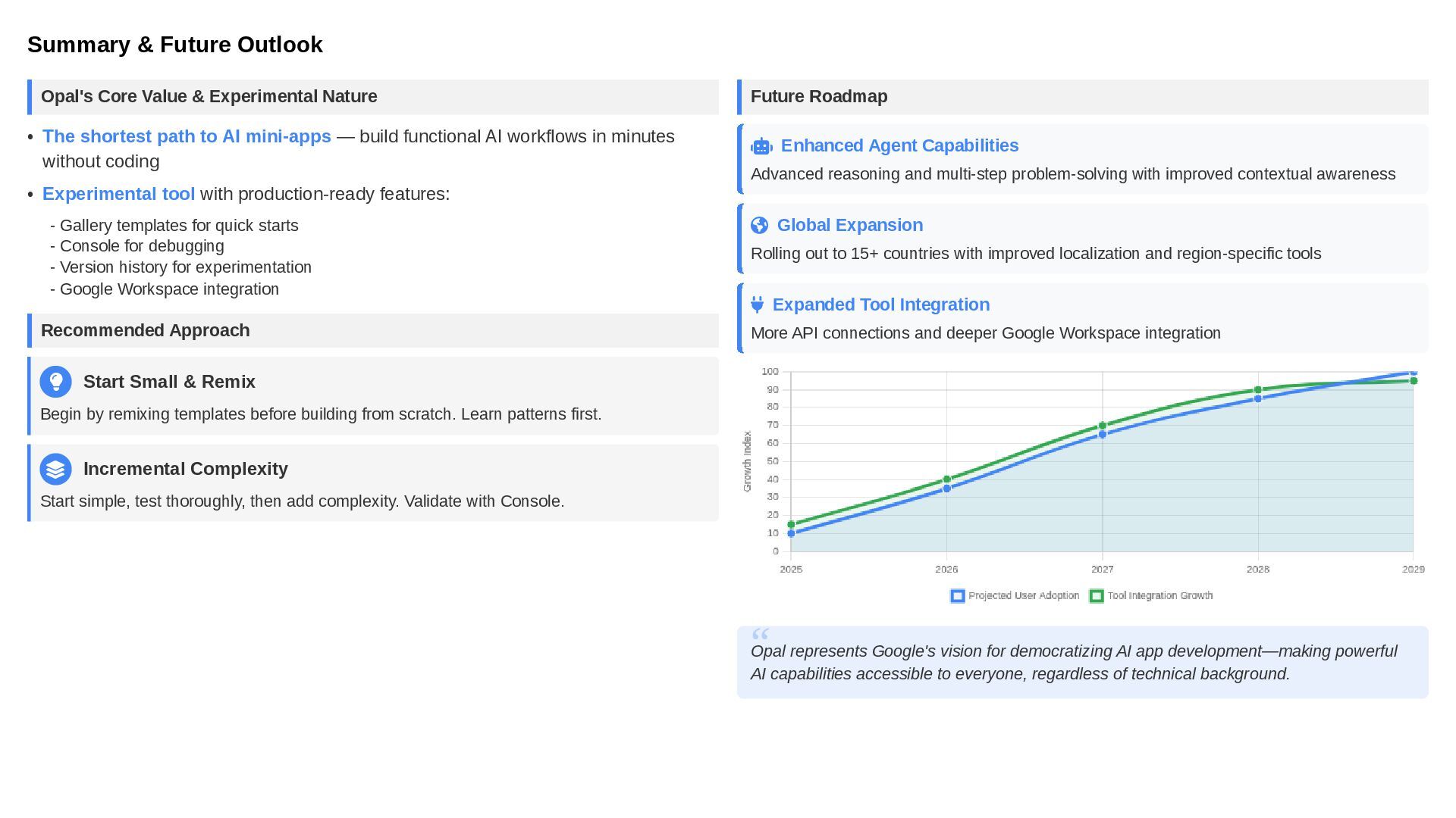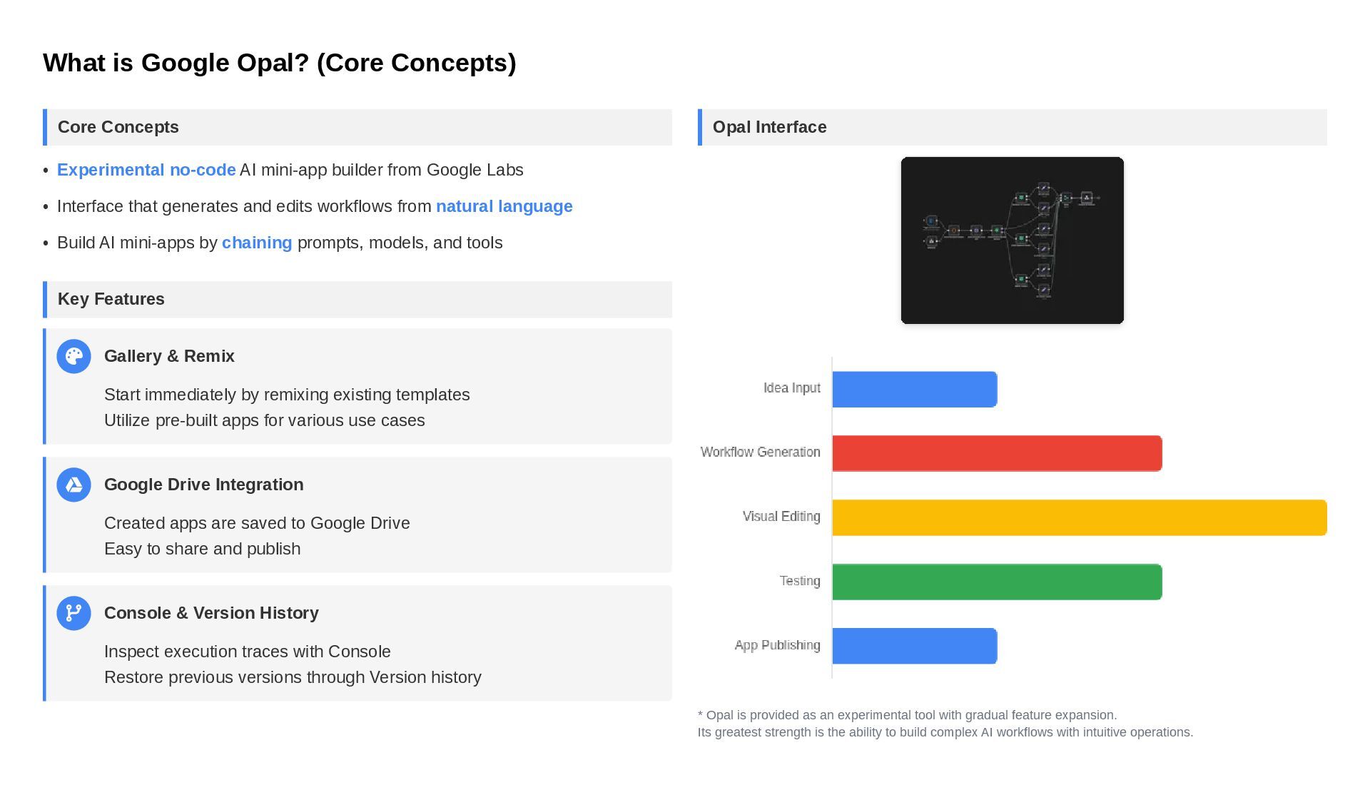 This presentation provides a comprehensive guide to Google Opal, Google Labs' no-code AI mini-app builder enabling users to create, edit, and share AI workflows using natural language. Featuring Powerful multi-step orchestration, No Code development, and Instantly Usable deployment, Opal leverages Gemini models with five primary use cases spanning education, marketing, BI, productivity, and data analysis. The deck includes engineer-focused tips, comparative analysis with n8n and Zapier, and a future roadmap covering agent enhancements and global expansion for AI practitioners.