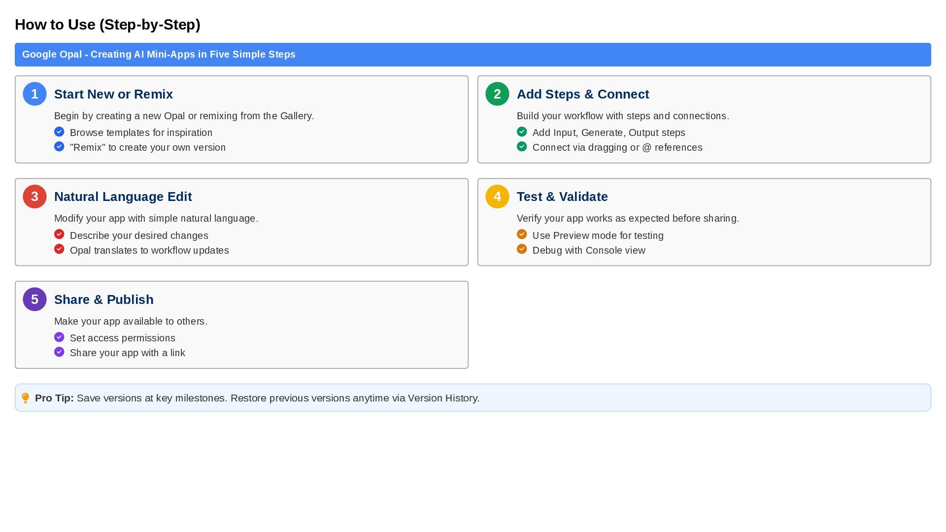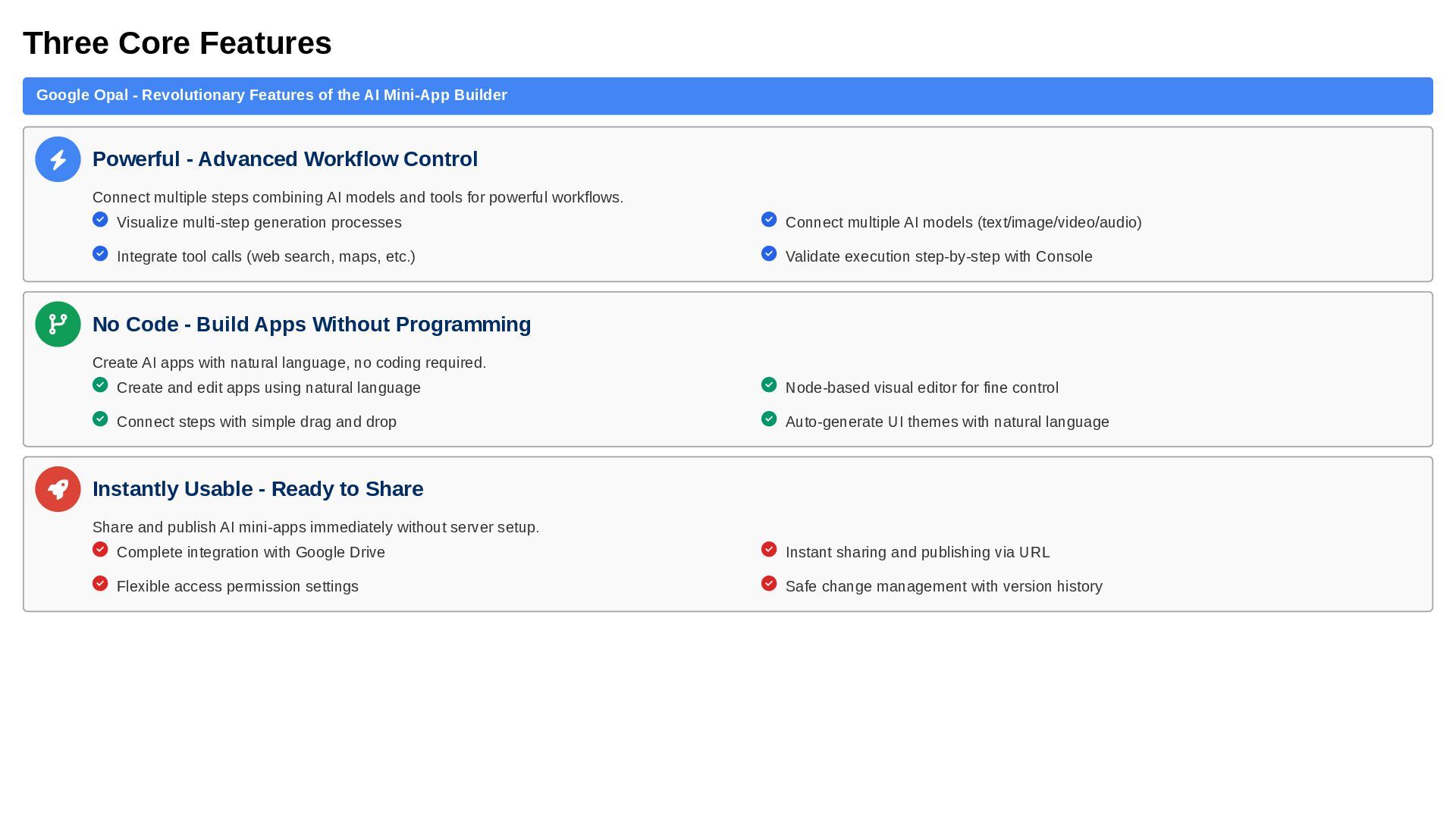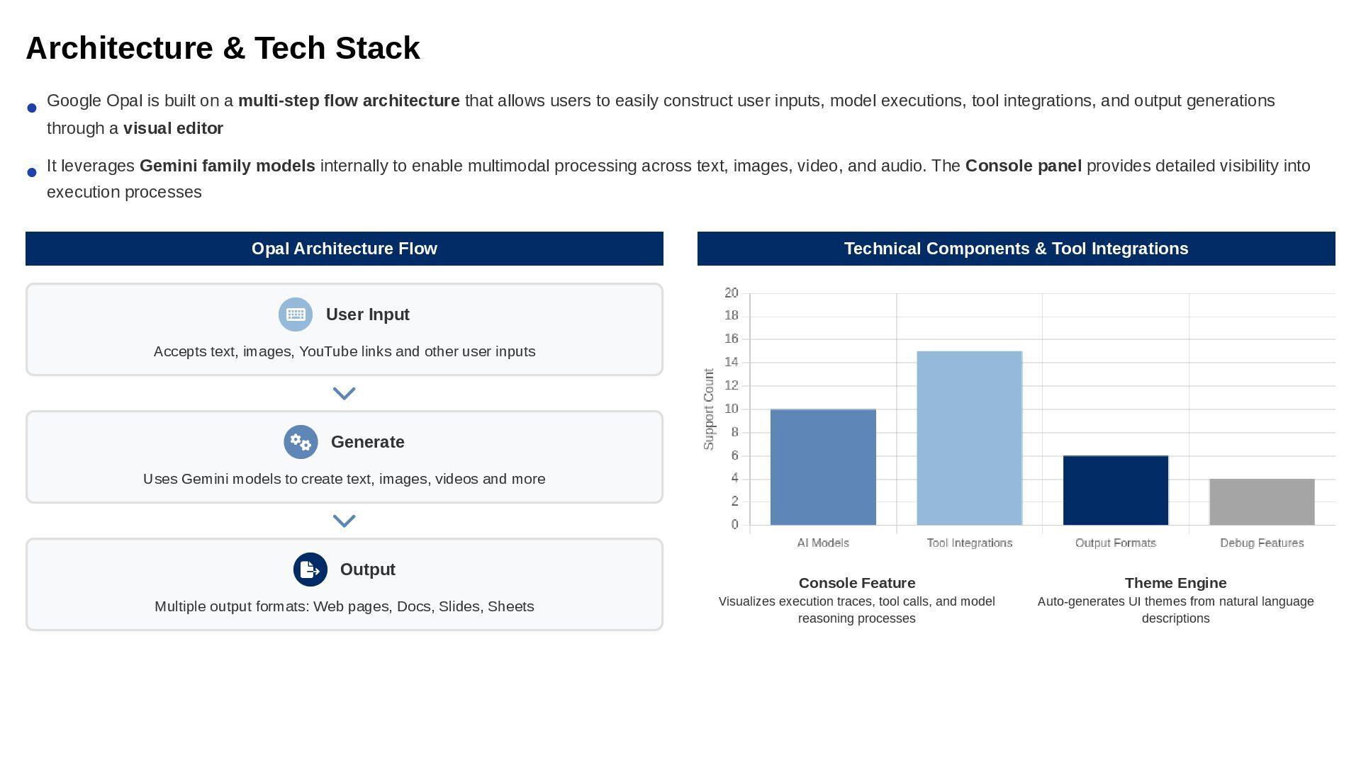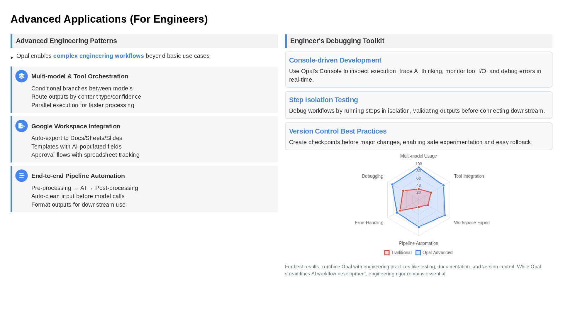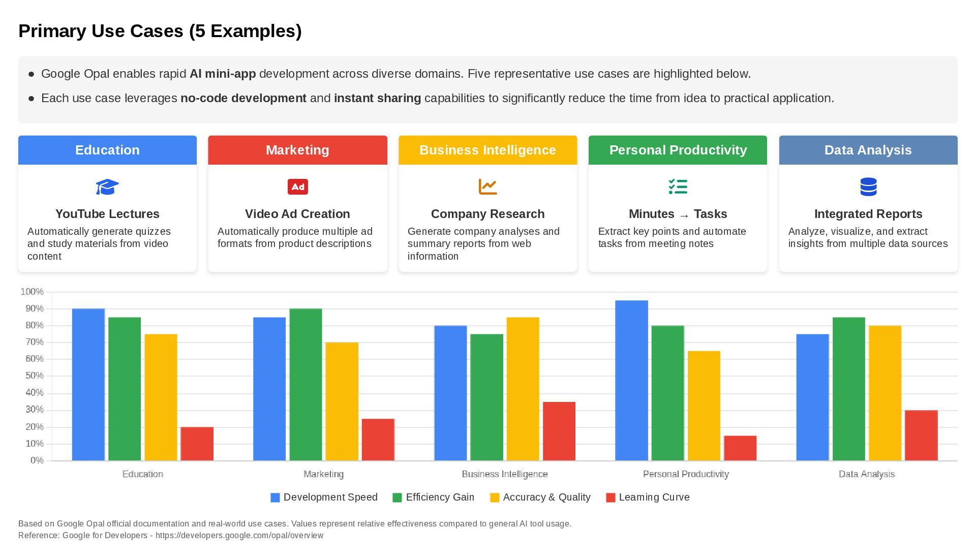 This presentation provides a comprehensive guide to Google Opal, Google Labs' no-code AI mini-app builder enabling users to create, edit, and share AI workflows using natural language. Featuring Powerful multi-step orchestration, No Code development, and Instantly Usable deployment, Opal leverages Gemini models with five primary use cases spanning education, marketing, BI, productivity, and data analysis. The deck includes engineer-focused tips, comparative analysis with n8n and Zapier, and a future roadmap covering agent enhancements and global expansion for AI practitioners.