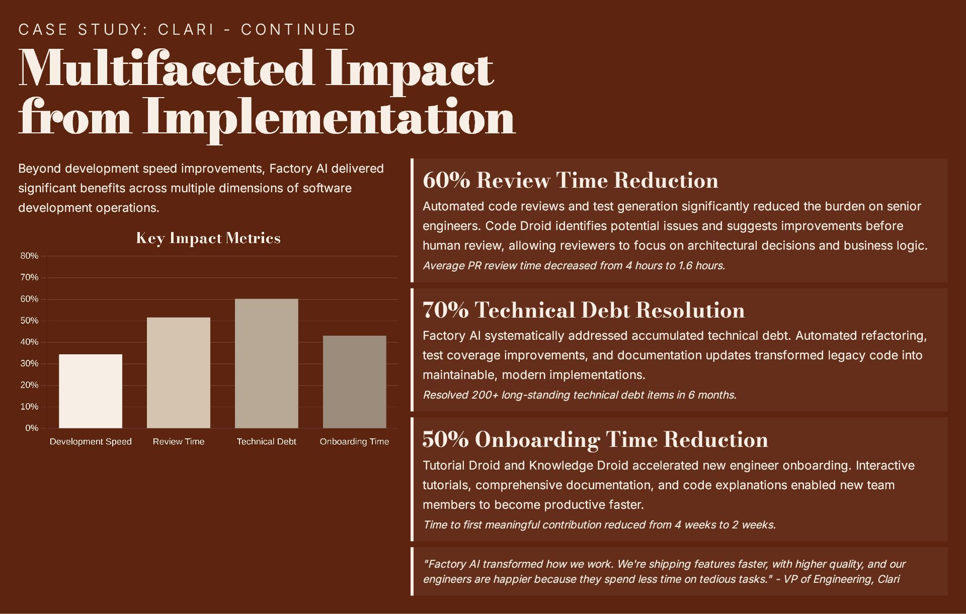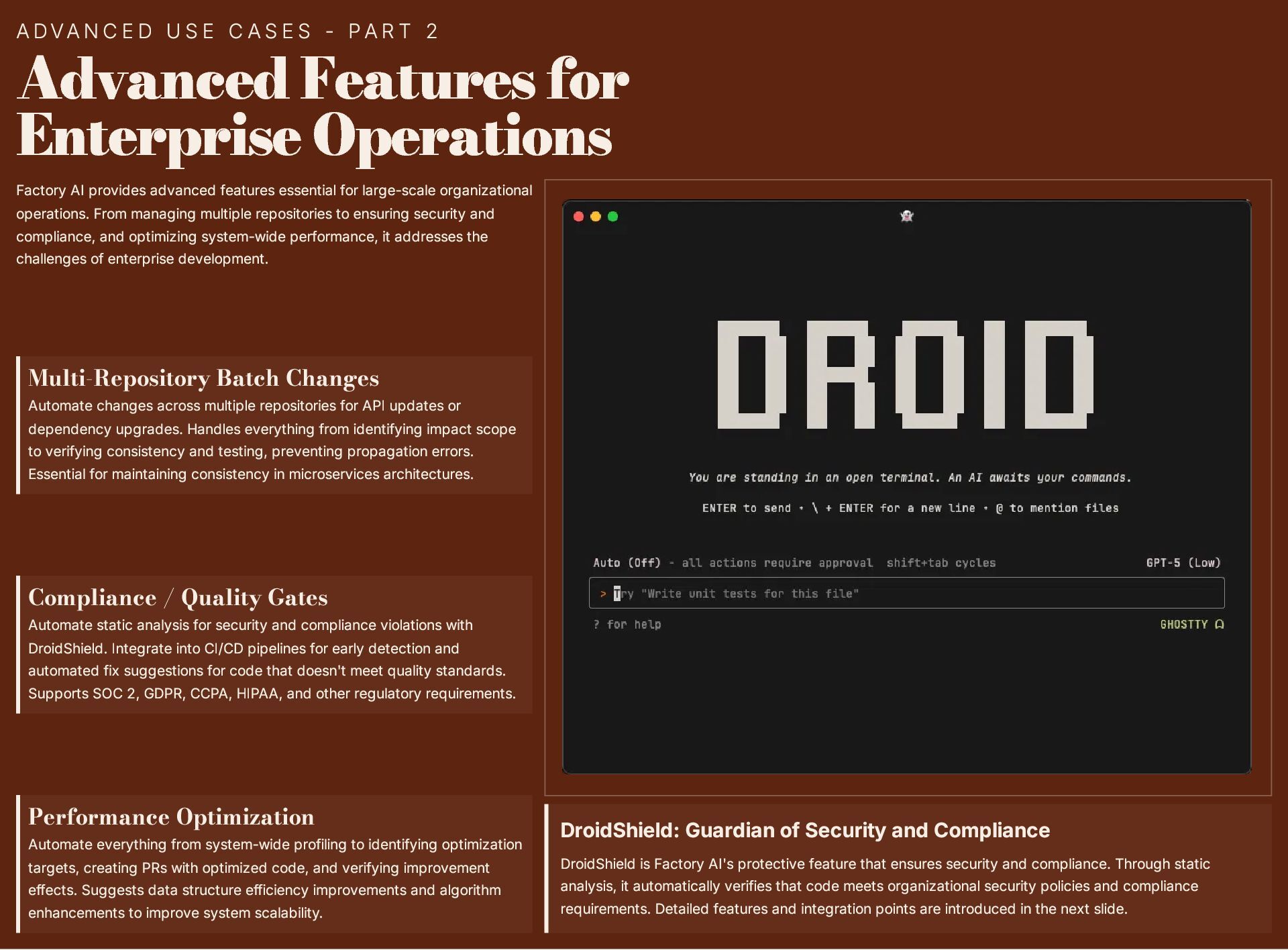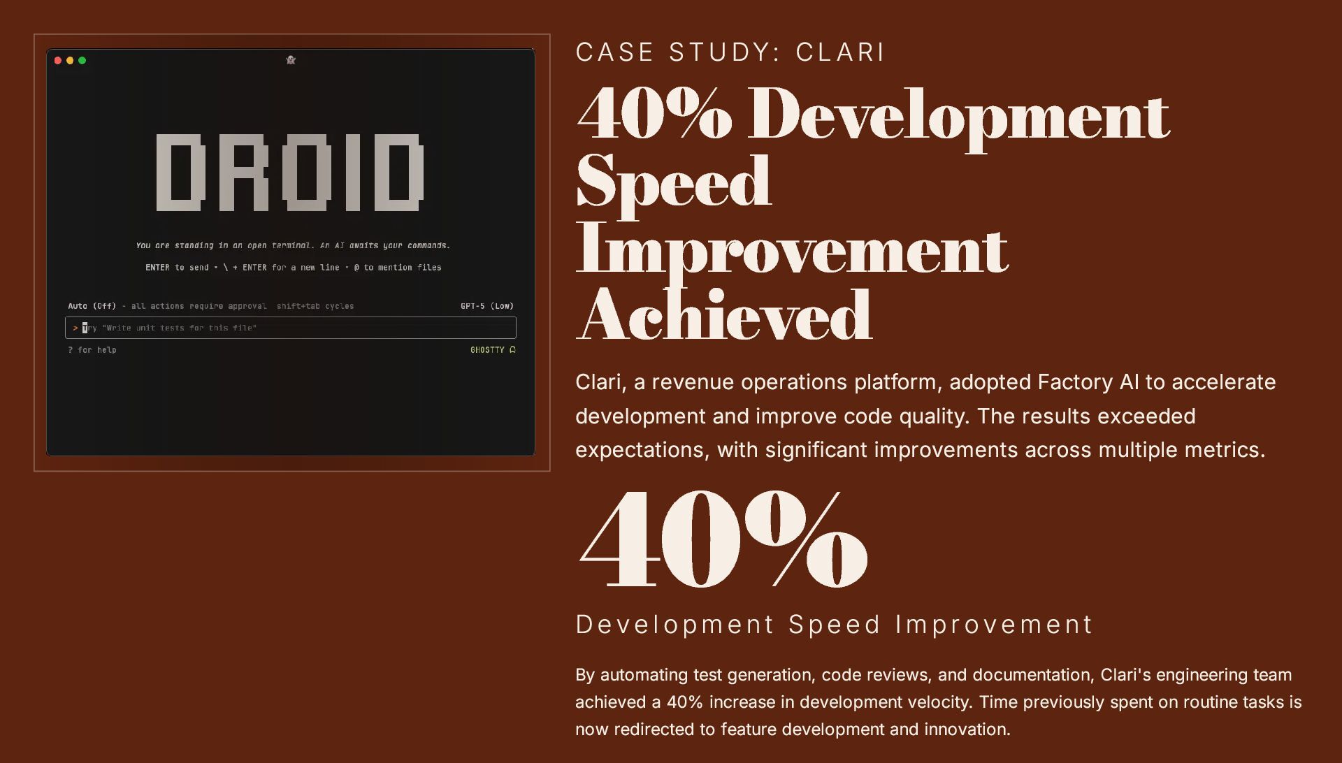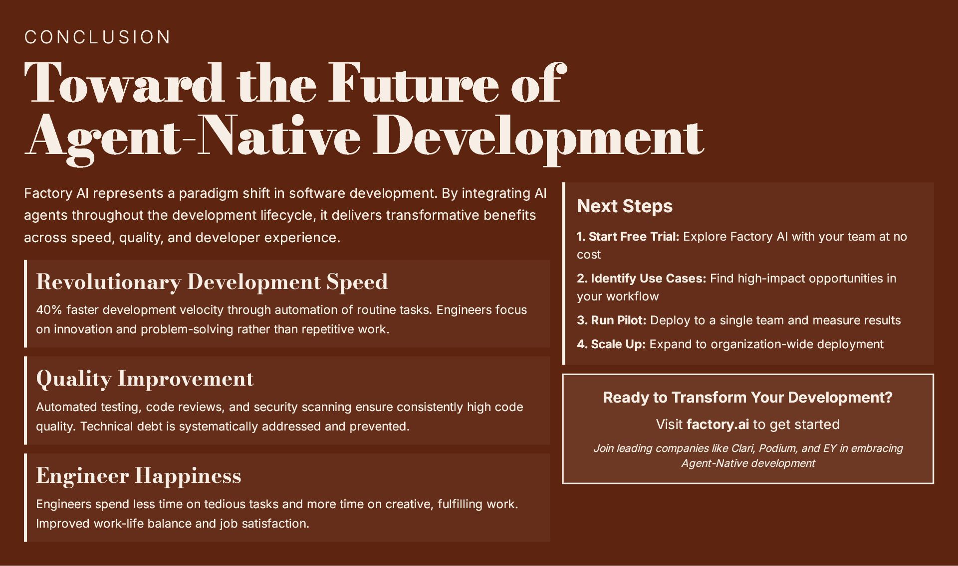 This 19-slide presentation explores Factory AI, an agent-native software development platform featuring four specialized Droids (Code, Reliability, Knowledge, and Tutorial) that integrate seamlessly into existing workflows. It examines core technologies including planning and task decomposition, HyperCode understanding, and ByteRank search optimization, distinguishing Factory AI from simple LLM wrappers. The presentation covers basic use cases (automated testing, code review, incident response) and advanced applications (multi-repo transformations, compliance gates, DroidShield security). Practical engineer tips address task granularity, context enrichment, CLI/CI integration, and model strategy. A three-way comparison with Devin AI and GitHub Copilot Workspace helps teams make informed decisions. The Clari case study demonstrates 40% development speed improvement, 60% review time reduction, and 70% technical debt resolution. The presentation concludes with enterprise-grade security (SOC 2 Type II, GDPR, HIPAA), a four-step implementation roadmap, and comprehensive support services.
