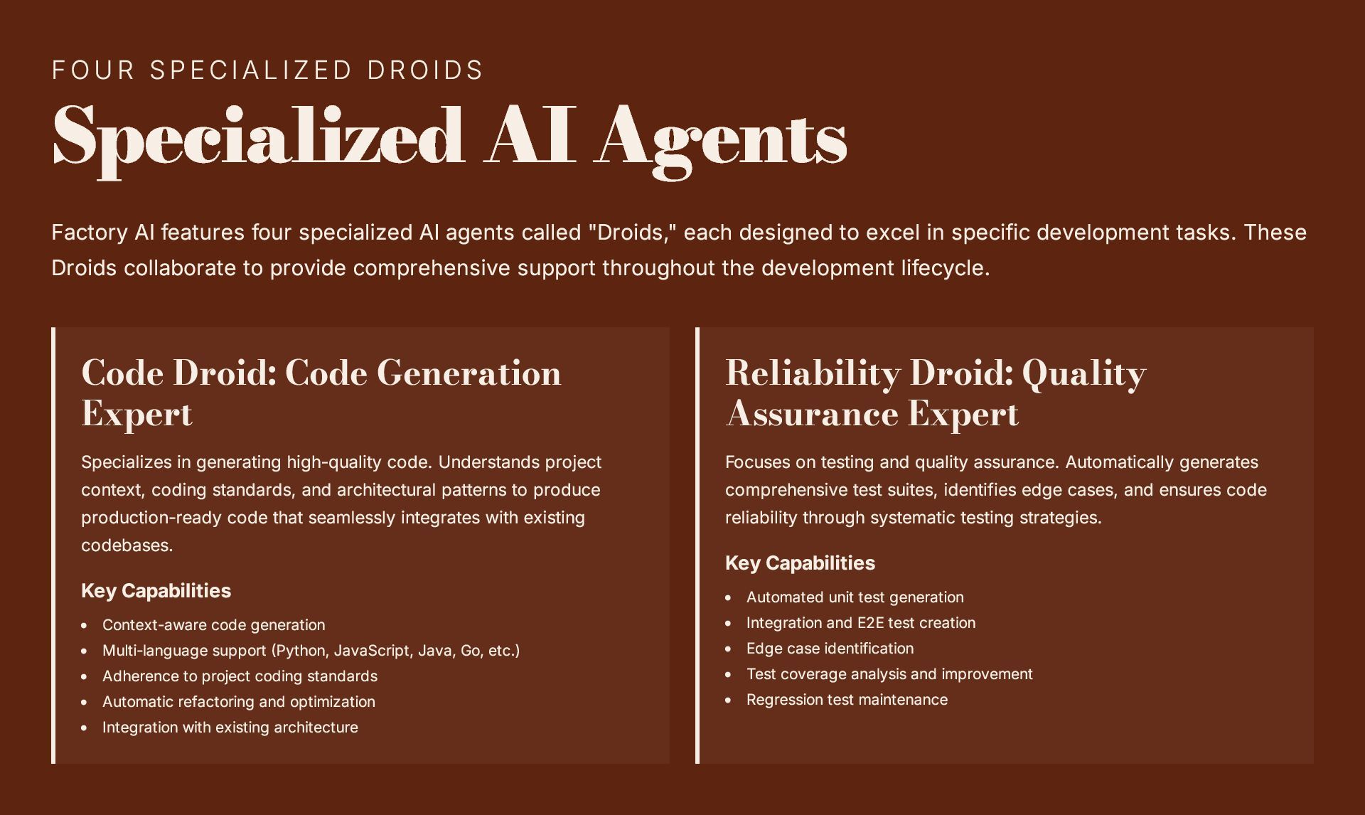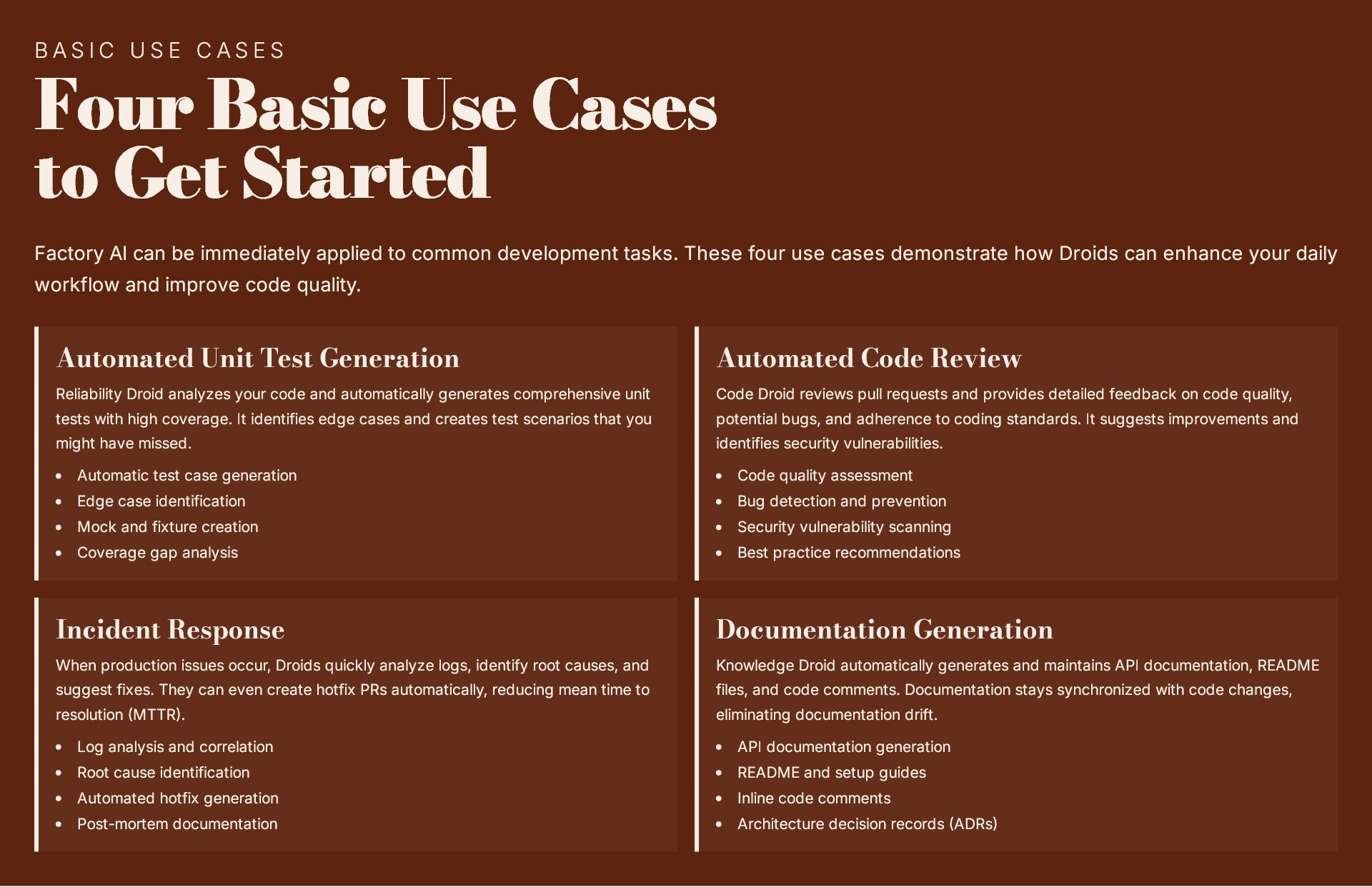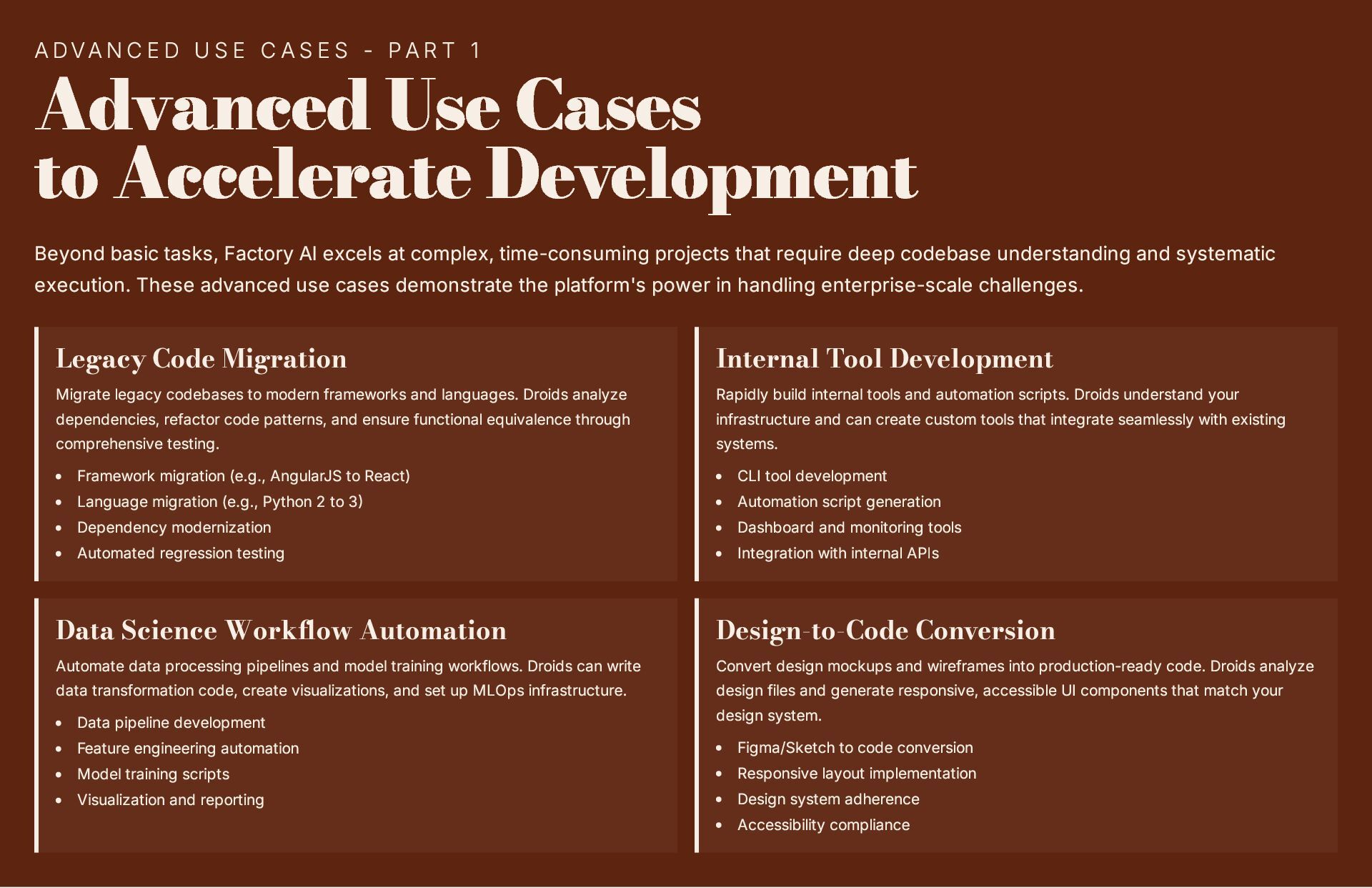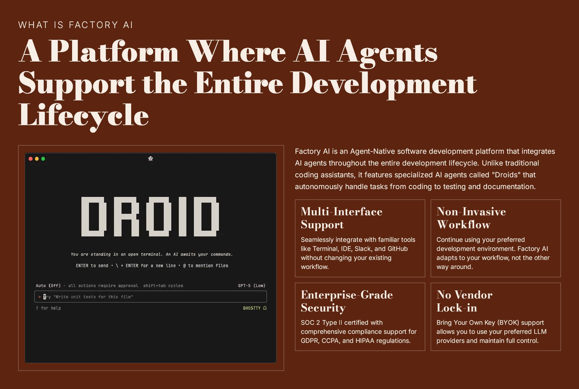 This 19-slide presentation explores Factory AI, an agent-native software development platform featuring four specialized Droids (Code, Reliability, Knowledge, and Tutorial) that integrate seamlessly into existing workflows. It examines core technologies including planning and task decomposition, HyperCode understanding, and ByteRank search optimization, distinguishing Factory AI from simple LLM wrappers. The presentation covers basic use cases (automated testing, code review, incident response) and advanced applications (multi-repo transformations, compliance gates, DroidShield security). Practical engineer tips address task granularity, context enrichment, CLI/CI integration, and model strategy. A three-way comparison with Devin AI and GitHub Copilot Workspace helps teams make informed decisions. The Clari case study demonstrates 40% development speed improvement, 60% review time reduction, and 70% technical debt resolution. The presentation concludes with enterprise-grade security (SOC 2 Type II, GDPR, HIPAA), a four-step implementation roadmap, and comprehensive support services.