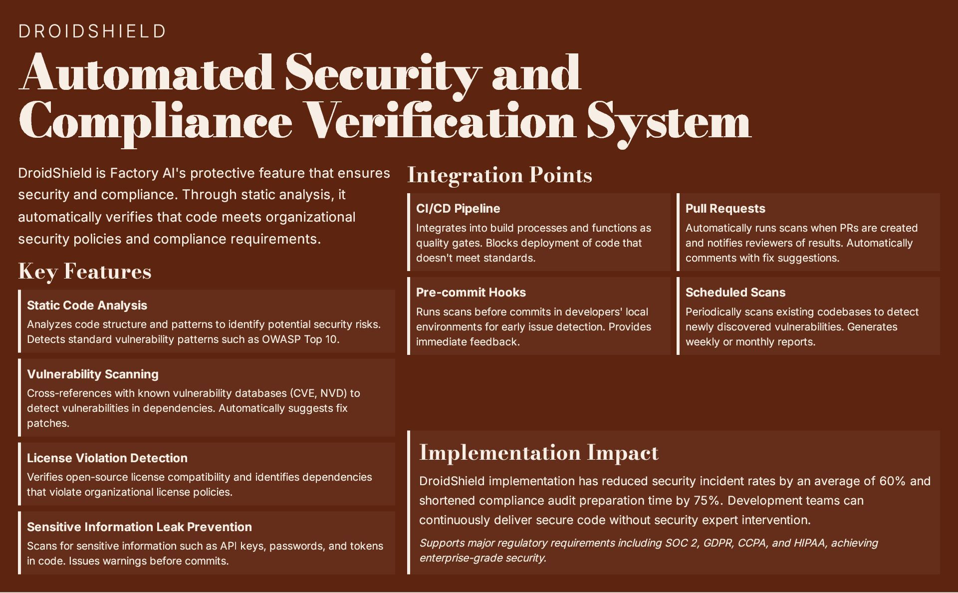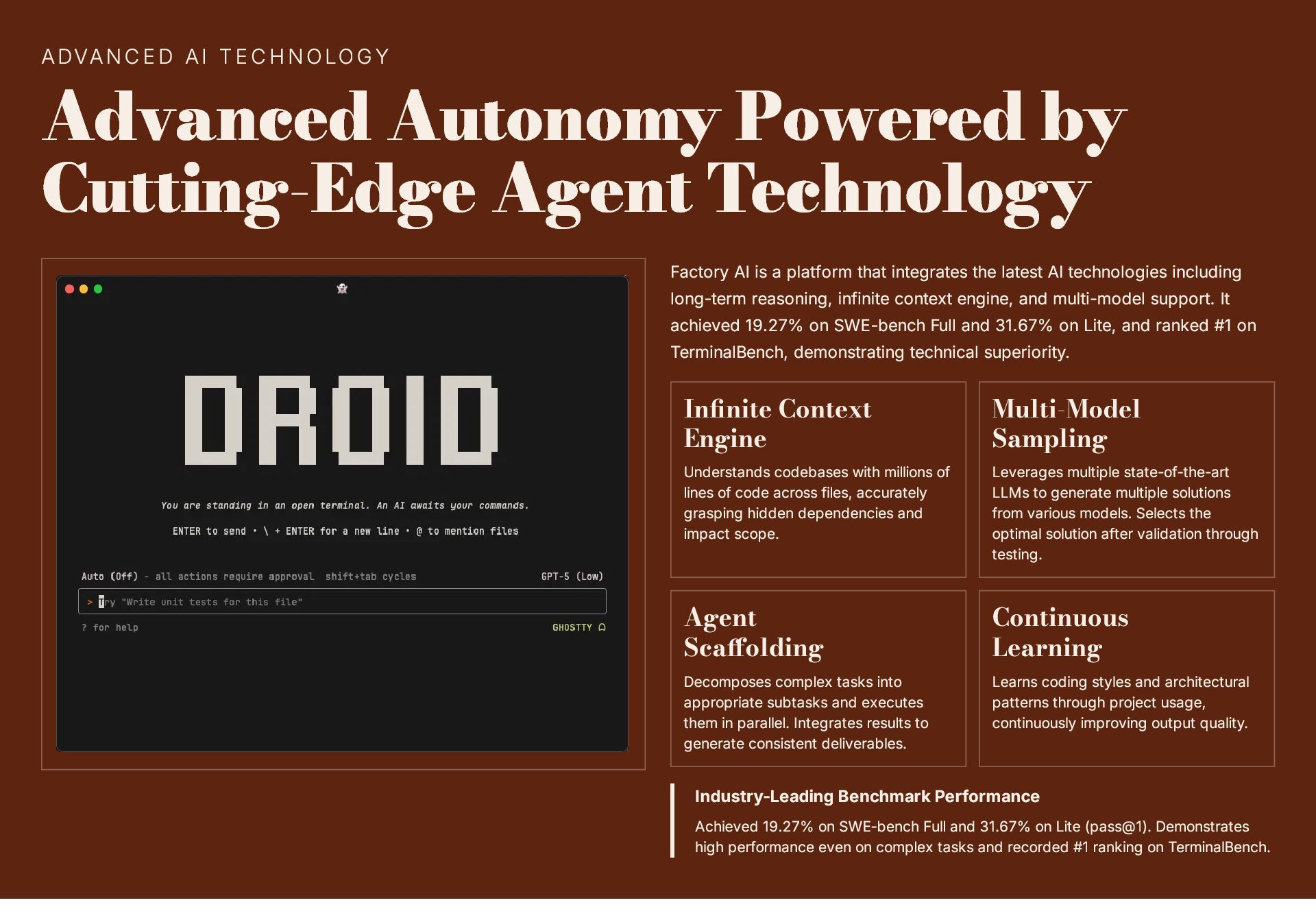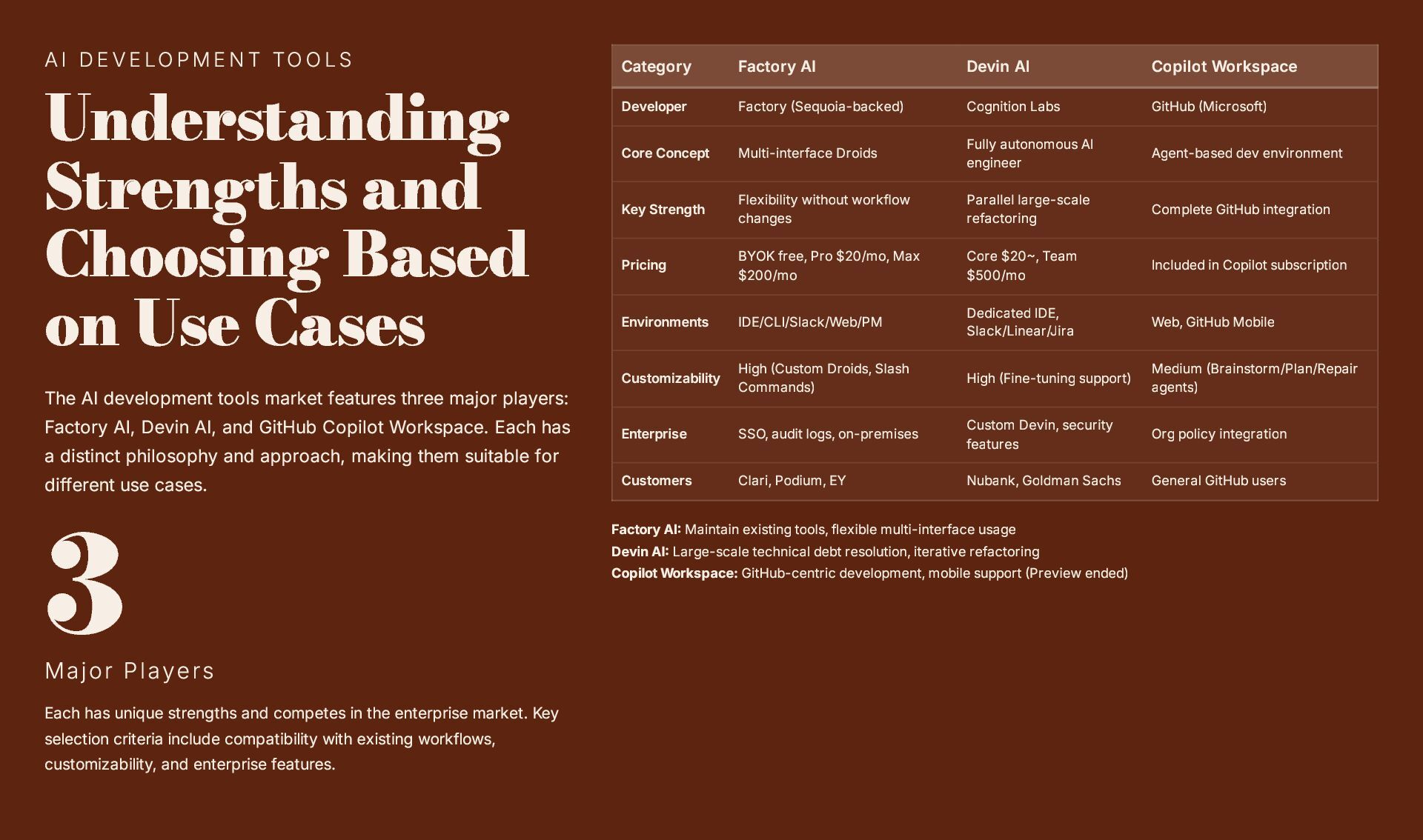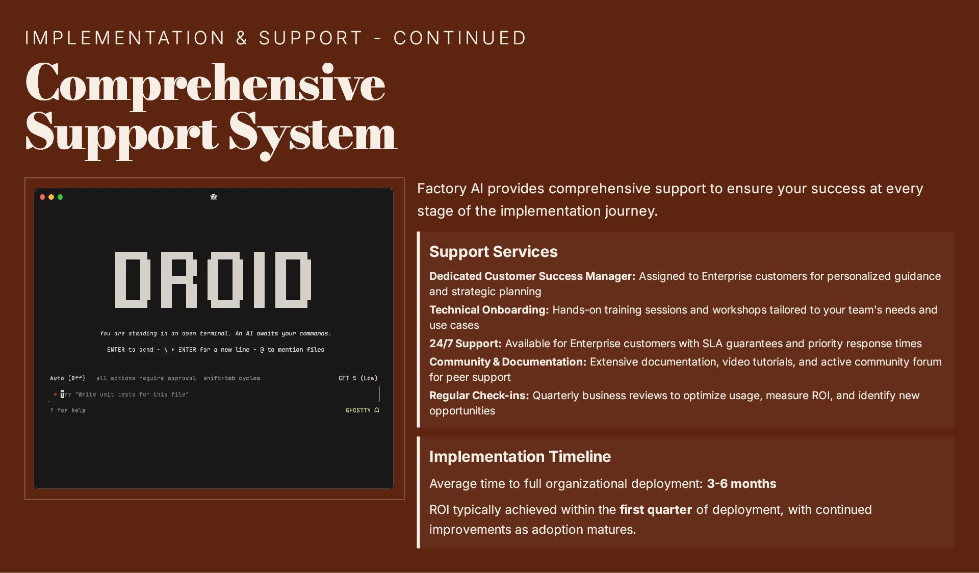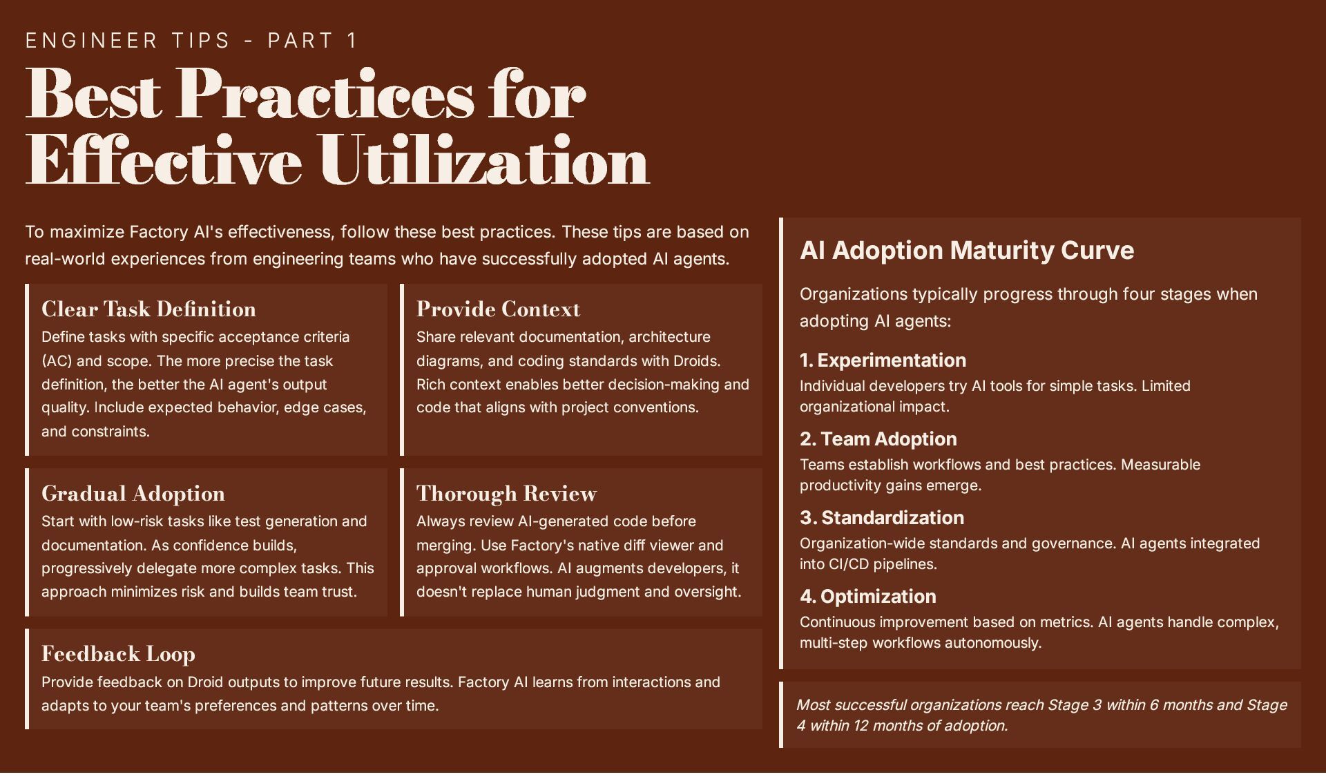 This 19-slide presentation explores Factory AI, an agent-native software development platform featuring four specialized Droids (Code, Reliability, Knowledge, and Tutorial) that integrate seamlessly into existing workflows. It examines core technologies including planning and task decomposition, HyperCode understanding, and ByteRank search optimization, distinguishing Factory AI from simple LLM wrappers. The presentation covers basic use cases (automated testing, code review, incident response) and advanced applications (multi-repo transformations, compliance gates, DroidShield security). Practical engineer tips address task granularity, context enrichment, CLI/CI integration, and model strategy. A three-way comparison with Devin AI and GitHub Copilot Workspace helps teams make informed decisions. The Clari case study demonstrates 40% development speed improvement, 60% review time reduction, and 70% technical debt resolution. The presentation concludes with enterprise-grade security (SOC 2 Type II, GDPR, HIPAA), a four-step implementation roadmap, and comprehensive support services.