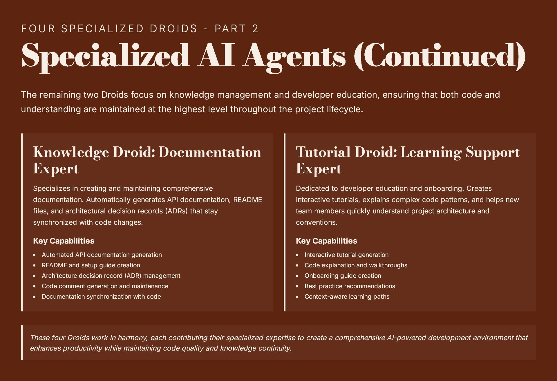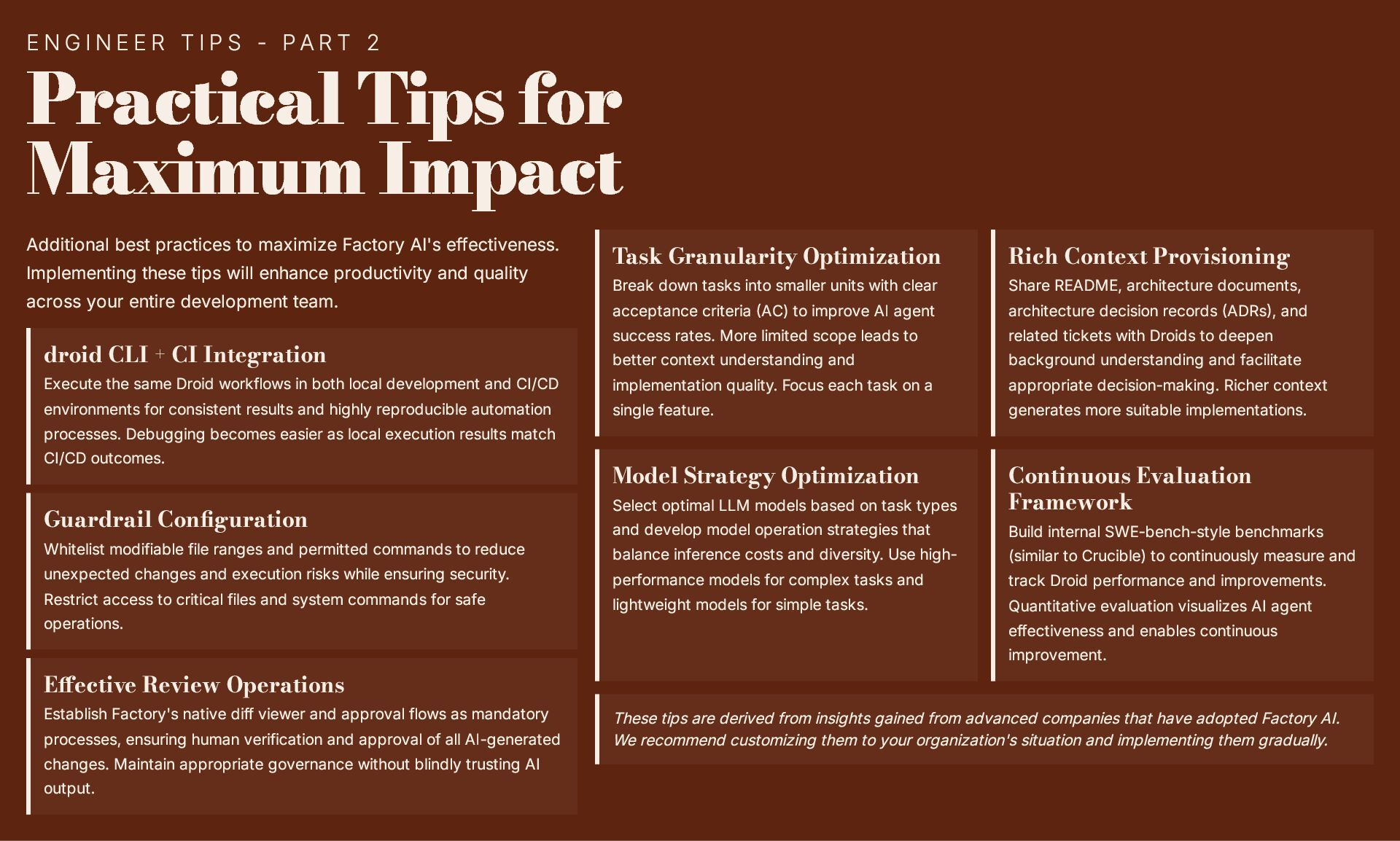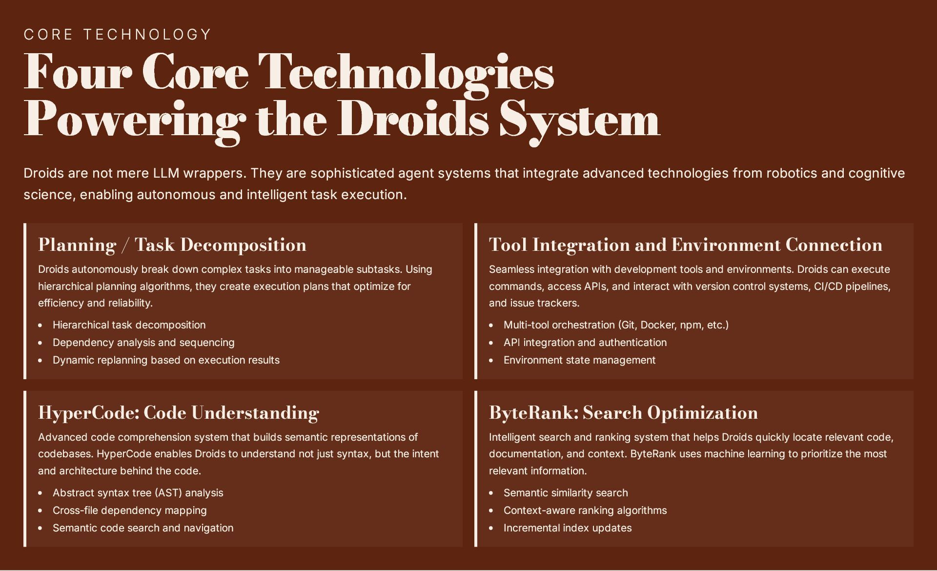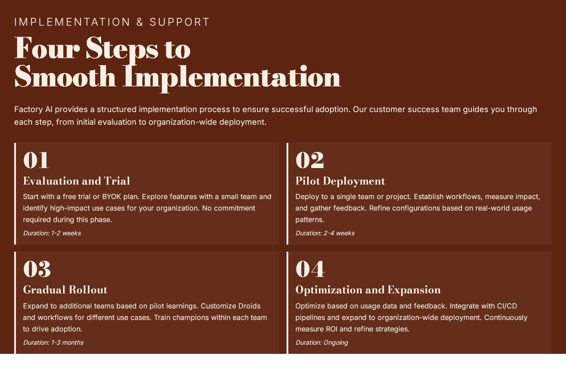 This 19-slide presentation explores Factory AI, an agent-native software development platform featuring four specialized Droids (Code, Reliability, Knowledge, and Tutorial) that integrate seamlessly into existing workflows. It examines core technologies including planning and task decomposition, HyperCode understanding, and ByteRank search optimization, distinguishing Factory AI from simple LLM wrappers. The presentation covers basic use cases (automated testing, code review, incident response) and advanced applications (multi-repo transformations, compliance gates, DroidShield security). Practical engineer tips address task granularity, context enrichment, CLI/CI integration, and model strategy. A three-way comparison with Devin AI and GitHub Copilot Workspace helps teams make informed decisions. The Clari case study demonstrates 40% development speed improvement, 60% review time reduction, and 70% technical debt resolution. The presentation concludes with enterprise-grade security (SOC 2 Type II, GDPR, HIPAA), a four-step implementation roadmap, and comprehensive support services.