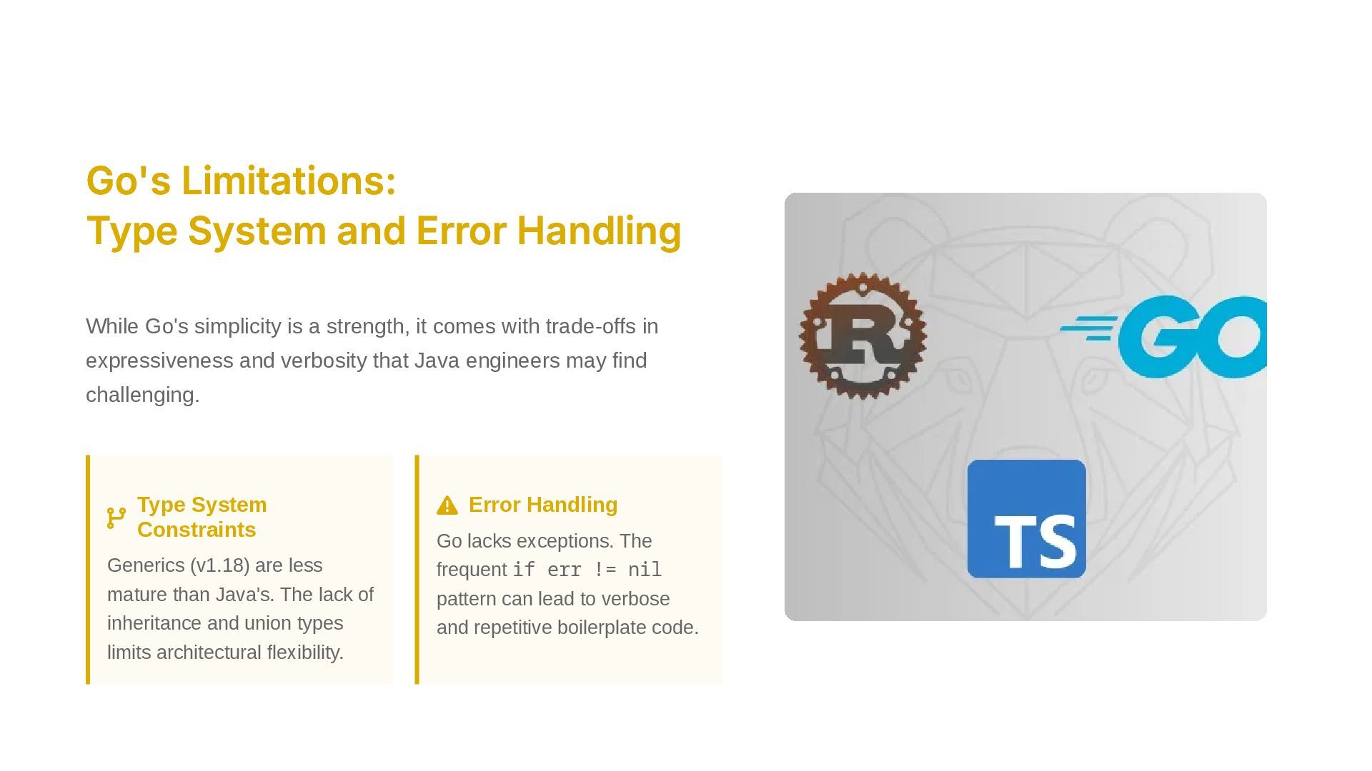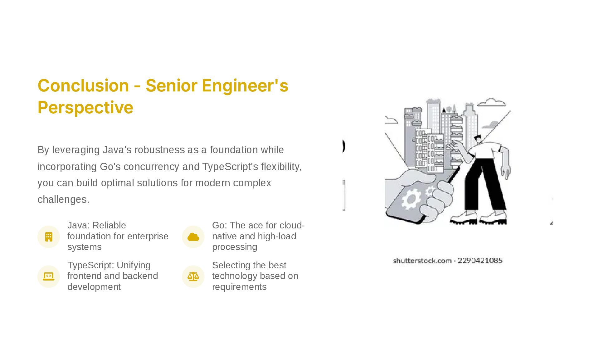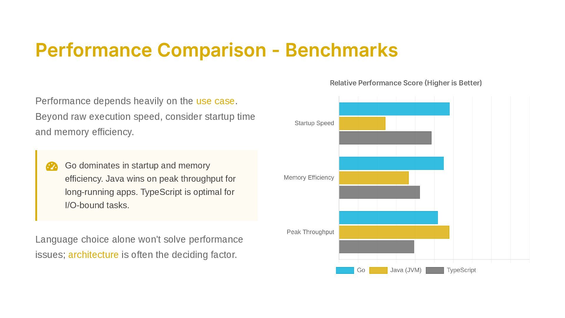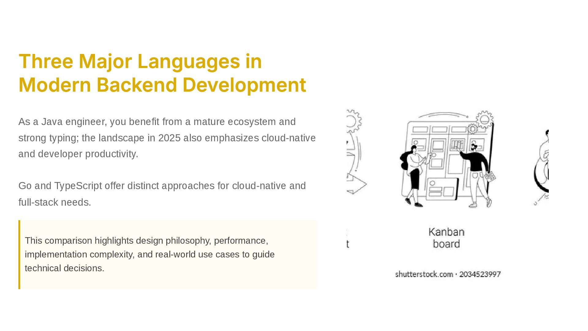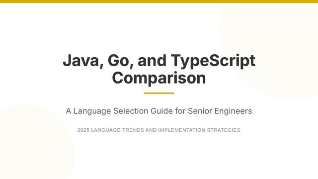 This presentation guides senior Java engineers in comparing Java, Go, and TypeScript for modern backend development. It analyzes Java's robust ecosystem, Go's concurrency and simplicity, and TypeScript's flexibility. By examining performance and use cases, it provides strategic insights for selecting the right language for enterprise, cloud-native, or rapid development scenarios.