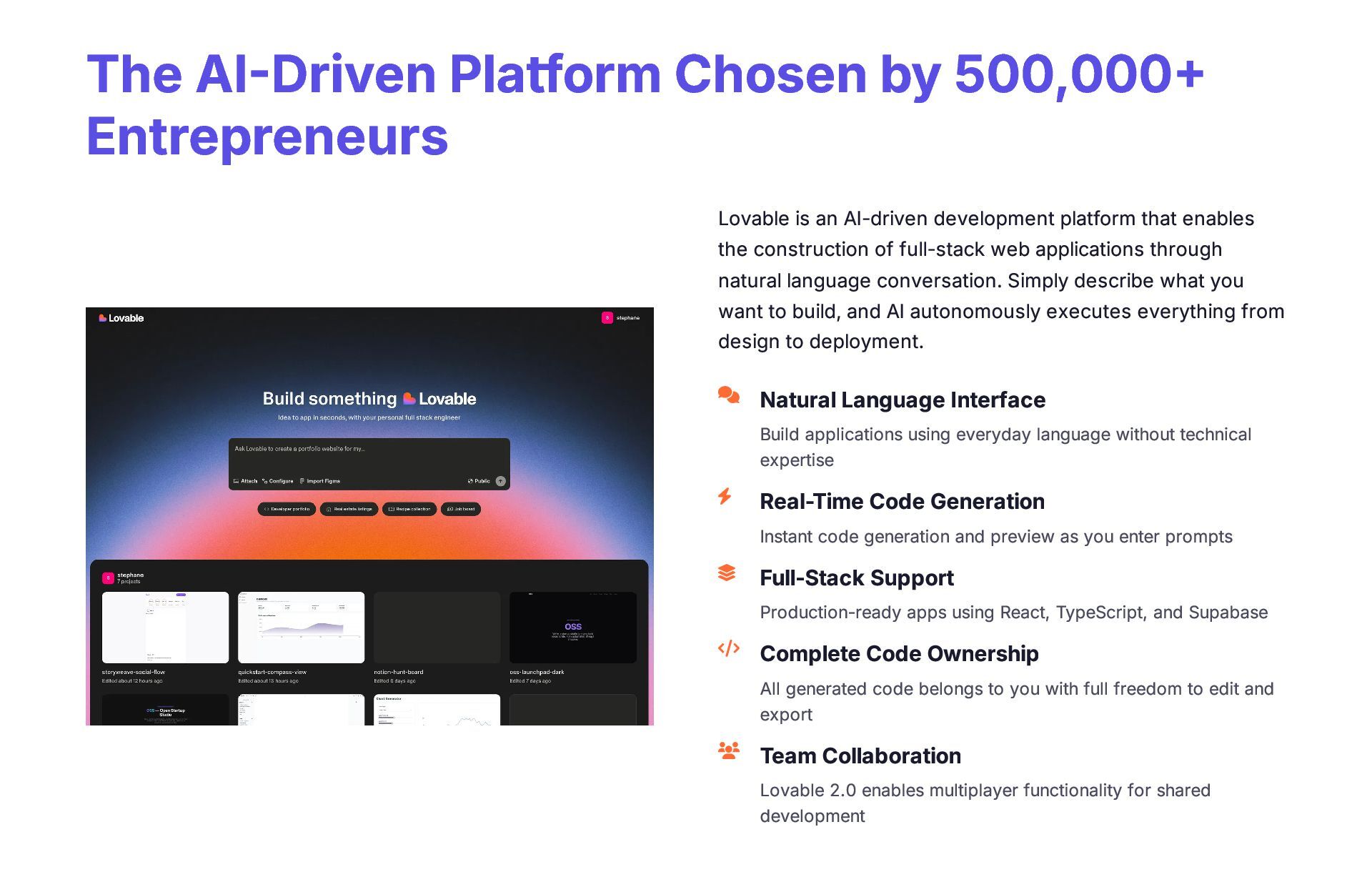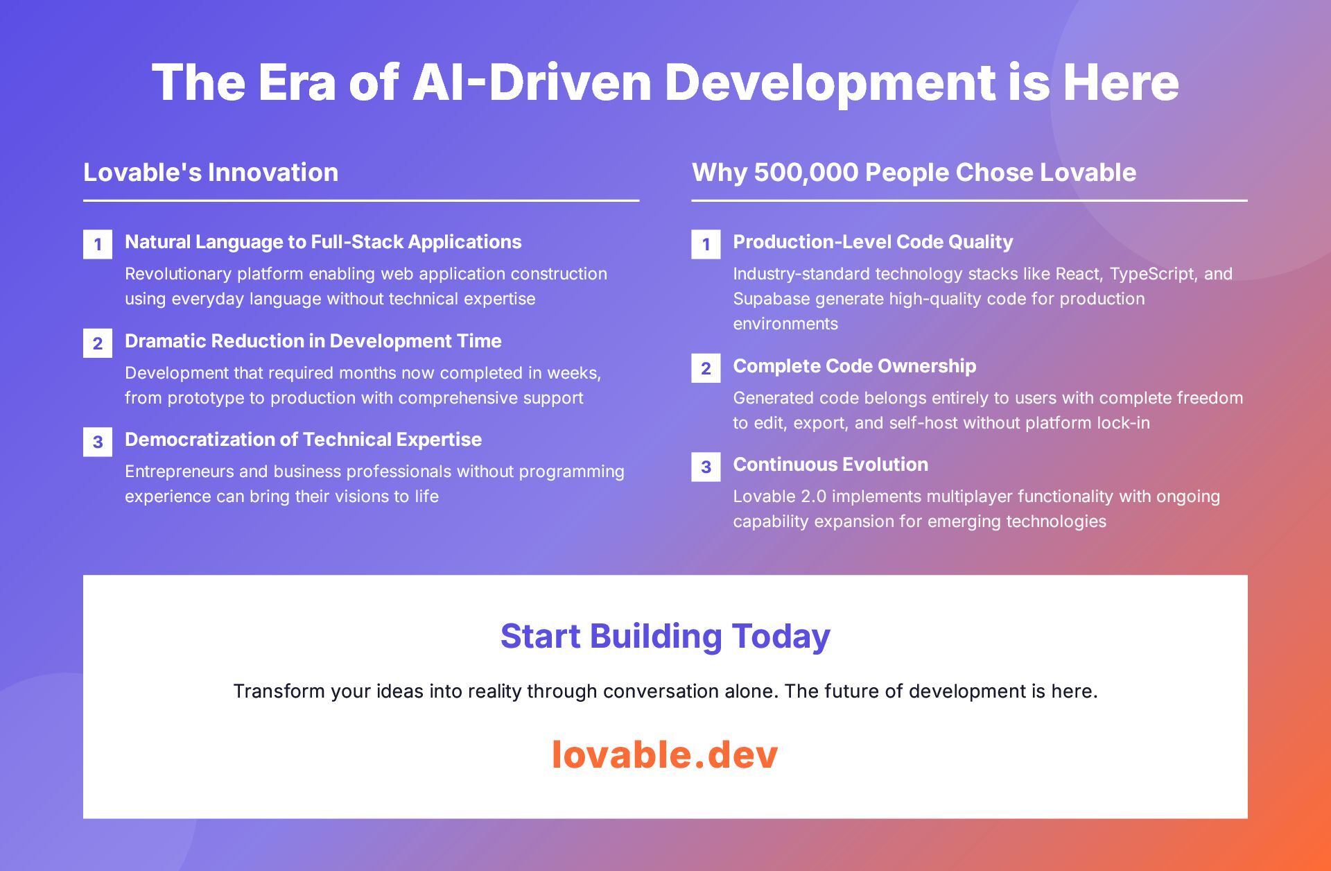 This comprehensive presentation introduces Lovable, an AI-powered development platform that enables users to build full-stack web applications through natural language conversation, without writing code. With over 500,000 active users and $50M+ raised by Lovable-built apps, it represents a revolutionary approach to software development.