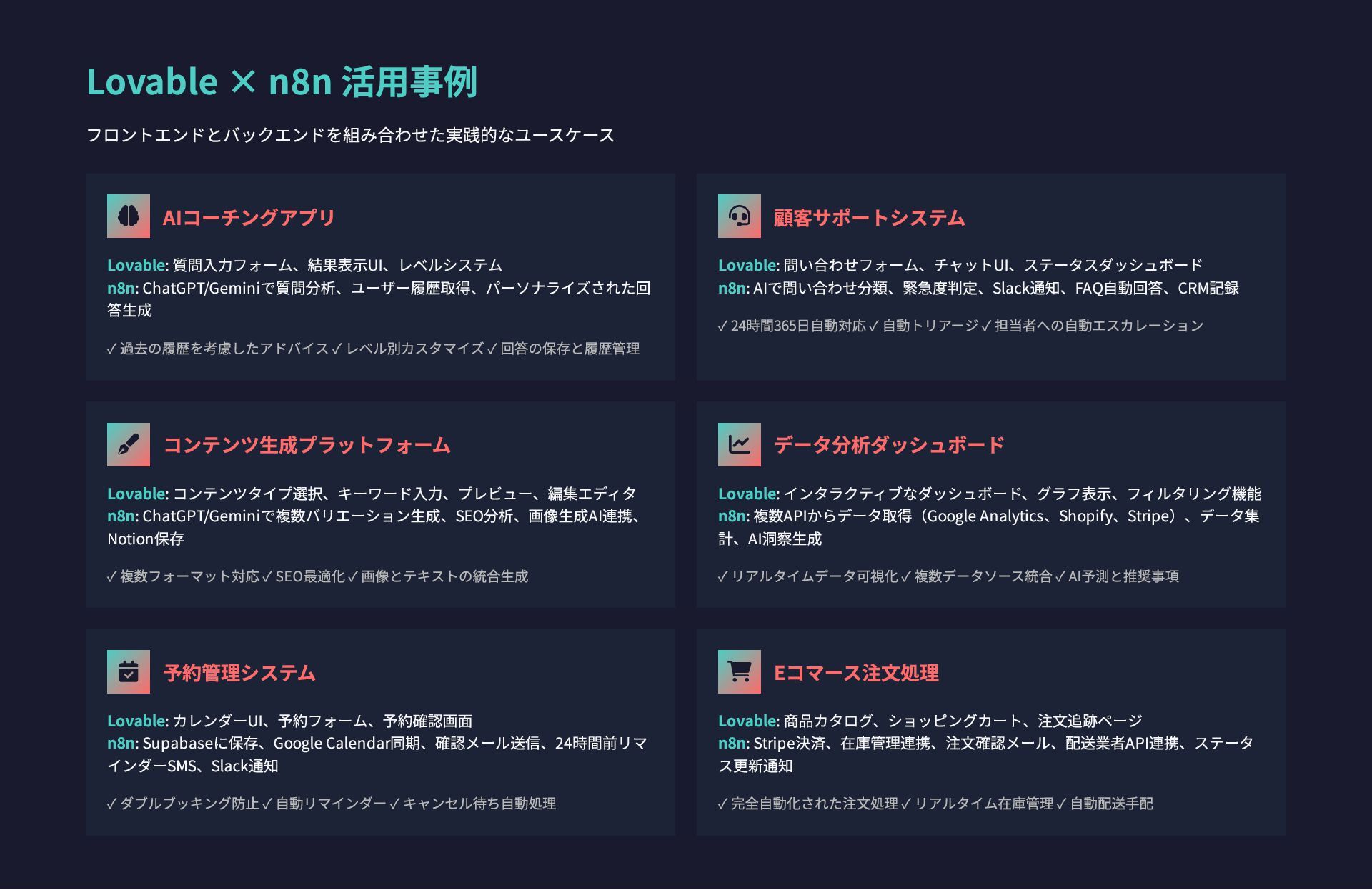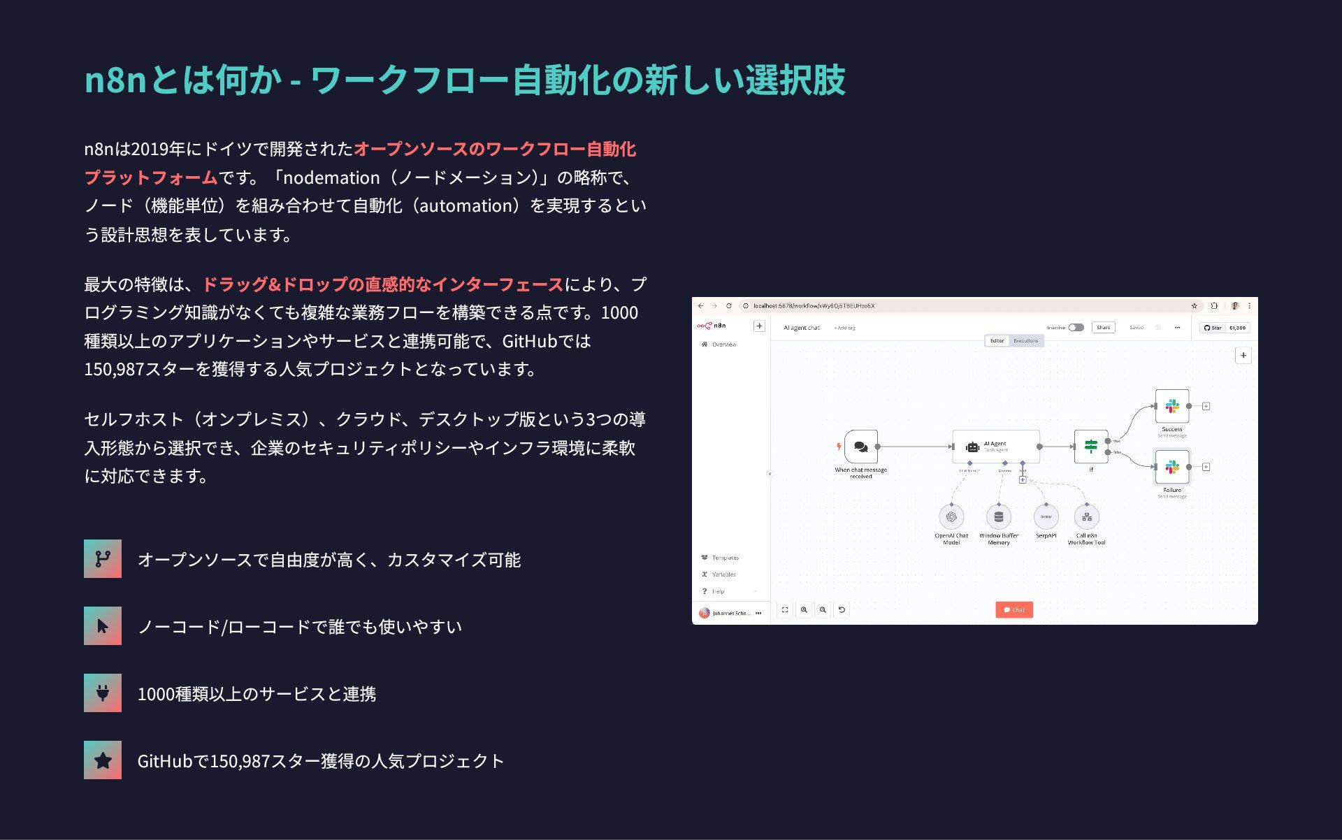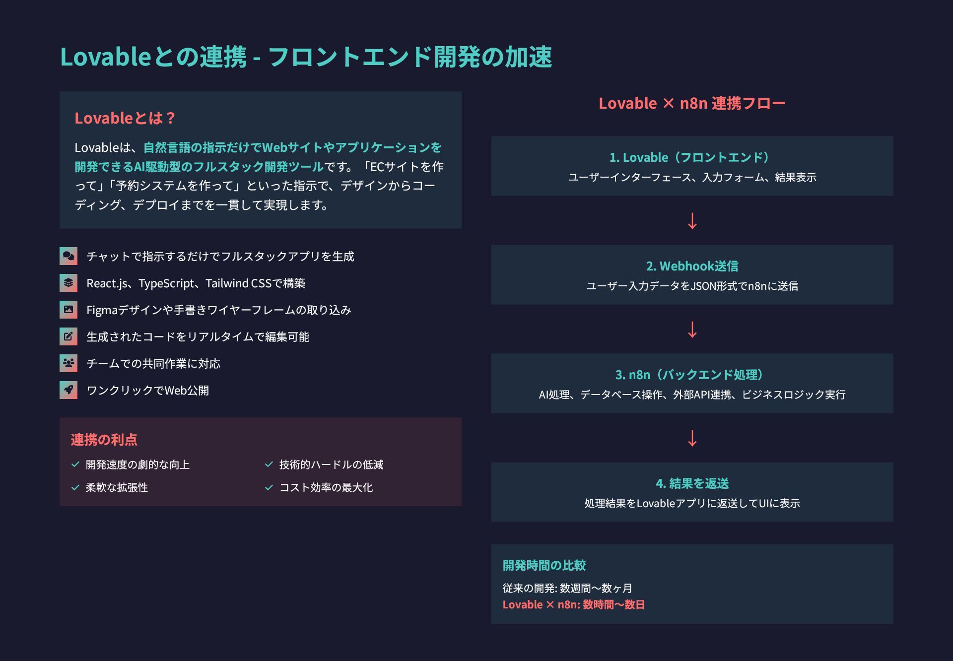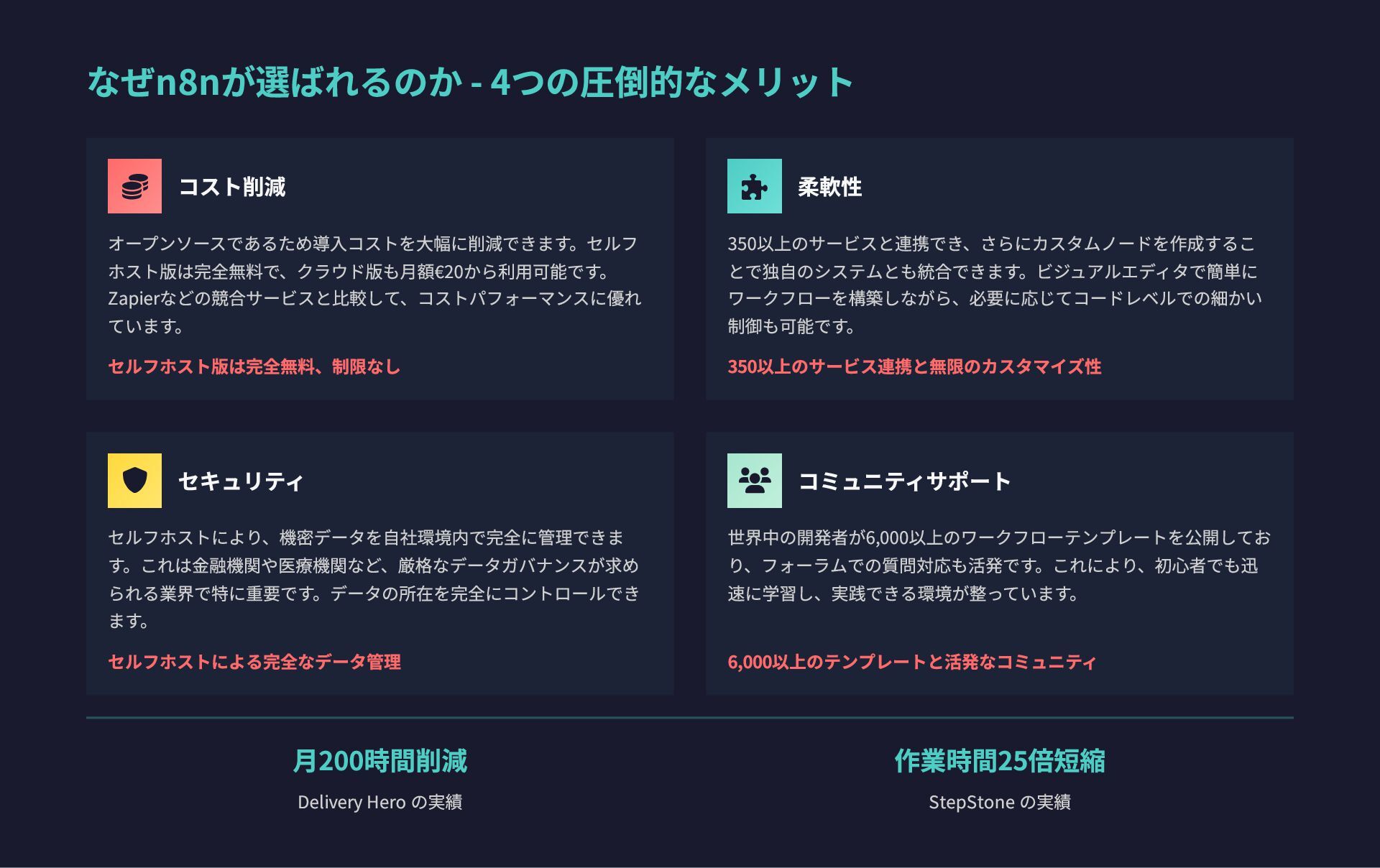 n8nは、2019年にドイツで開発されたオープンソースのワークフロー自動化プラットフォームで、「nodemation」(ノード+自動化)の設計思想に基づき、ドラッグ&ドロップの直感的なインターフェースを通じて、プログラミング知識がなくても1,000種類以上のサービスと連携した複雑な業務フローを構築できます。セルフホスト版は完全無料で、ZapierやMakeなどの競合と比較して優れたコストパフォーマンスとデータ主権を提供し、IT運用、セキュリティ、営業・マーケティング、バックオフィスなどの定型業務を自動化するだけでなく、ChatGPTやGeminiとのAI連携により24時間カスタマーサポート、レビュー分析、コンテンツ生成などの知的な業務処理も実現します。さらにLovableとの連携により、フロントエンド開発を加速し、AIコーチングアプリや予約管理システム、Eコマース注文処理など数時間から数日で構築可能で、実際にDelivery Heroの月200時間削減やStepStoneの作業時間25倍短縮といった成果を上げており、小規模なユースケースから始めて段階的に拡大していくアプローチで業務自動化の未来を実現できる次世代プラットフォームです。