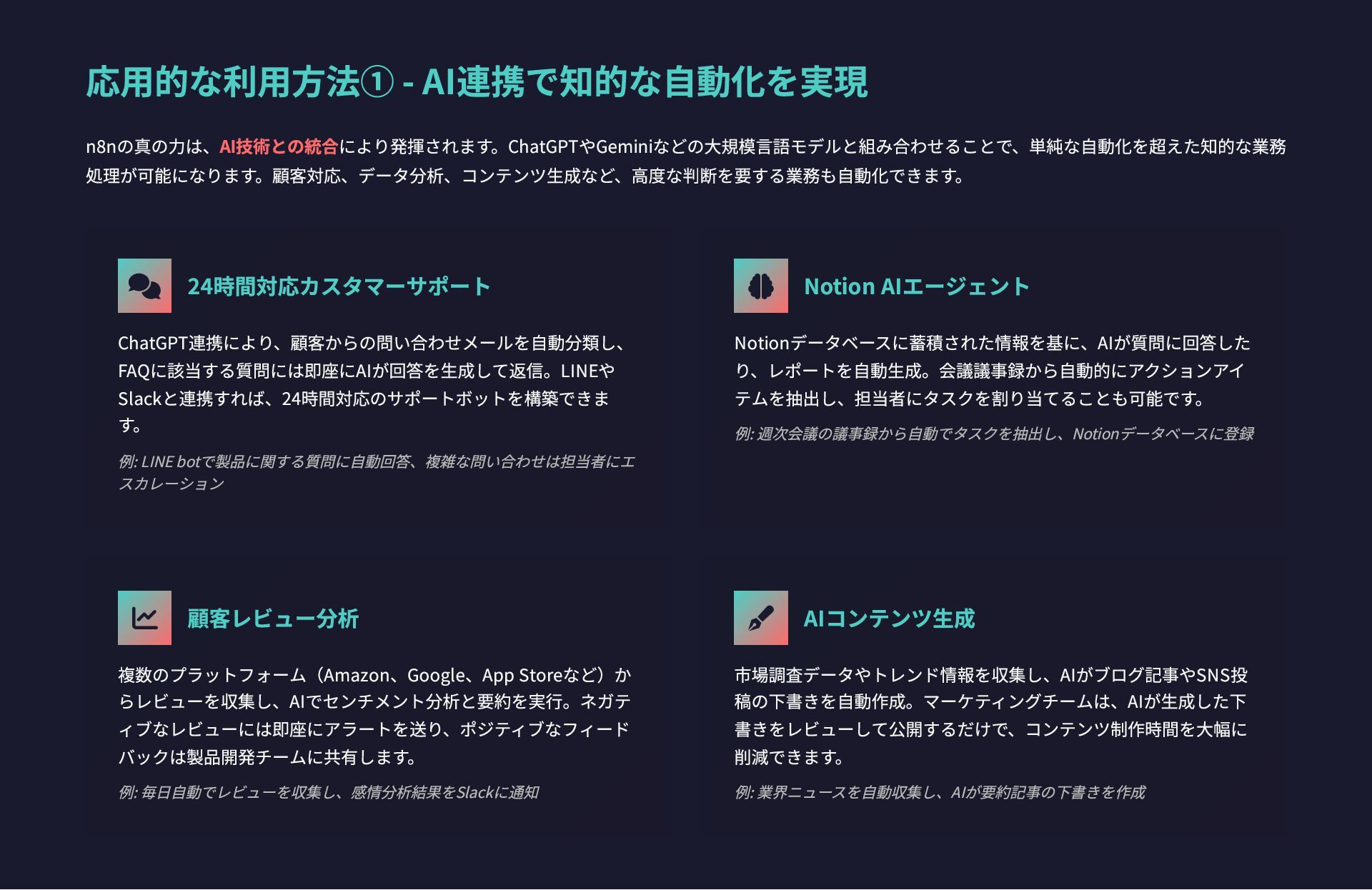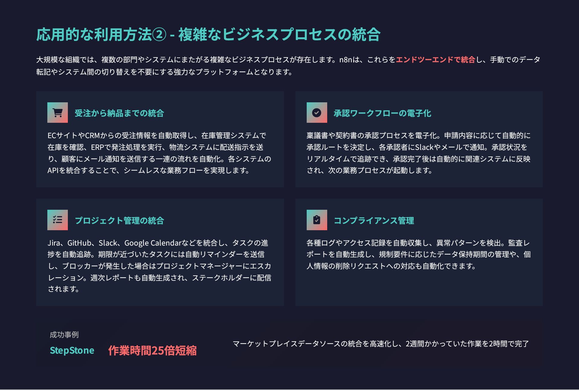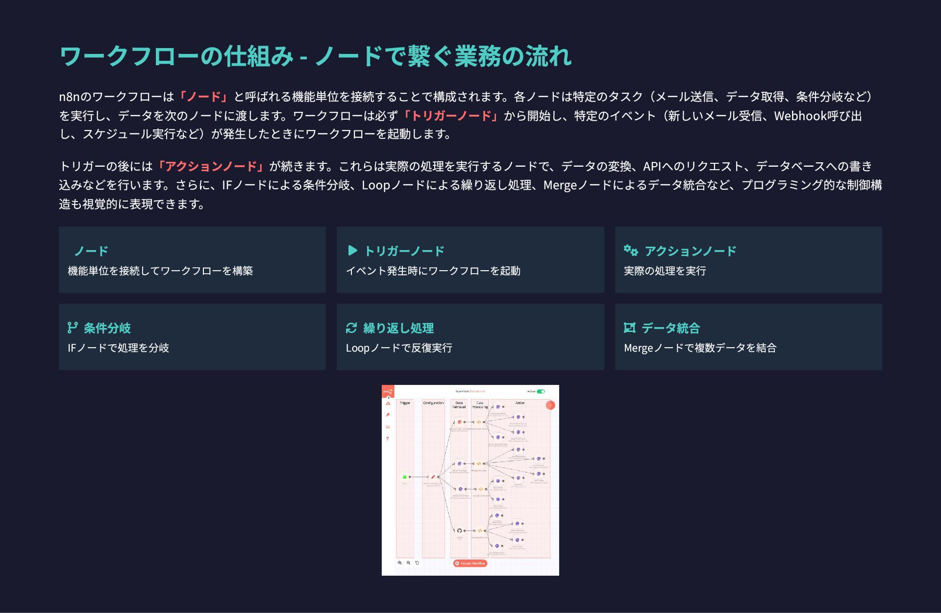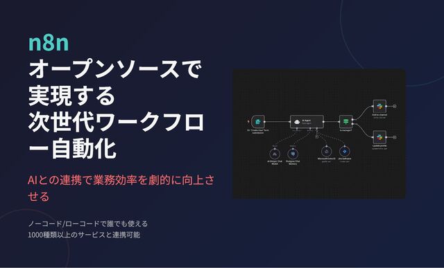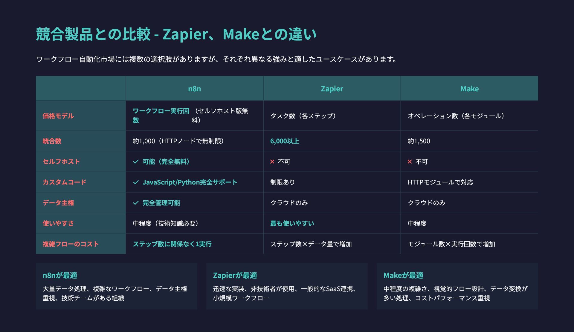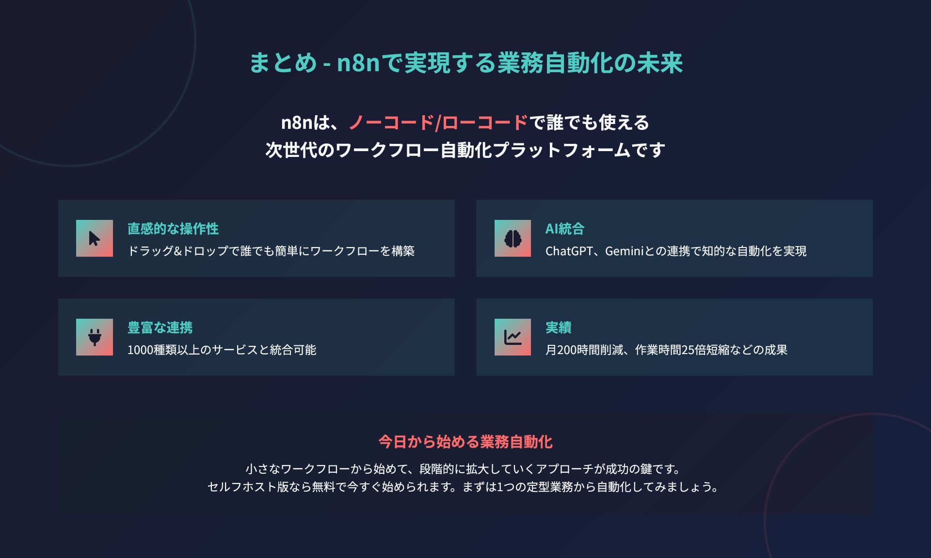 n8nは、2019年にドイツで開発されたオープンソースのワークフロー自動化プラットフォームで、「nodemation」(ノード+自動化)の設計思想に基づき、ドラッグ&ドロップの直感的なインターフェースを通じて、プログラミング知識がなくても1,000種類以上のサービスと連携した複雑な業務フローを構築できます。セルフホスト版は完全無料で、ZapierやMakeなどの競合と比較して優れたコストパフォーマンスとデータ主権を提供し、IT運用、セキュリティ、営業・マーケティング、バックオフィスなどの定型業務を自動化するだけでなく、ChatGPTやGeminiとのAI連携により24時間カスタマーサポート、レビュー分析、コンテンツ生成などの知的な業務処理も実現します。さらにLovableとの連携により、フロントエンド開発を加速し、AIコーチングアプリや予約管理システム、Eコマース注文処理など数時間から数日で構築可能で、実際にDelivery Heroの月200時間削減やStepStoneの作業時間25倍短縮といった成果を上げており、小規模なユースケースから始めて段階的に拡大していくアプローチで業務自動化の未来を実現できる次世代プラットフォームです。
