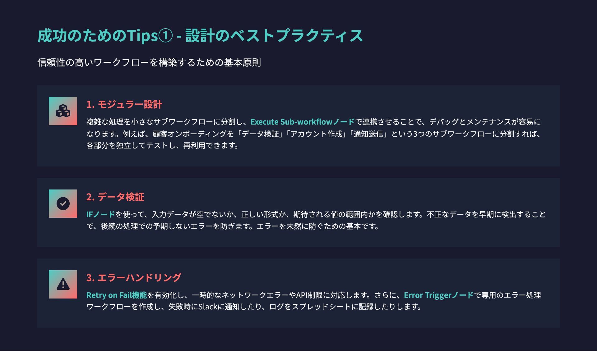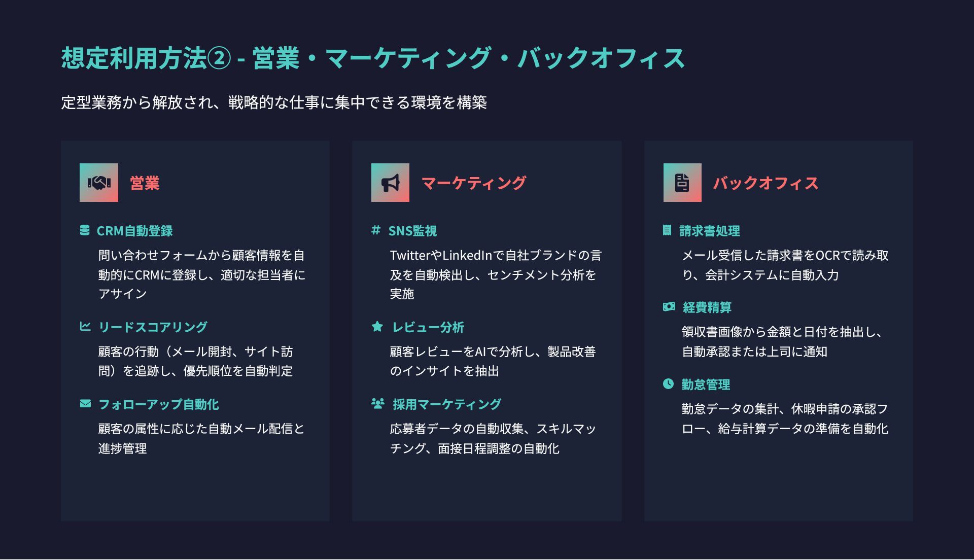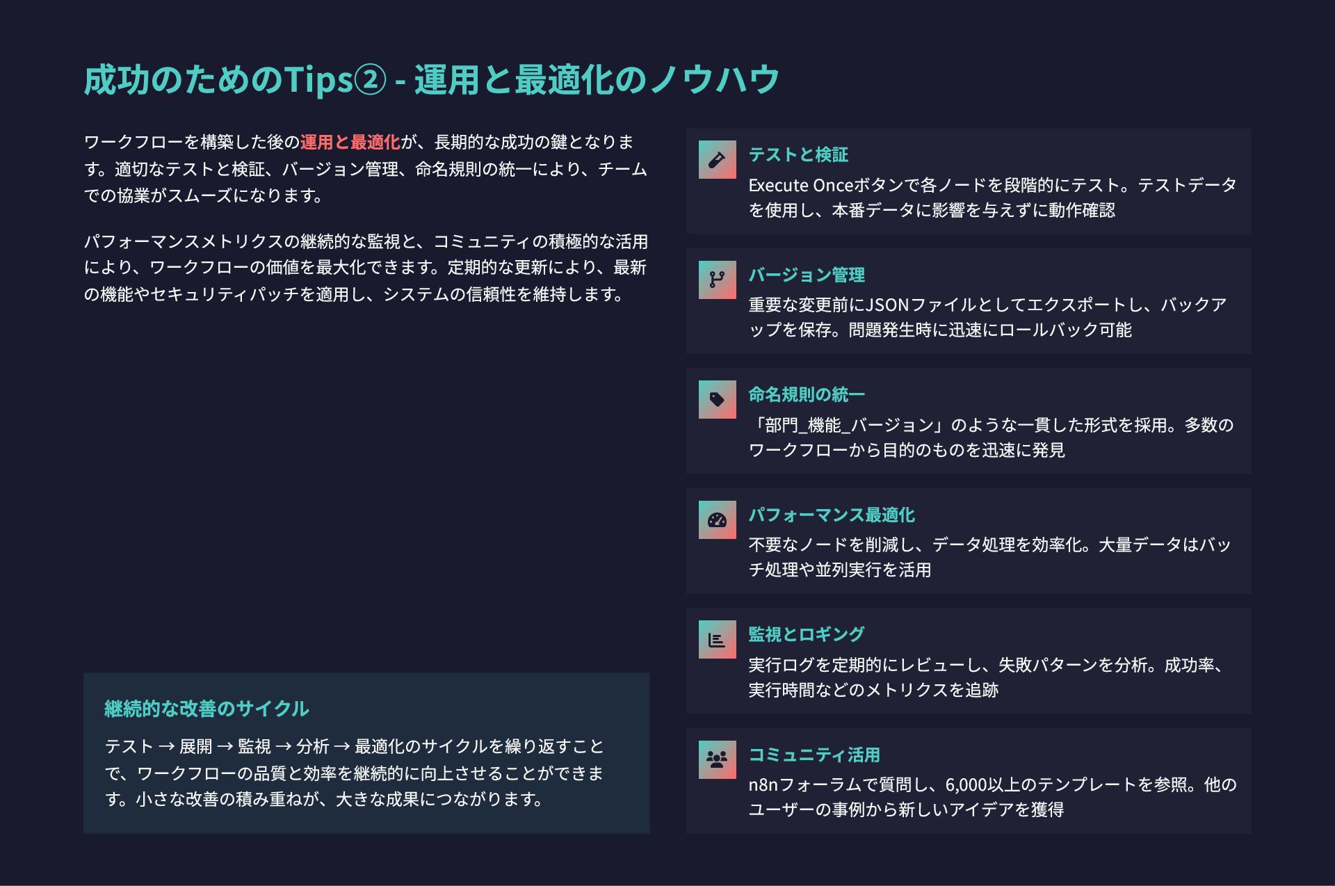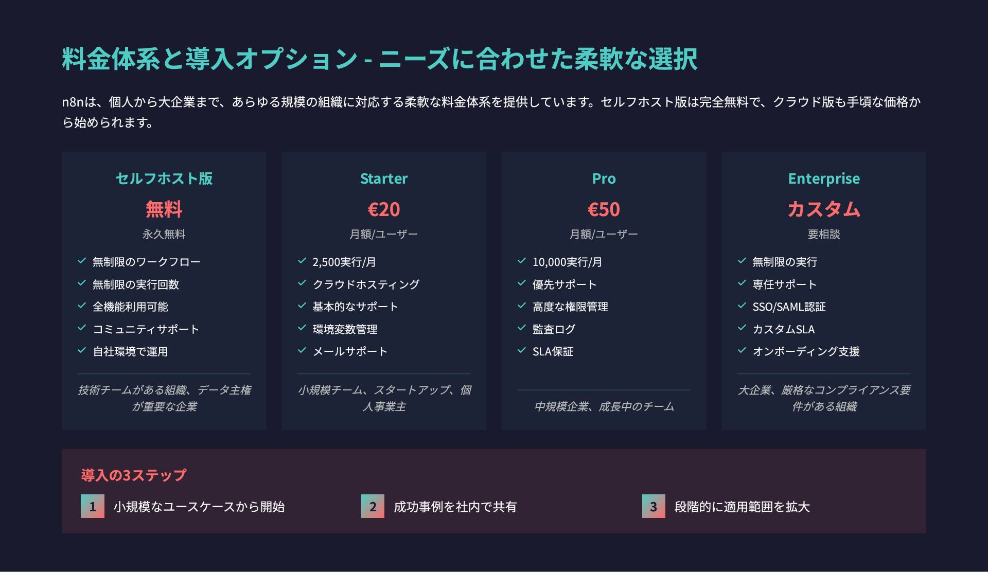 n8nは、2019年にドイツで開発されたオープンソースのワークフロー自動化プラットフォームで、「nodemation」(ノード+自動化)の設計思想に基づき、ドラッグ&ドロップの直感的なインターフェースを通じて、プログラミング知識がなくても1,000種類以上のサービスと連携した複雑な業務フローを構築できます。セルフホスト版は完全無料で、ZapierやMakeなどの競合と比較して優れたコストパフォーマンスとデータ主権を提供し、IT運用、セキュリティ、営業・マーケティング、バックオフィスなどの定型業務を自動化するだけでなく、ChatGPTやGeminiとのAI連携により24時間カスタマーサポート、レビュー分析、コンテンツ生成などの知的な業務処理も実現します。さらにLovableとの連携により、フロントエンド開発を加速し、AIコーチングアプリや予約管理システム、Eコマース注文処理など数時間から数日で構築可能で、実際にDelivery Heroの月200時間削減やStepStoneの作業時間25倍短縮といった成果を上げており、小規模なユースケースから始めて段階的に拡大していくアプローチで業務自動化の未来を実現できる次世代プラットフォームです。