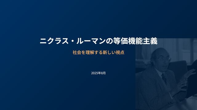このスライドは、社会学者ニクラス・ルーマンの「等価機能主義」をわかりやすく整理しています。まず、パーソンズらの従来の機能主義が、単線的な因果関係や「システム維持」を前提とし、機能の代替可能性や社会の柔軟性を十分に説明できない点を批判します。  そのうえで、ある社会問題に対して複数の「機能的に等価な」解決策があり得るという発想を提示し、入力と出力の対応を集合レベルで捉える関数的な考え方、複合性(可能性の総体)や非決定論的アプローチなどの概念を紹介します。これにより、社会の別様のあり方を想像し、多様な制度や実践を比較検討するための新しい視点を提供する理論として等価機能主義を位置づけています。