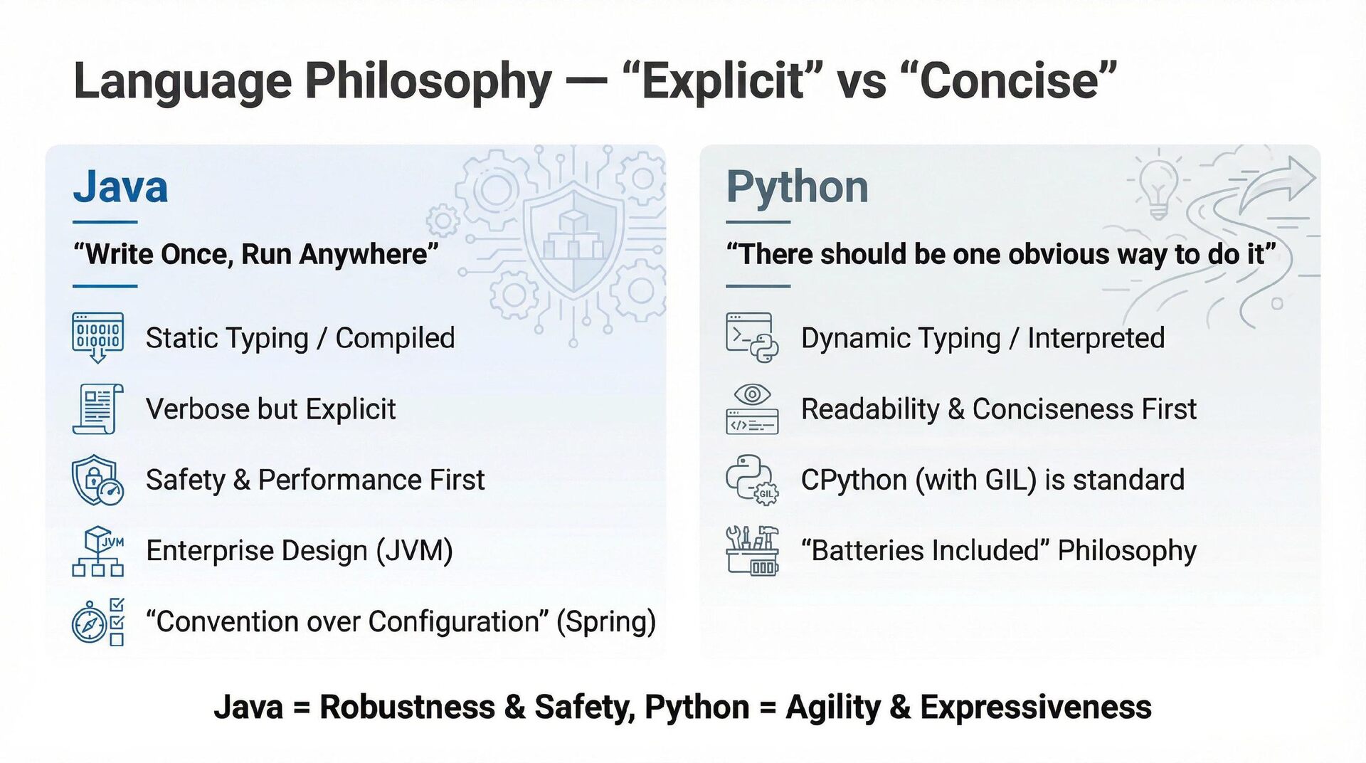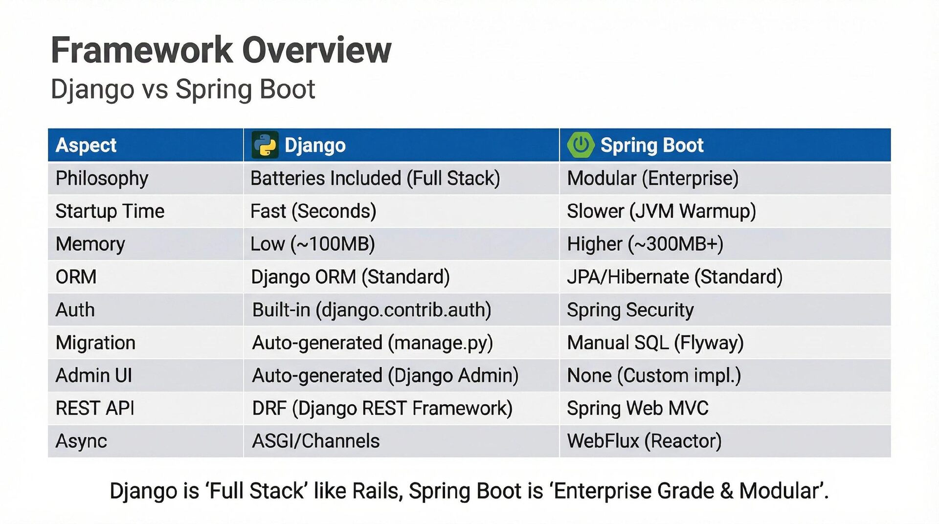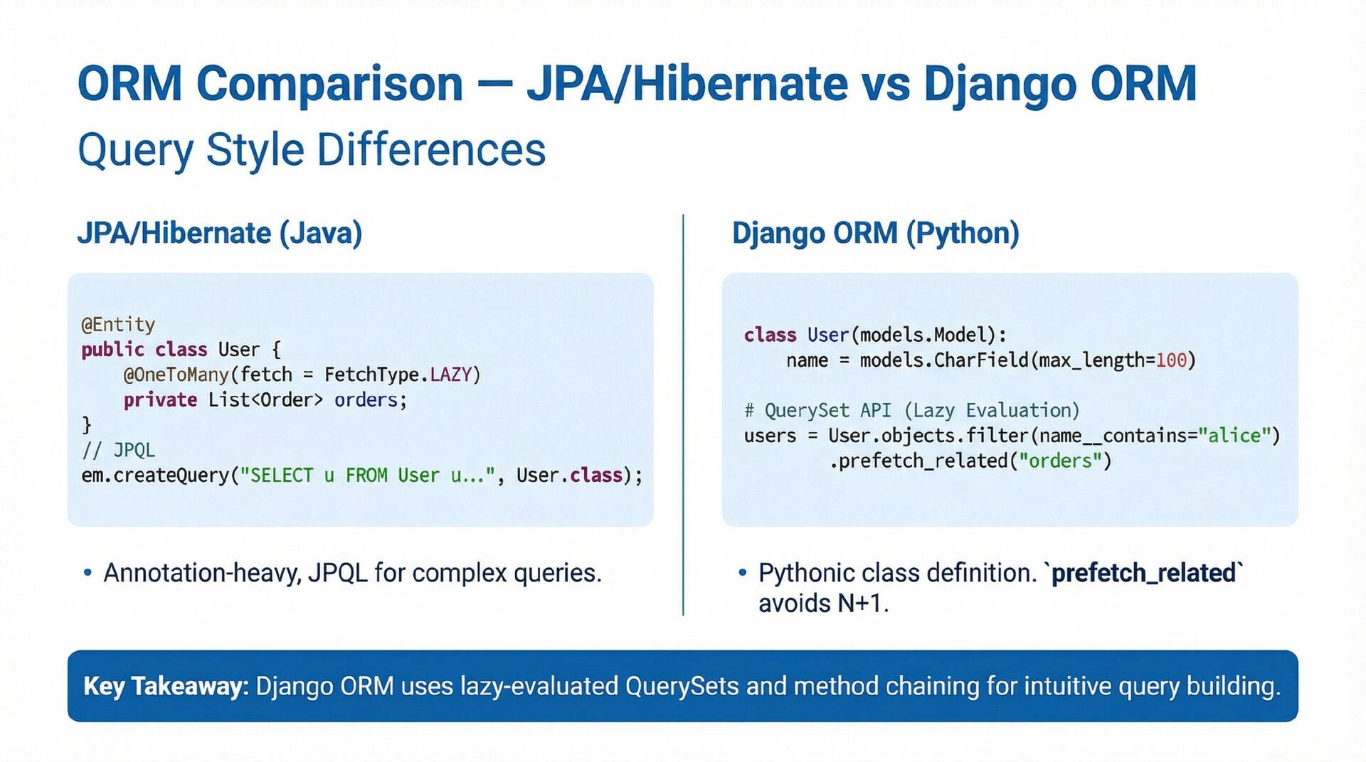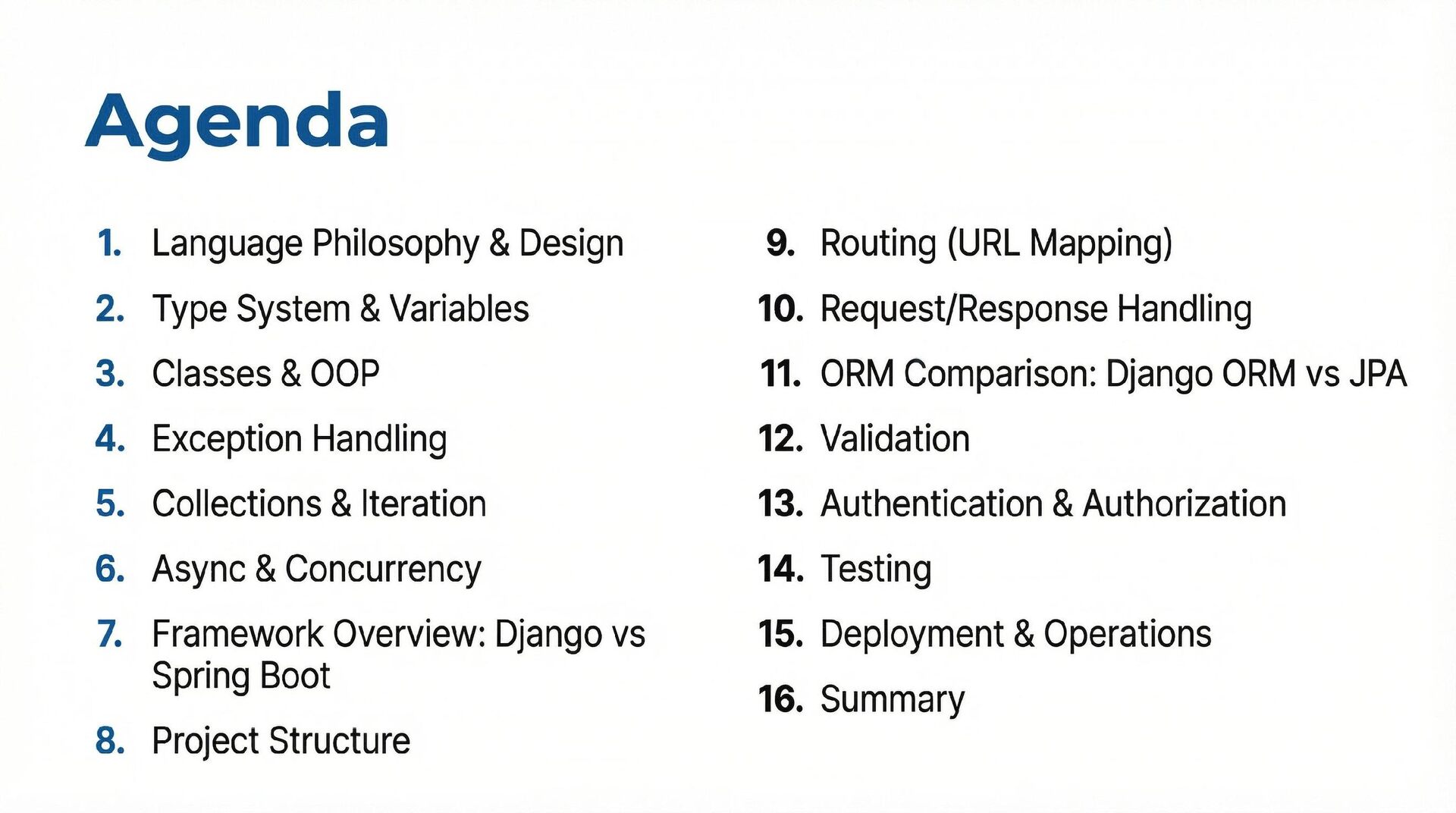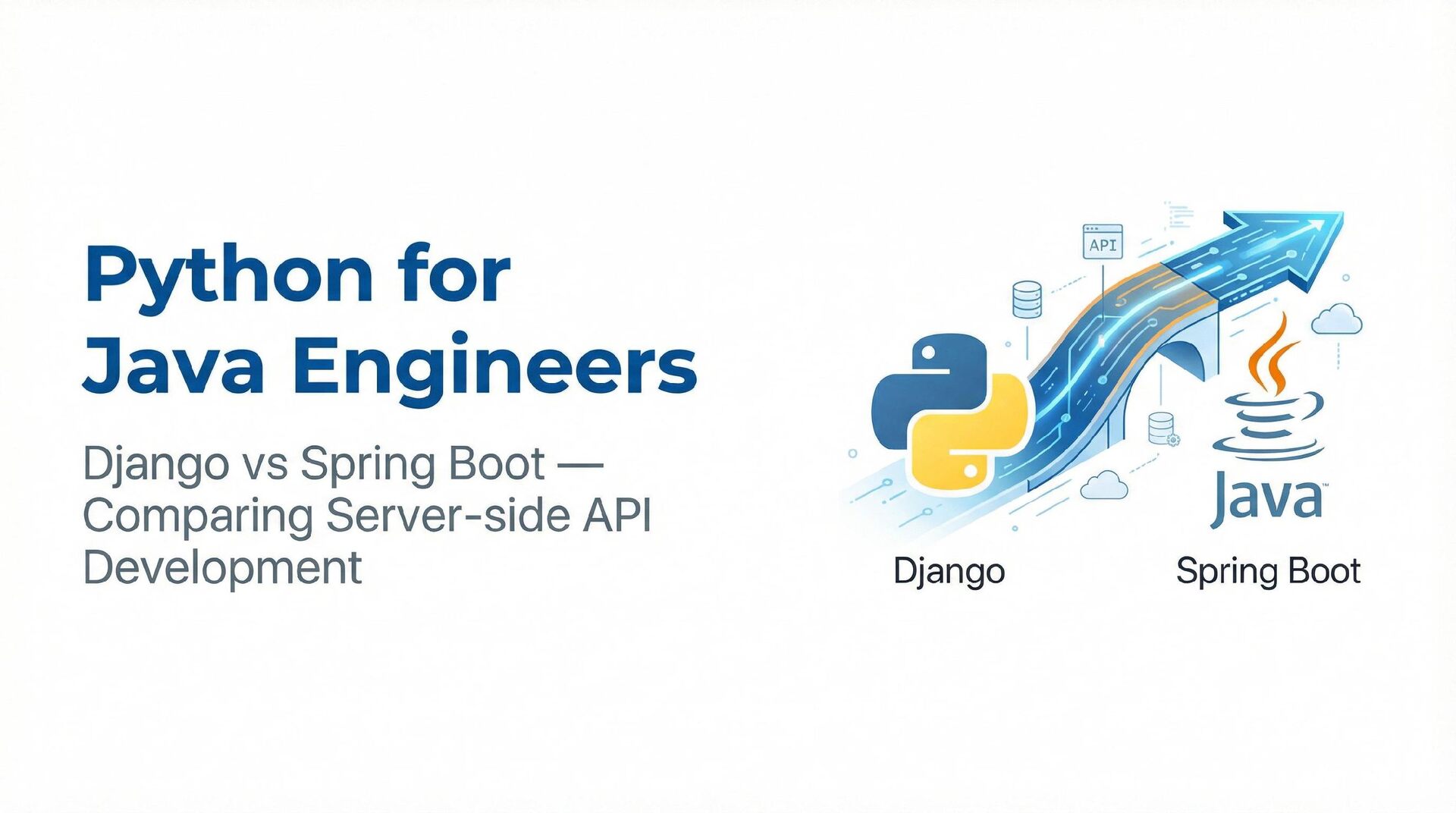 This presentation offers a practical comparison for senior Java engineers transitioning to Python and Django, highlighting key differences. At the language level, it focuses on the shift from static to dynamic typing (with type hints) and from verbose to concise syntax (e.g., Stream API vs. comprehensions). At the framework level, it contrasts Spring Boot's "configuration over convention" with Django's "batteries included" philosophy, detailing practical implementation differences in server-side API development through code examples, including project structure, ORM (JPA/Hibernate vs. Django ORM), and database migration strategies.