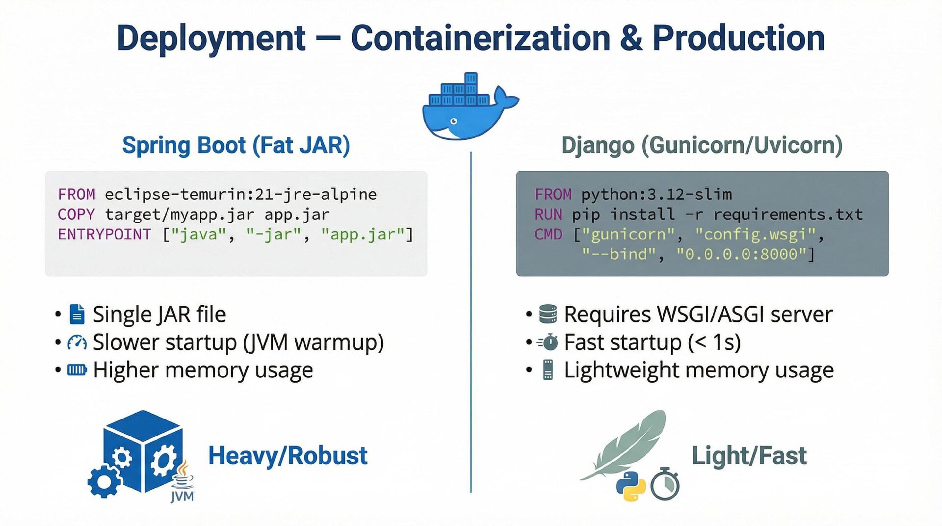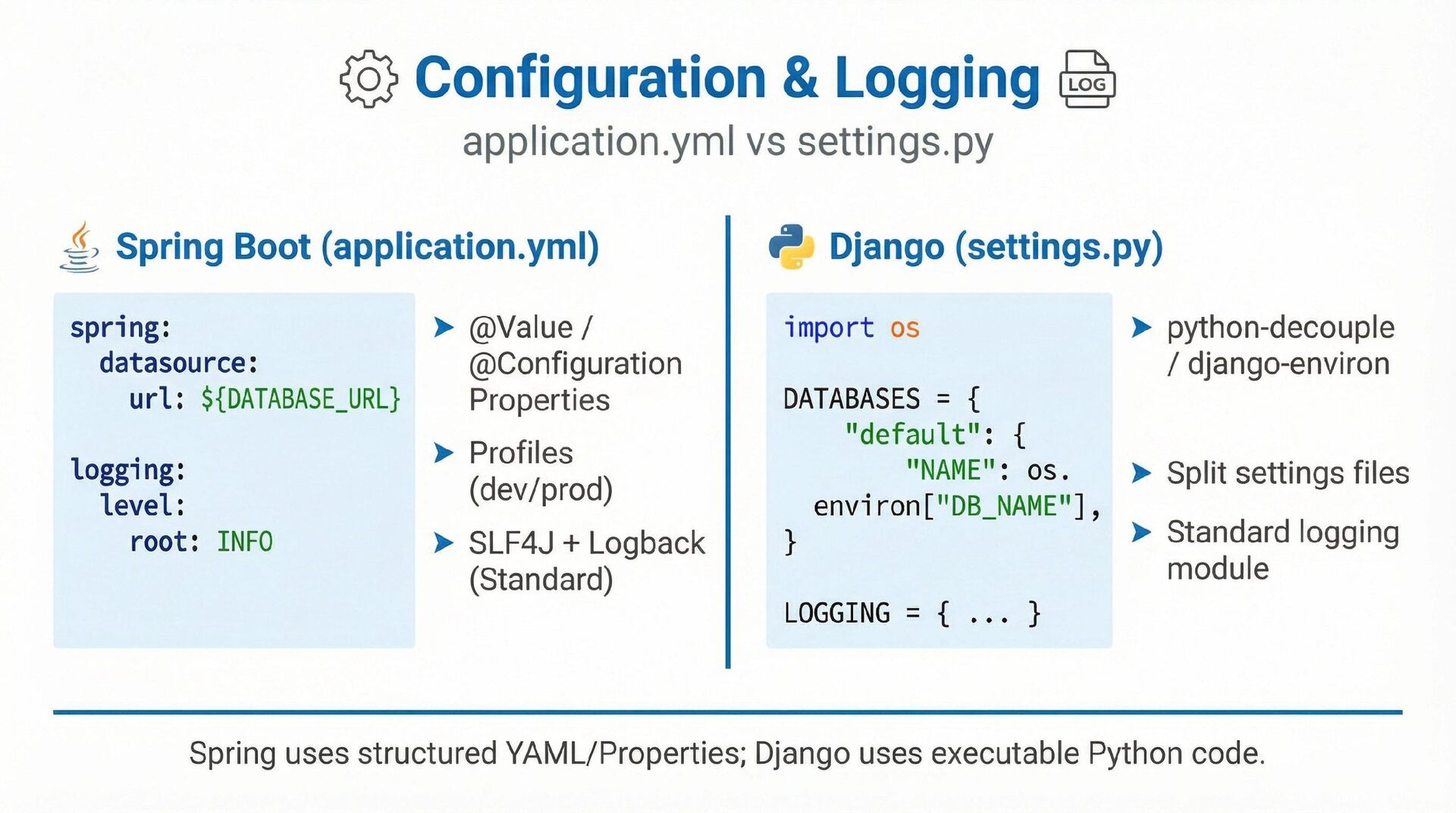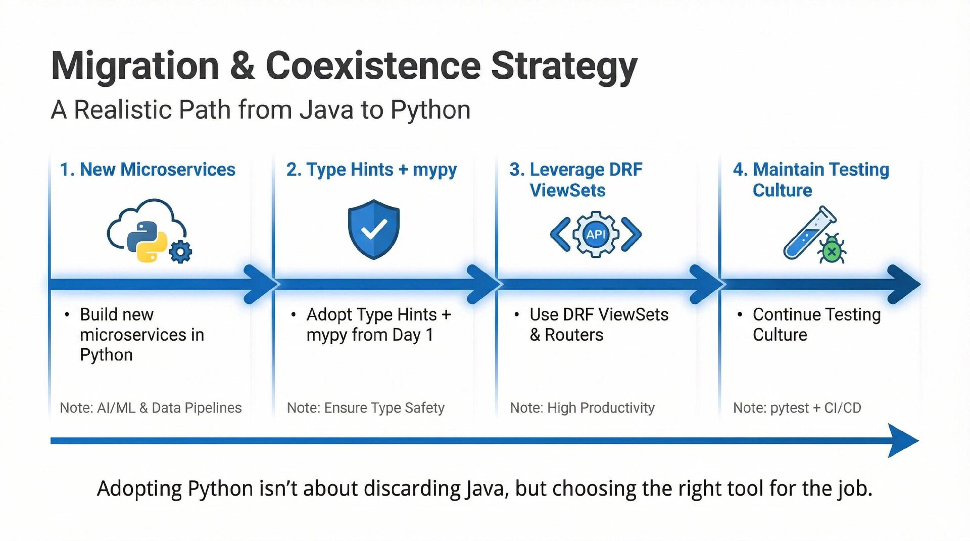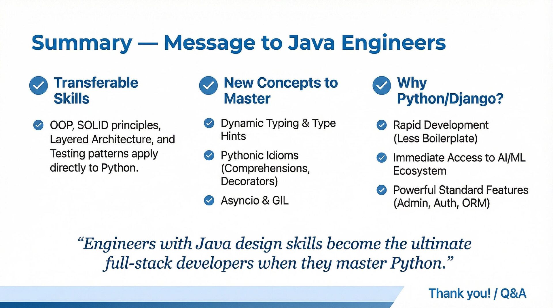 This presentation offers a practical comparison for senior Java engineers transitioning to Python and Django, highlighting key differences. At the language level, it focuses on the shift from static to dynamic typing (with type hints) and from verbose to concise syntax (e.g., Stream API vs. comprehensions). At the framework level, it contrasts Spring Boot's "configuration over convention" with Django's "batteries included" philosophy, detailing practical implementation differences in server-side API development through code examples, including project structure, ORM (JPA/Hibernate vs. Django ORM), and database migration strategies.
