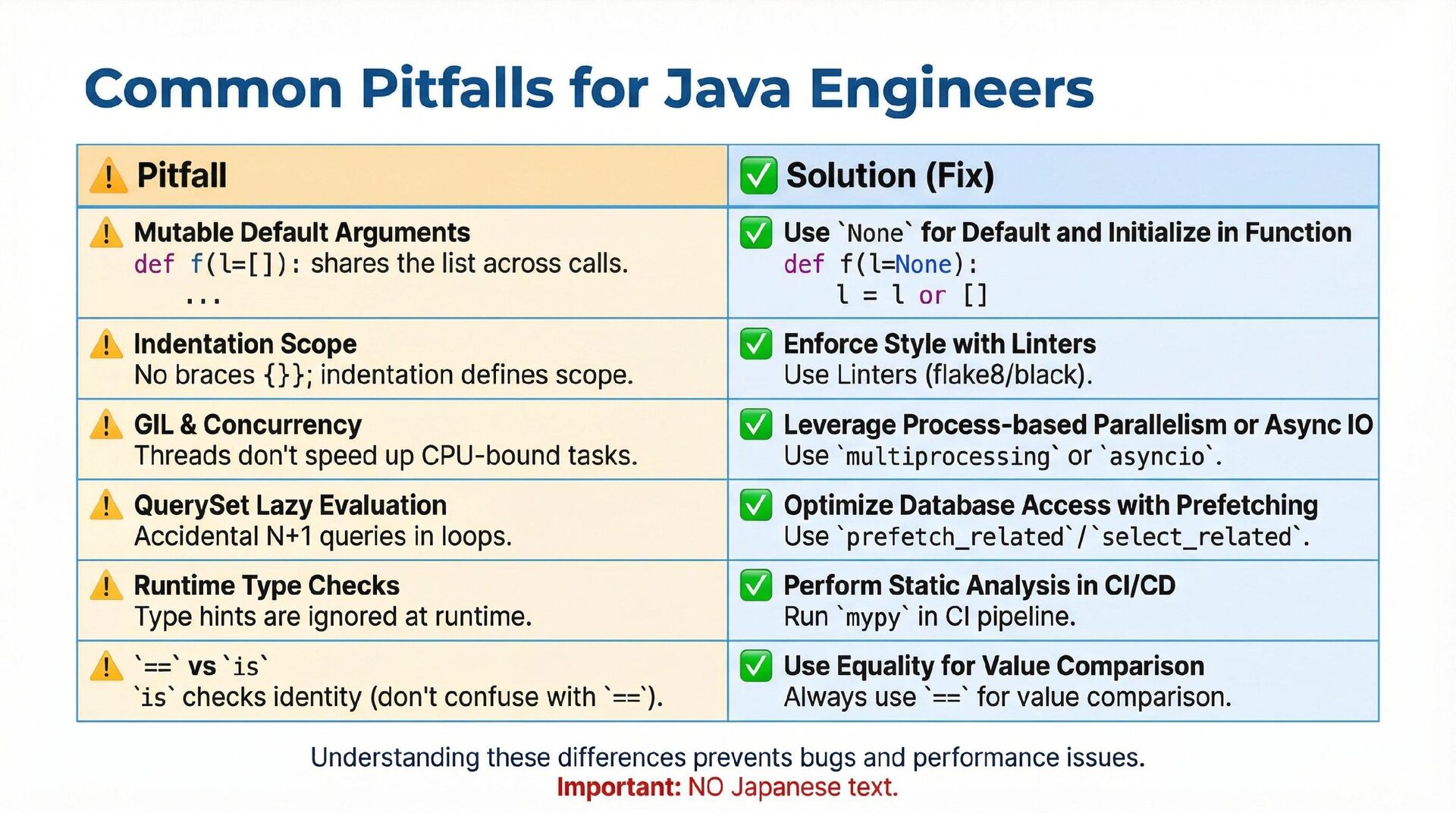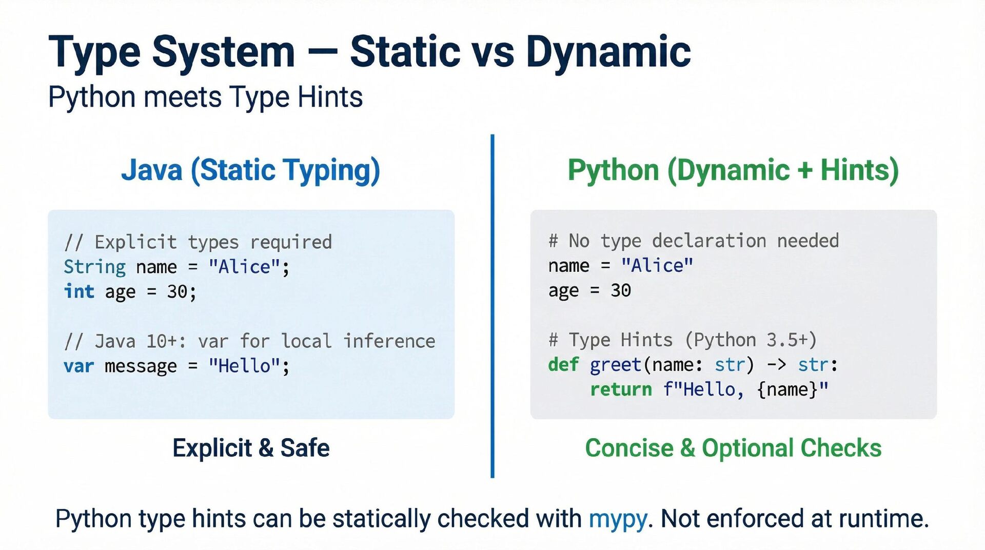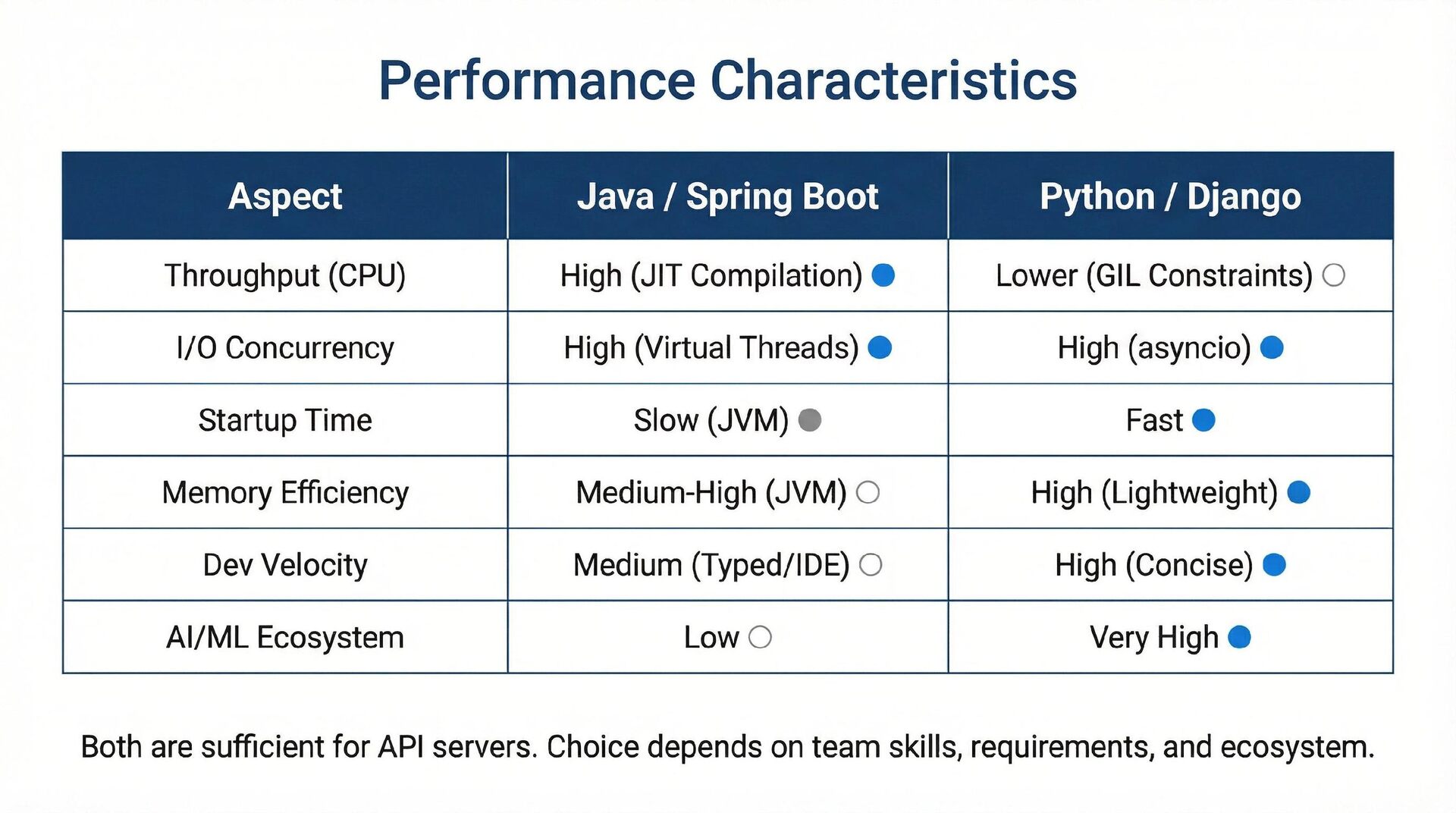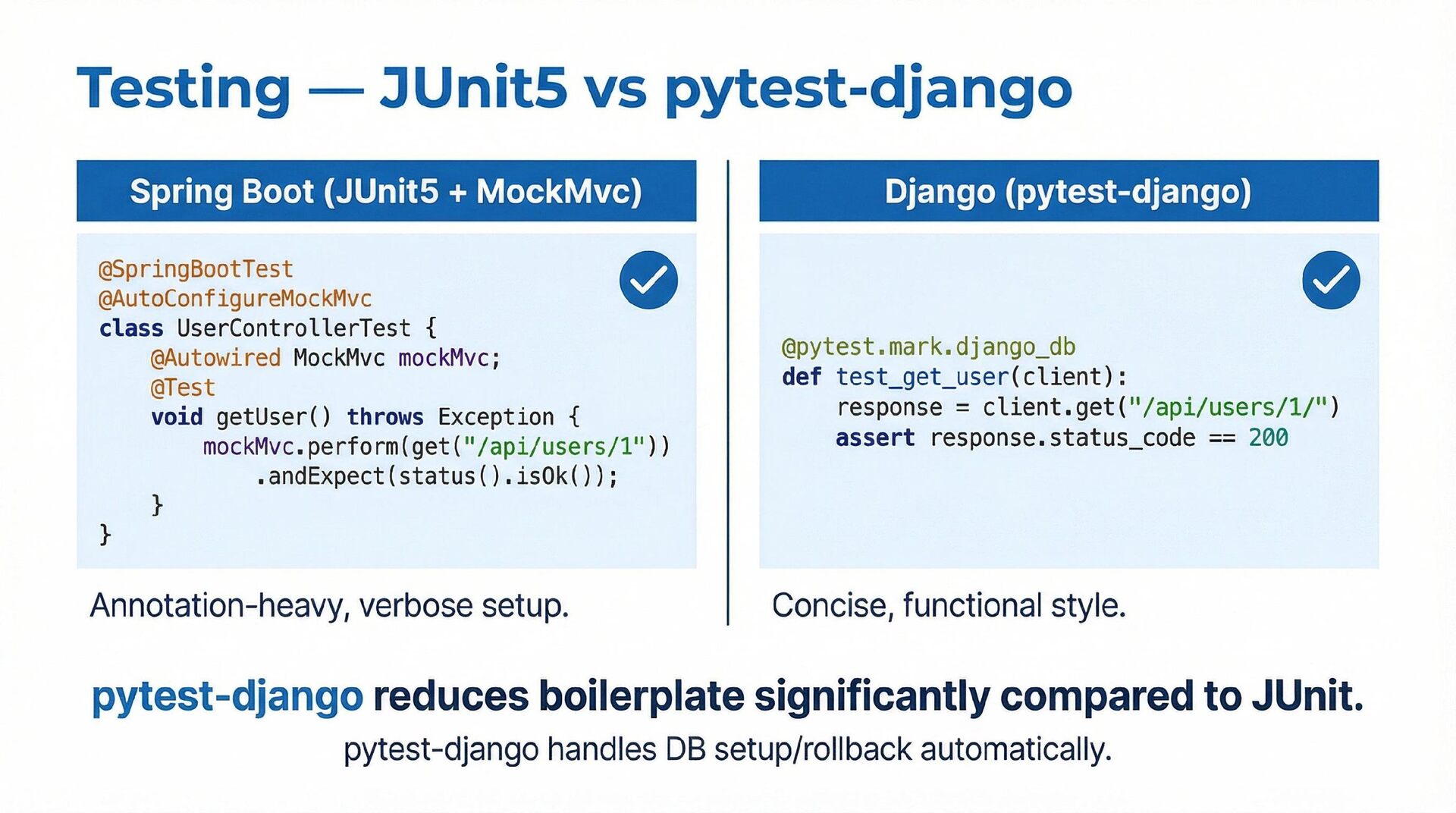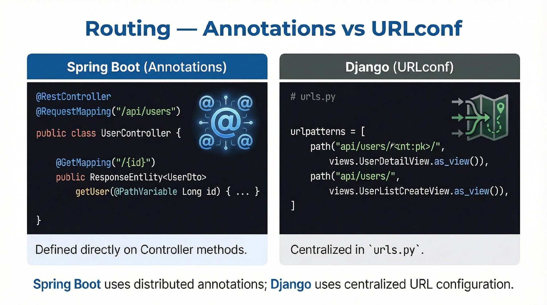 This presentation offers a practical comparison for senior Java engineers transitioning to Python and Django, highlighting key differences. At the language level, it focuses on the shift from static to dynamic typing (with type hints) and from verbose to concise syntax (e.g., Stream API vs. comprehensions). At the framework level, it contrasts Spring Boot's "configuration over convention" with Django's "batteries included" philosophy, detailing practical implementation differences in server-side API development through code examples, including project structure, ORM (JPA/Hibernate vs. Django ORM), and database migration strategies.