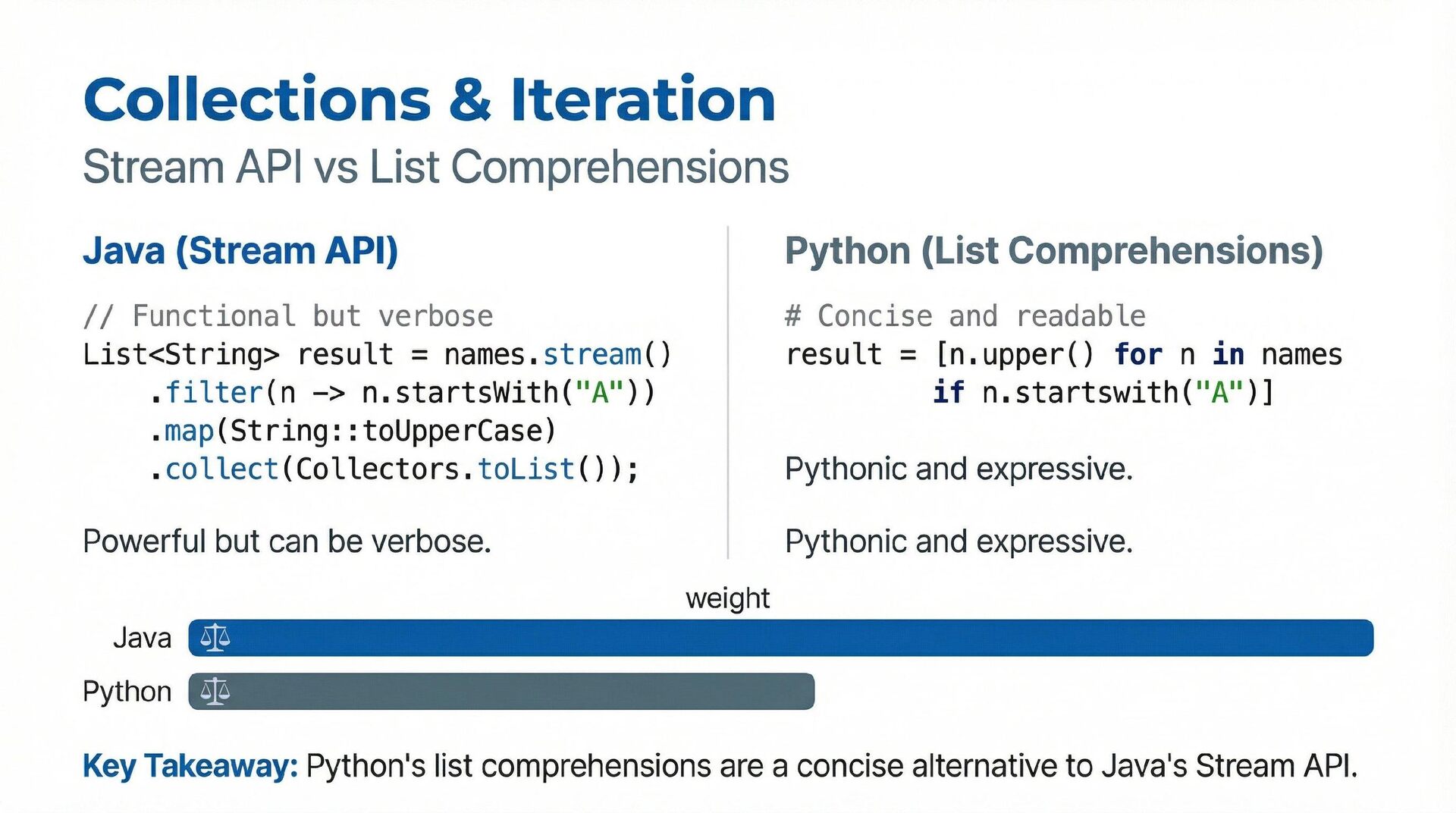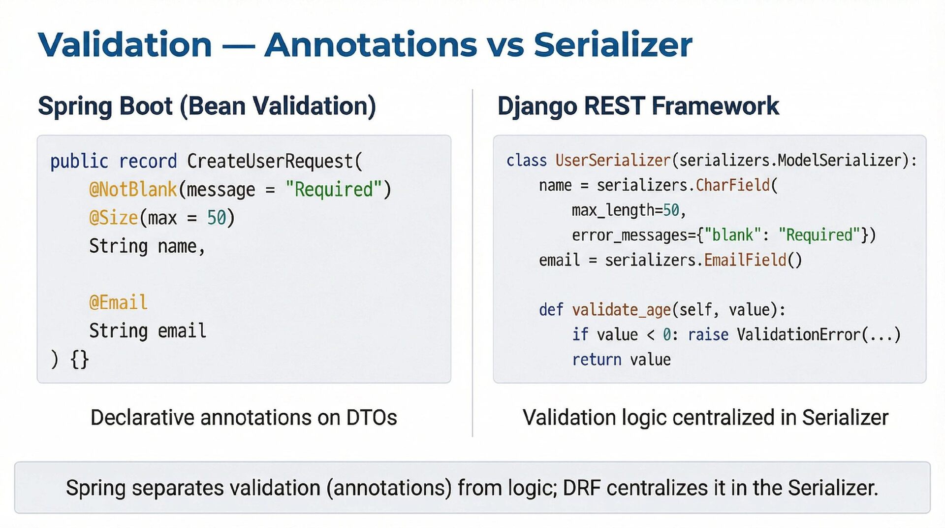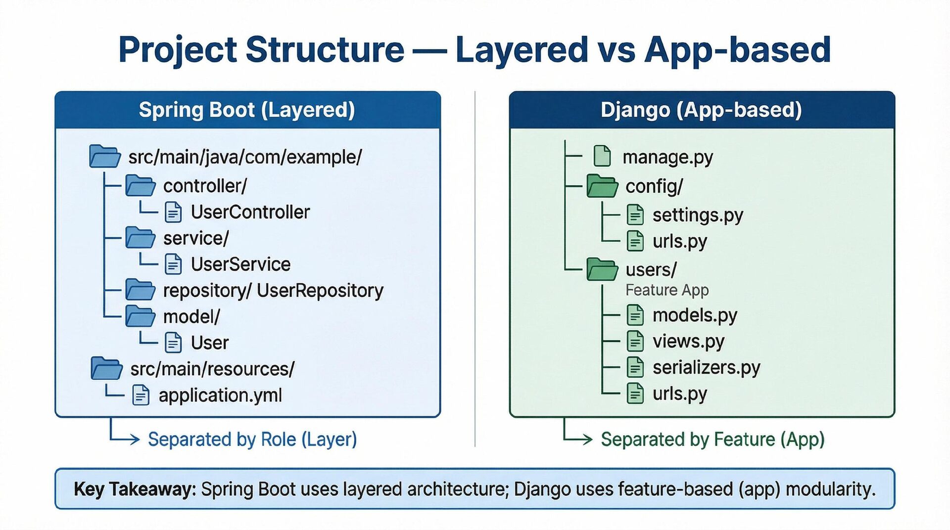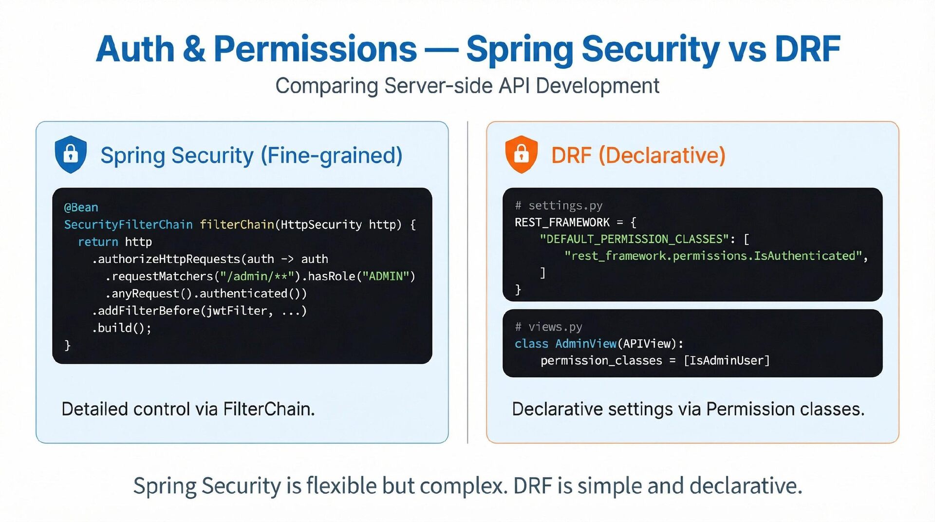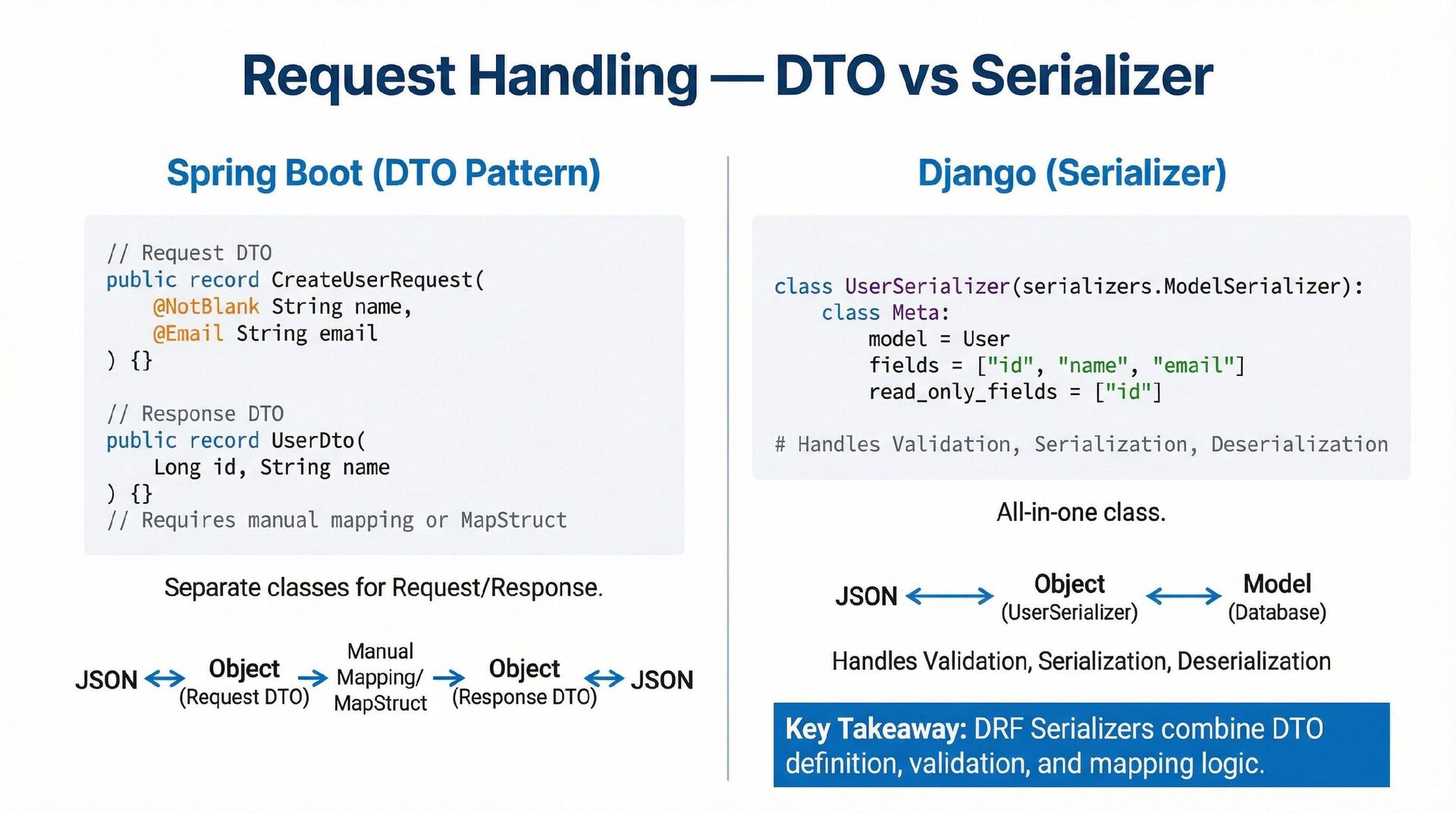 This presentation offers a practical comparison for senior Java engineers transitioning to Python and Django, highlighting key differences. At the language level, it focuses on the shift from static to dynamic typing (with type hints) and from verbose to concise syntax (e.g., Stream API vs. comprehensions). At the framework level, it contrasts Spring Boot's "configuration over convention" with Django's "batteries included" philosophy, detailing practical implementation differences in server-side API development through code examples, including project structure, ORM (JPA/Hibernate vs. Django ORM), and database migration strategies.
