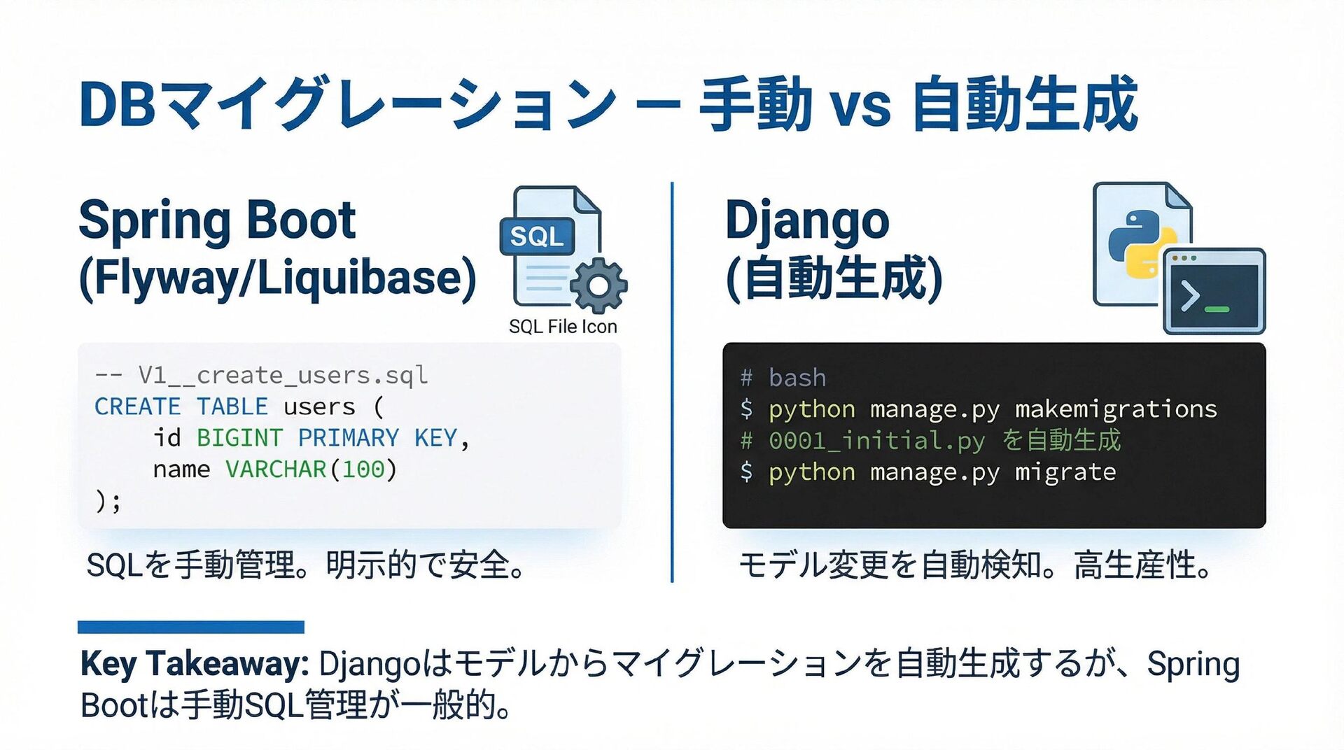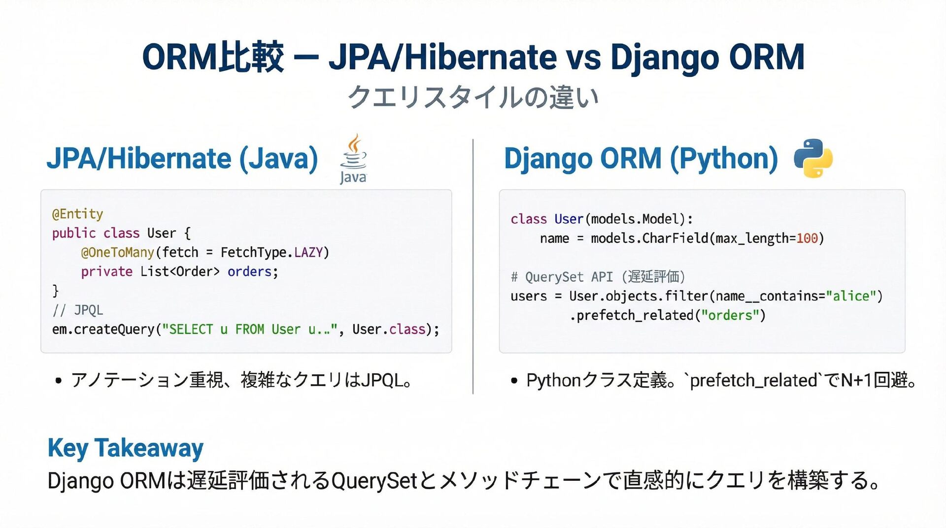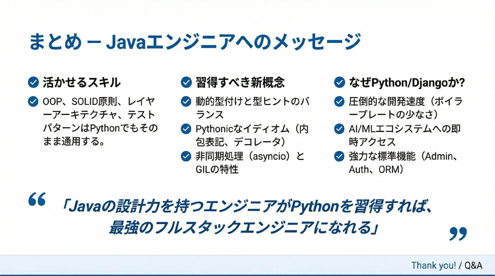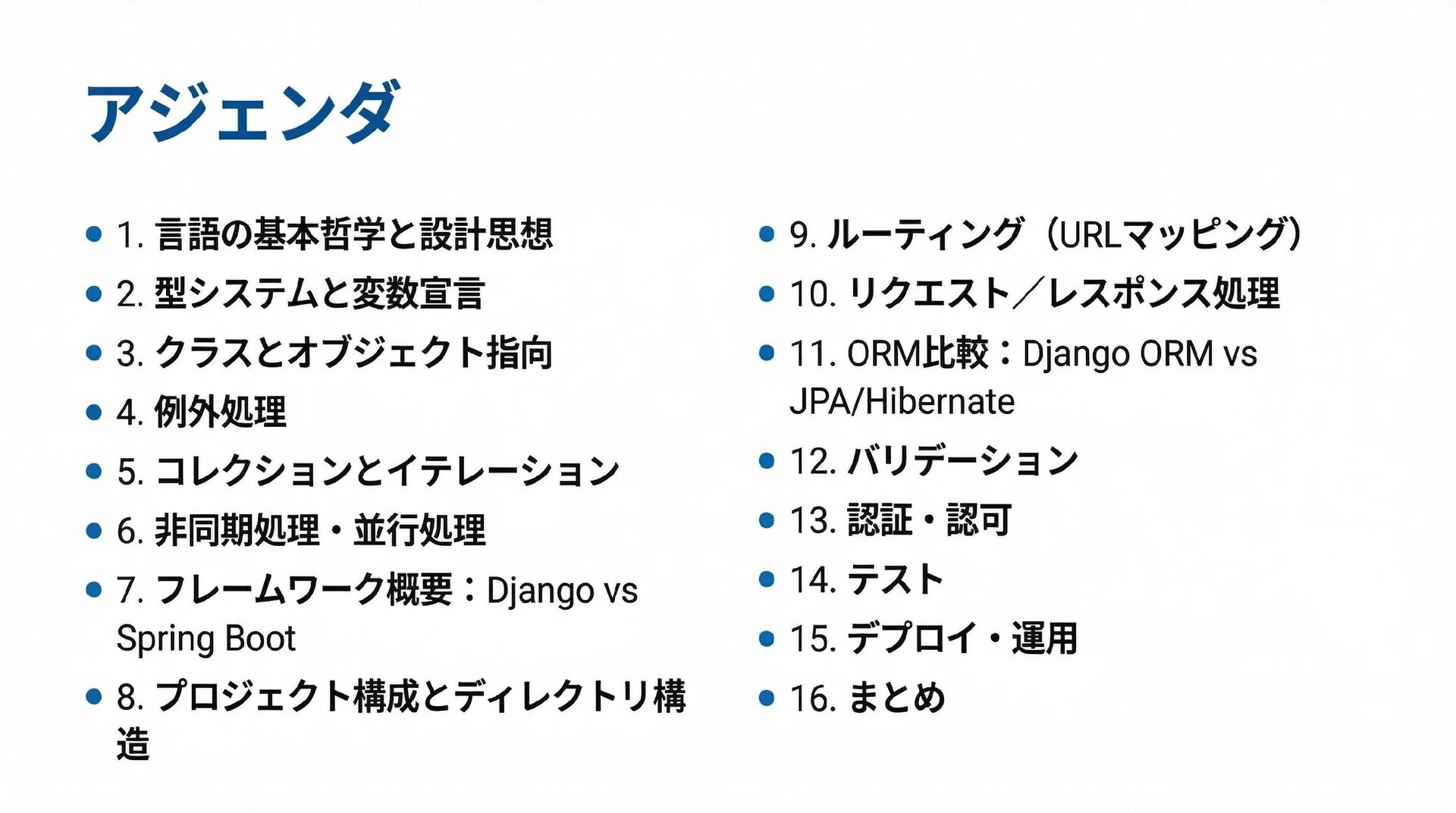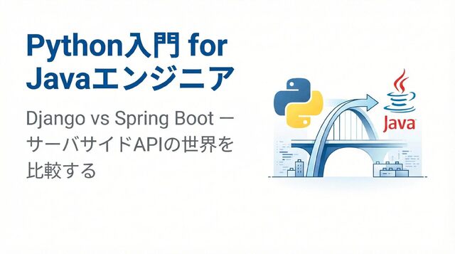 本スライドは、シニアJavaエンジニアがPythonおよびDjangoを学ぶ際に直面する主要な違いを実践的に比較・解説します。言語レベルでは、静的型付けと動的型付け(型ヒント)、冗長な記述と簡潔な構文(Stream API vs 内包表記)の差に焦点を当てます。フレームワークレベルでは、Spring Bootの規約より設定という思想に対し、Djangoの「バッテリー同梱」思想、レイヤー構造とアプリ構造、JPA/HibernateとDjango ORM、Flywayと自動マイグレーションなど、サーバサイドAPI開発における具体的な実装の違いをコードと共に詳説します。