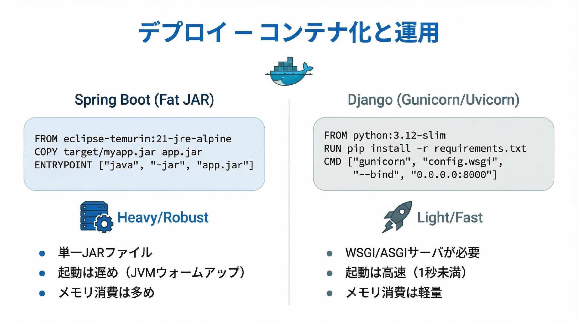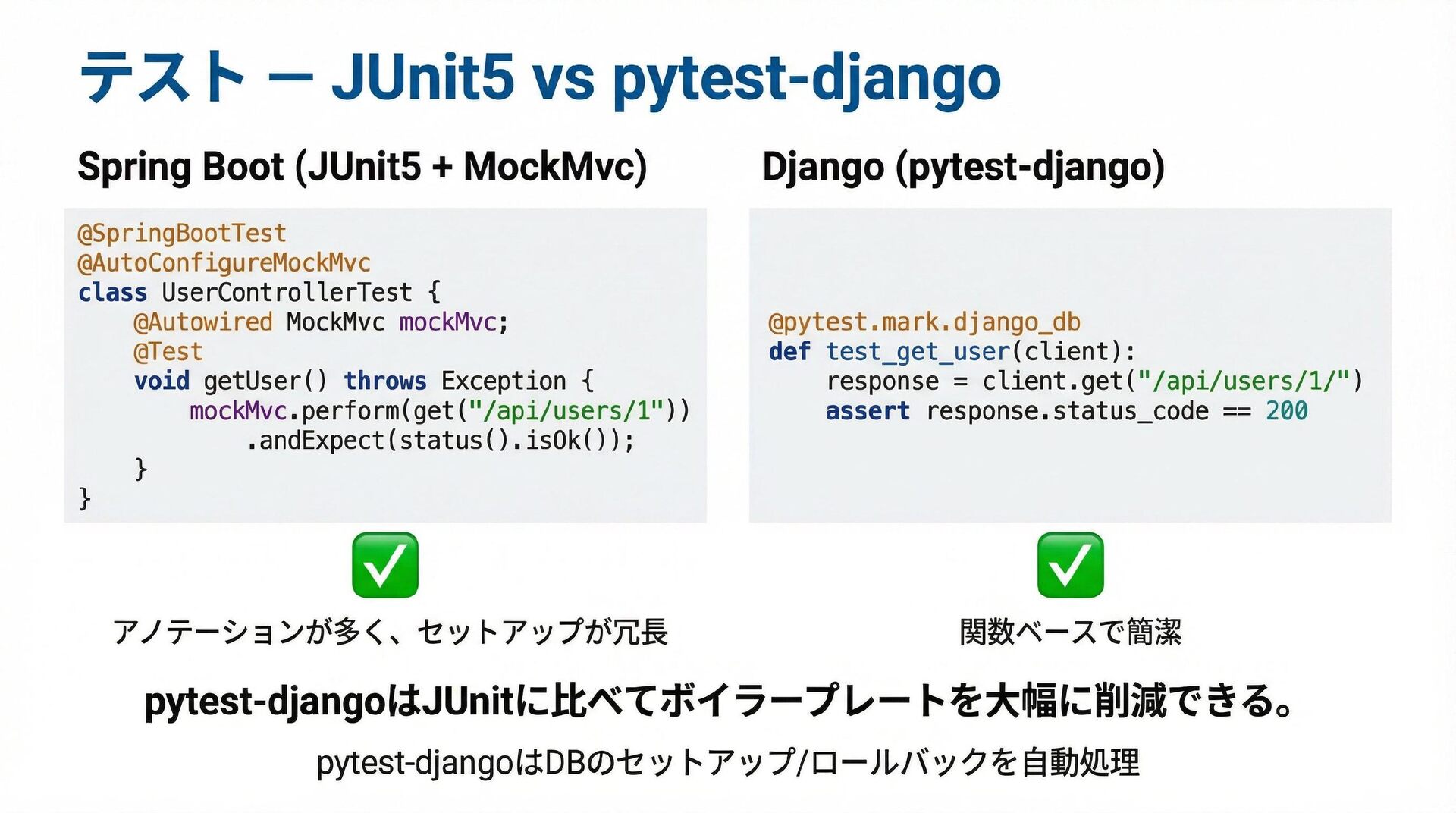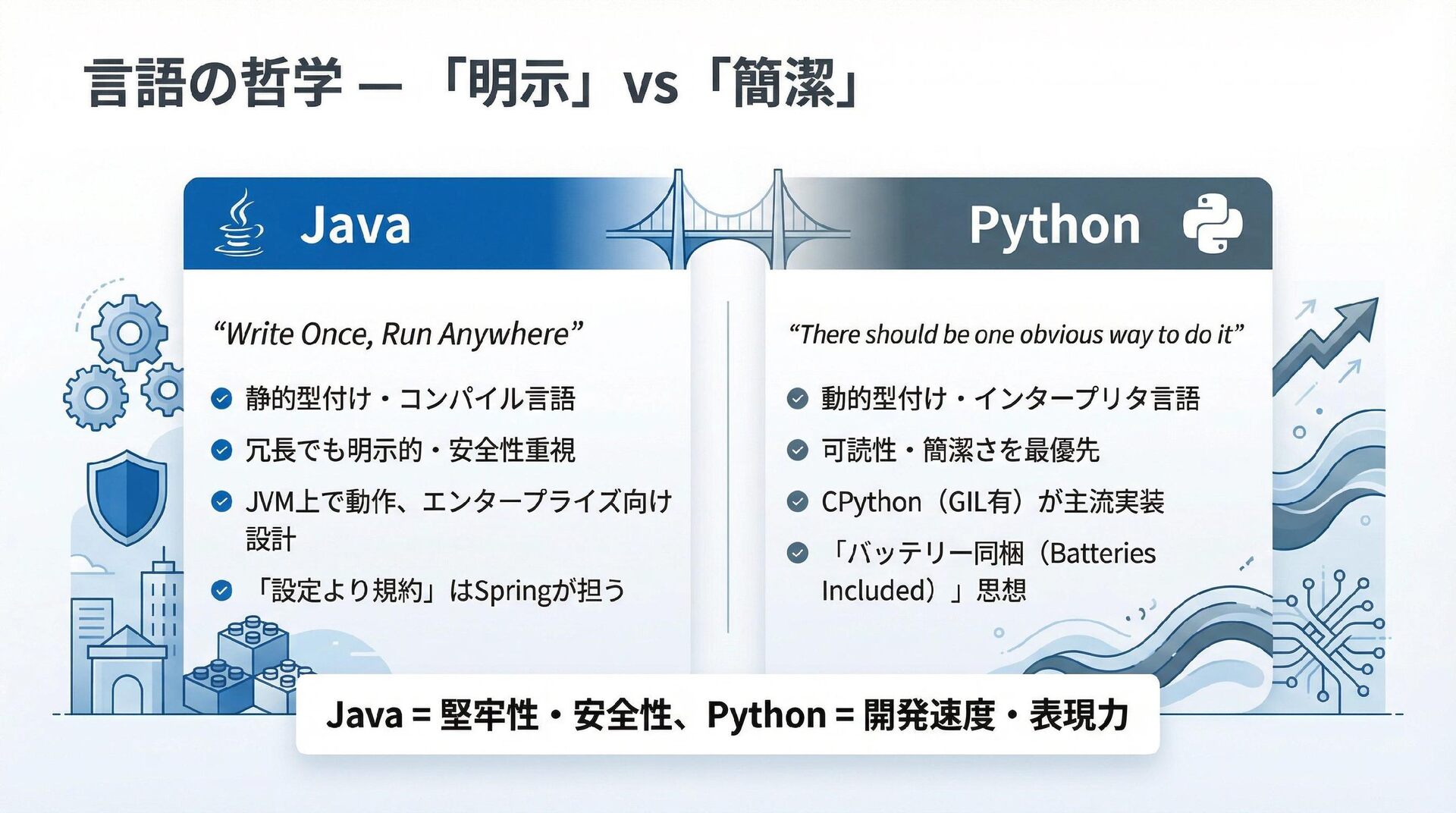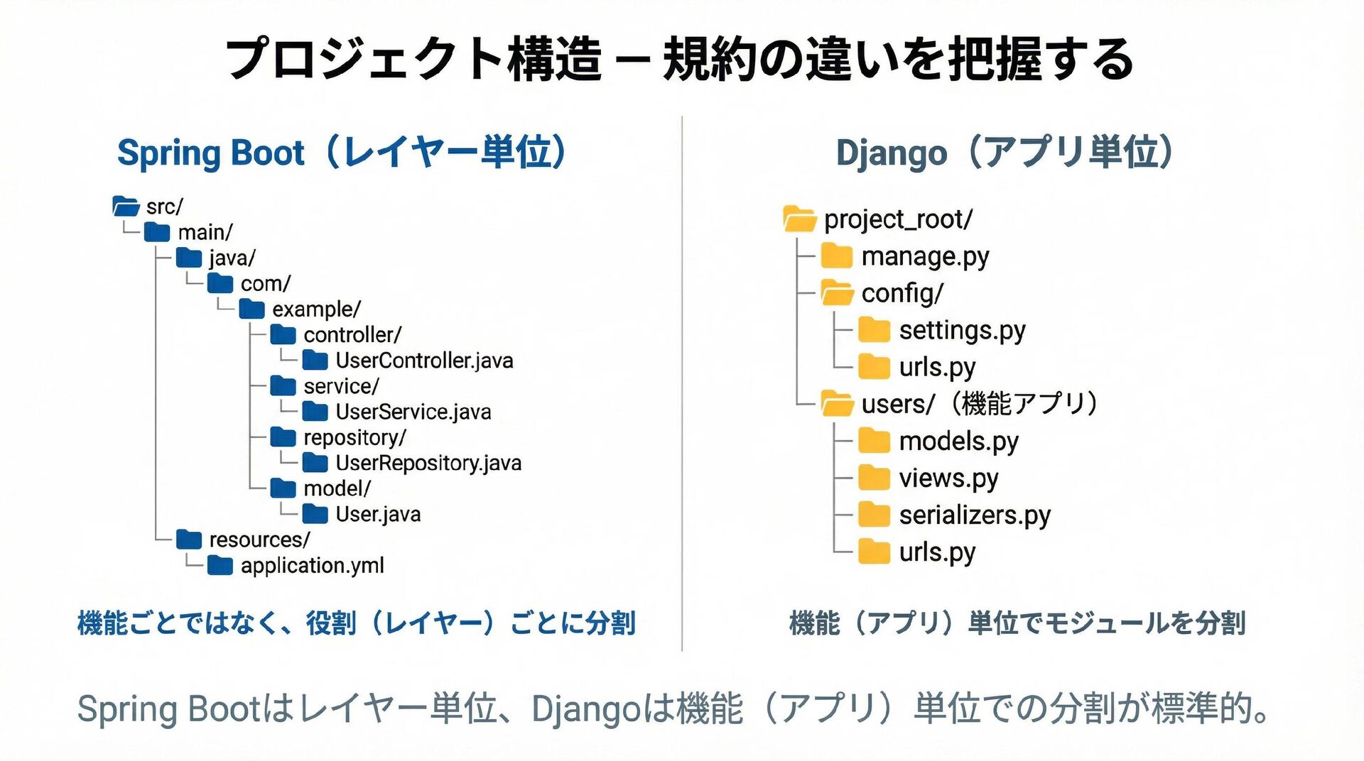 本スライドは、シニアJavaエンジニアがPythonおよびDjangoを学ぶ際に直面する主要な違いを実践的に比較・解説します。言語レベルでは、静的型付けと動的型付け(型ヒント)、冗長な記述と簡潔な構文(Stream API vs 内包表記)の差に焦点を当てます。フレームワークレベルでは、Spring Bootの規約より設定という思想に対し、Djangoの「バッテリー同梱」思想、レイヤー構造とアプリ構造、JPA/HibernateとDjango ORM、Flywayと自動マイグレーションなど、サーバサイドAPI開発における具体的な実装の違いをコードと共に詳説します。