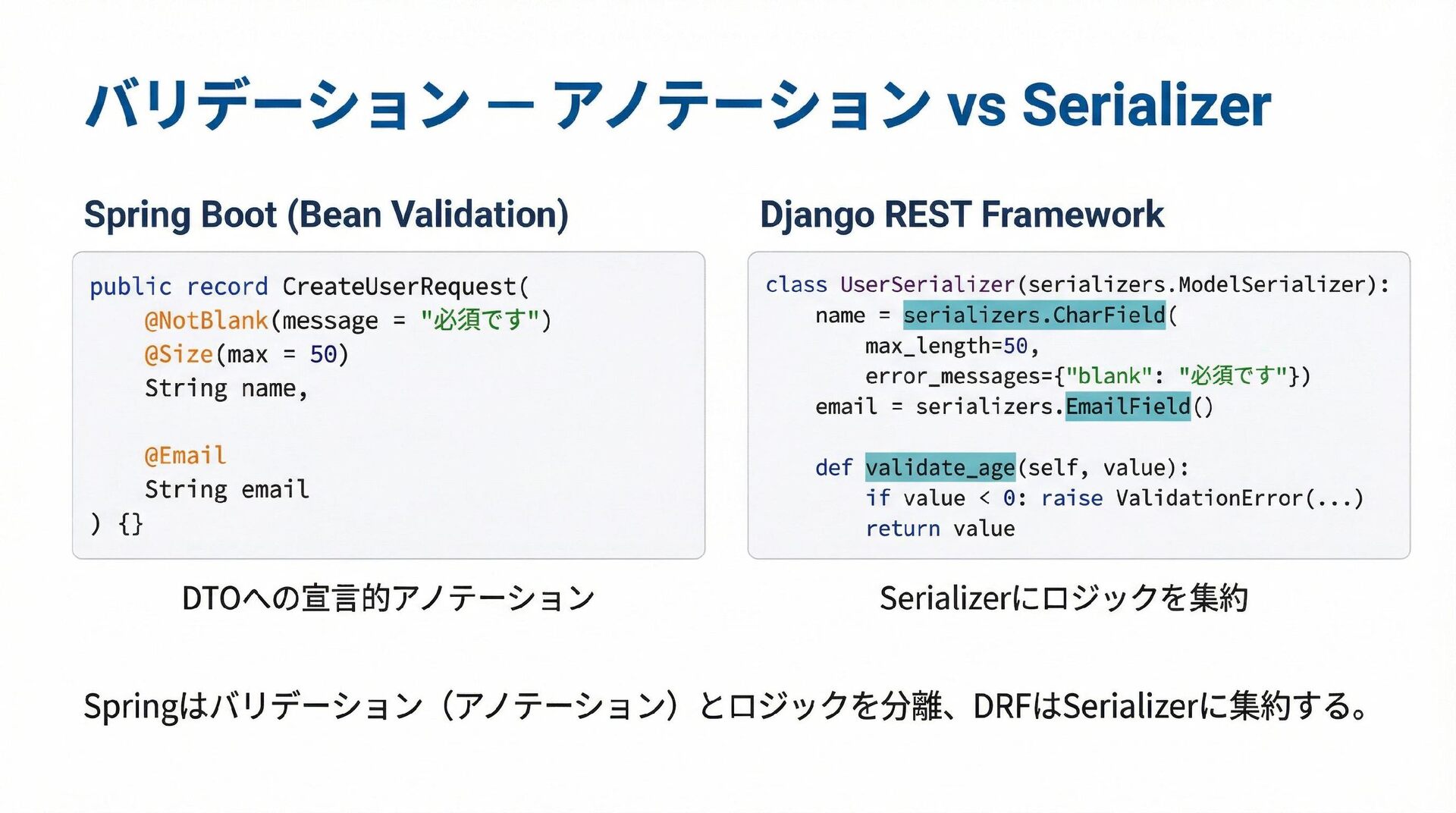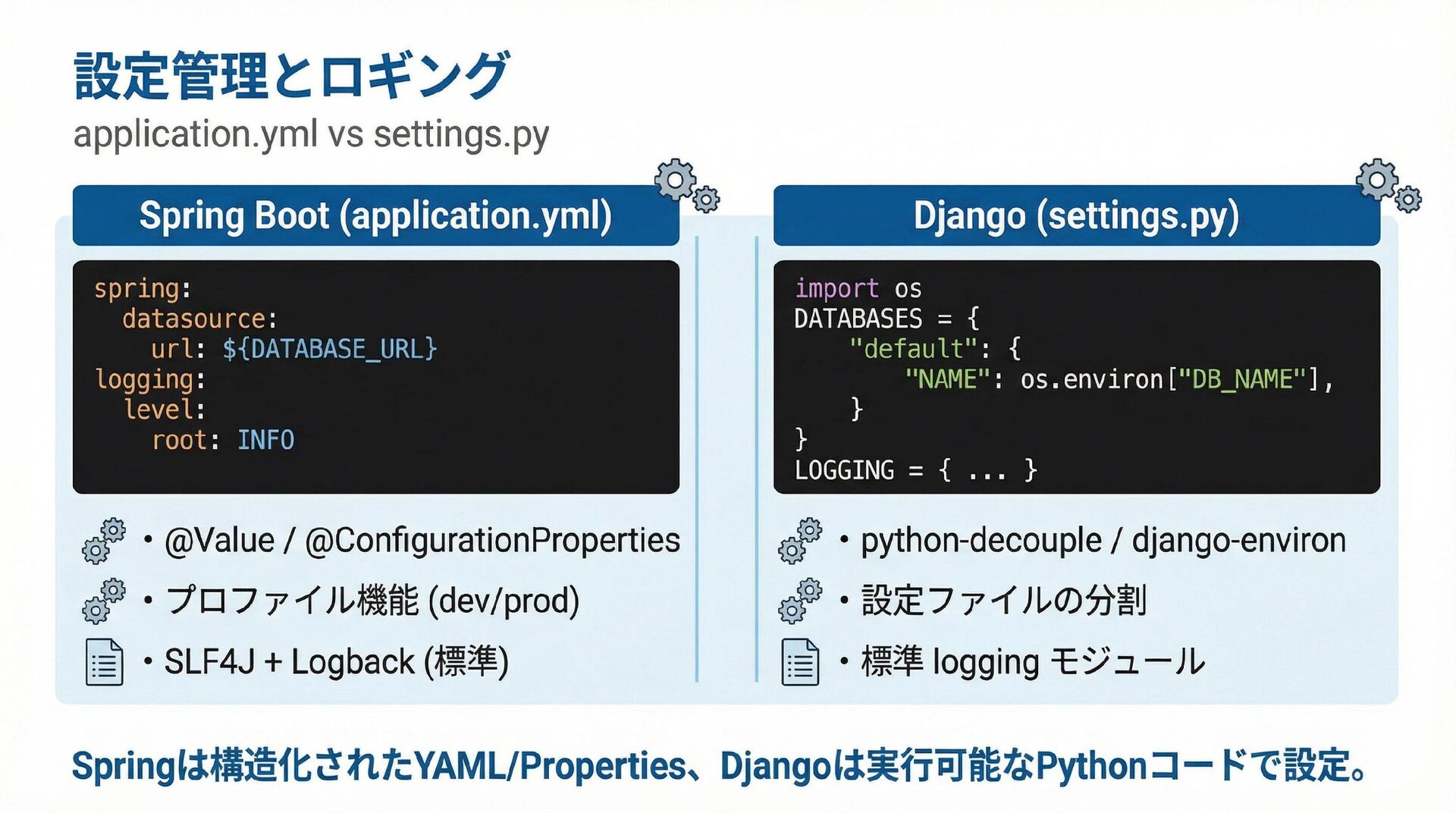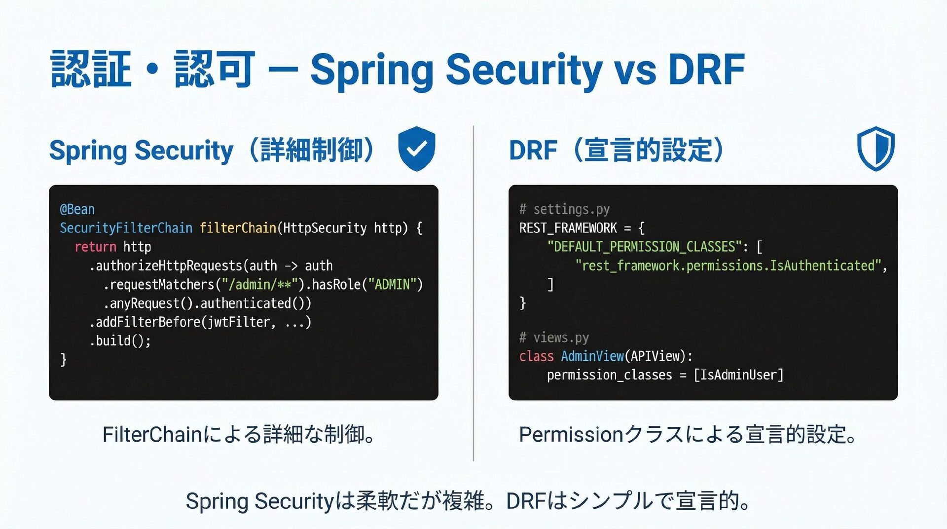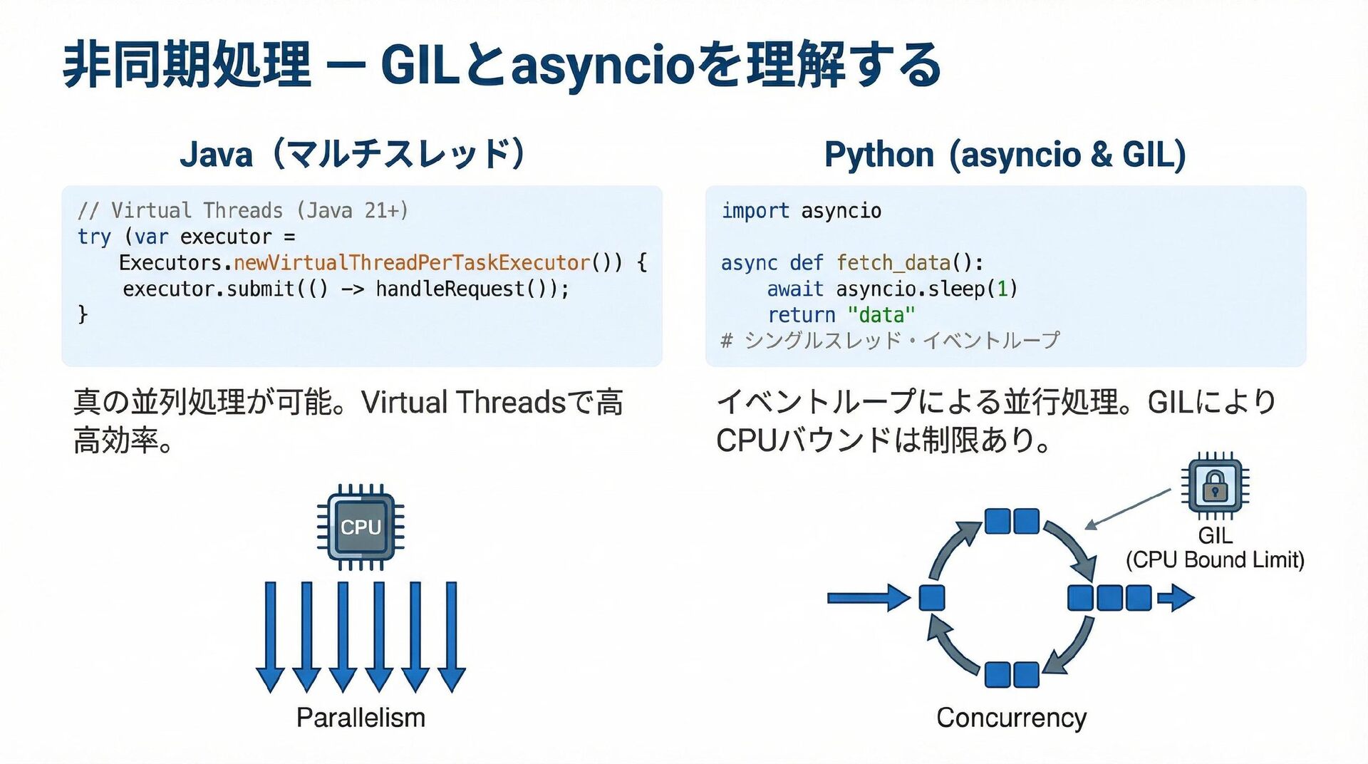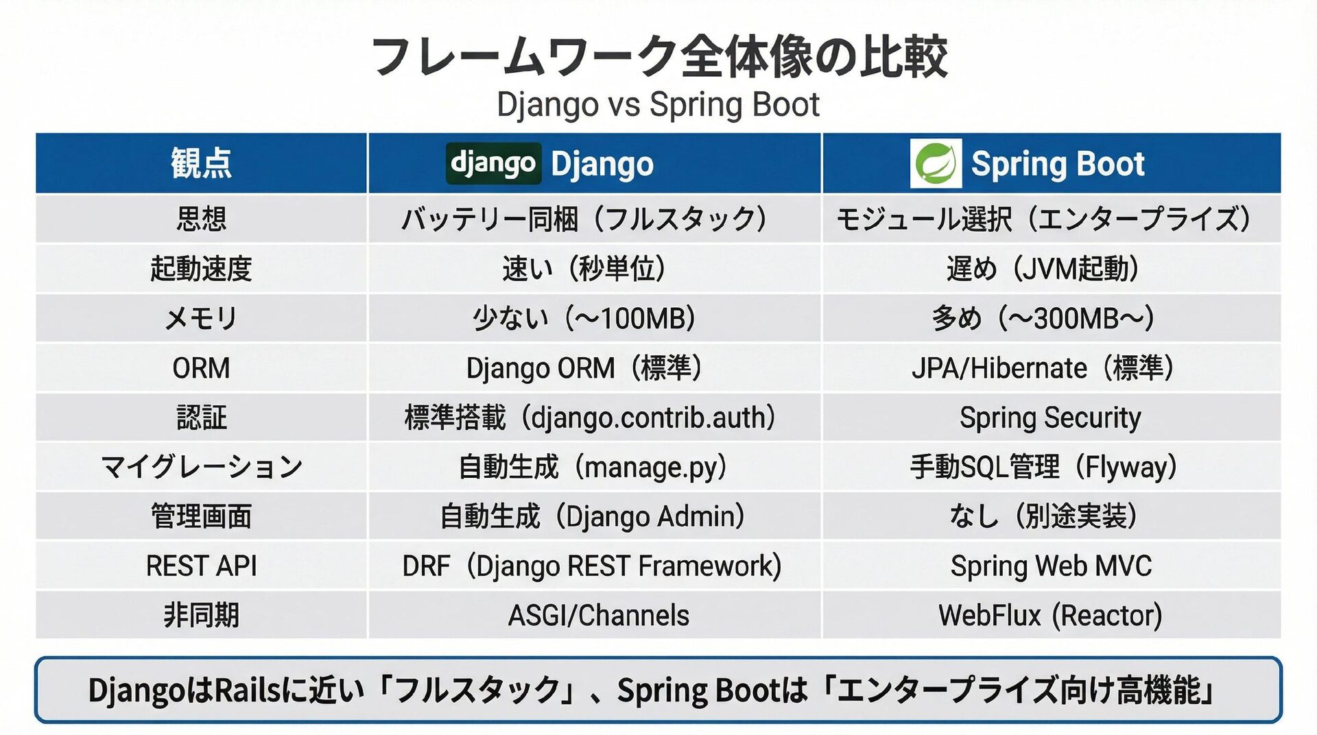 本スライドは、シニアJavaエンジニアがPythonおよびDjangoを学ぶ際に直面する主要な違いを実践的に比較・解説します。言語レベルでは、静的型付けと動的型付け(型ヒント)、冗長な記述と簡潔な構文(Stream API vs 内包表記)の差に焦点を当てます。フレームワークレベルでは、Spring Bootの規約より設定という思想に対し、Djangoの「バッテリー同梱」思想、レイヤー構造とアプリ構造、JPA/HibernateとDjango ORM、Flywayと自動マイグレーションなど、サーバサイドAPI開発における具体的な実装の違いをコードと共に詳説します。