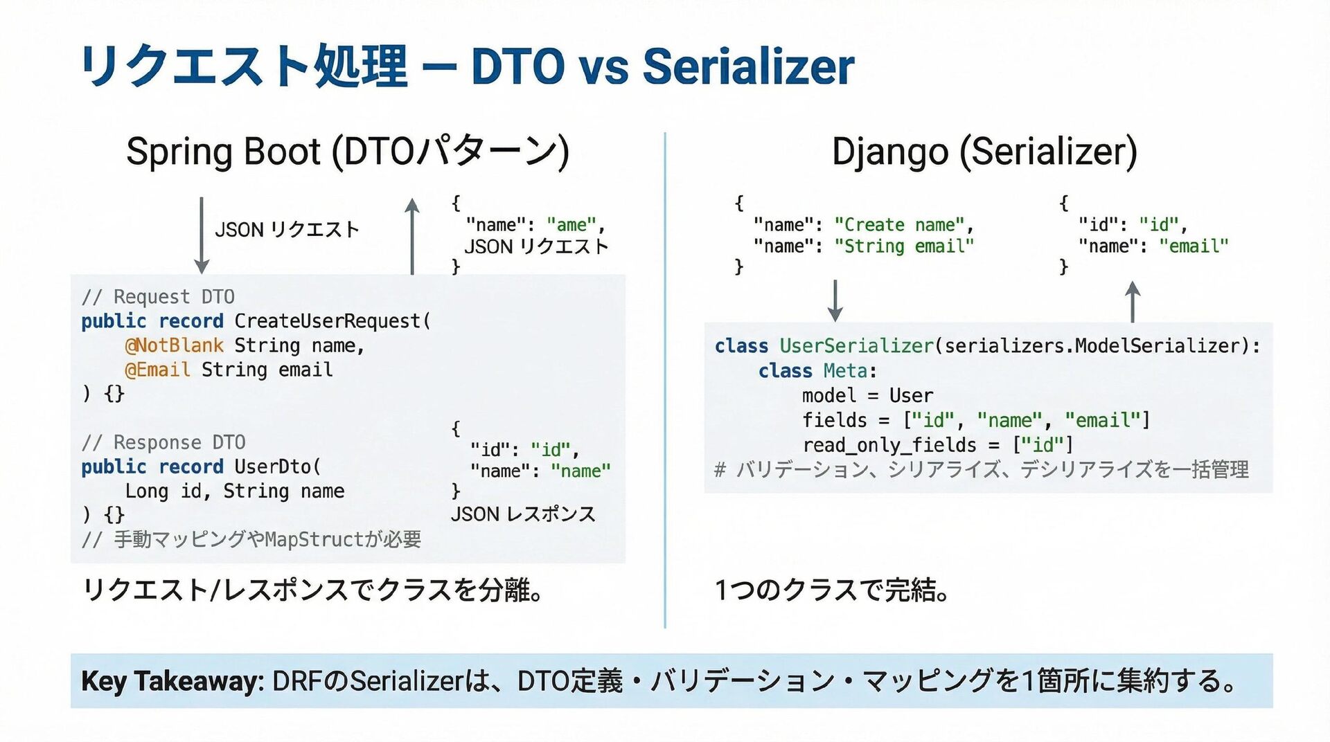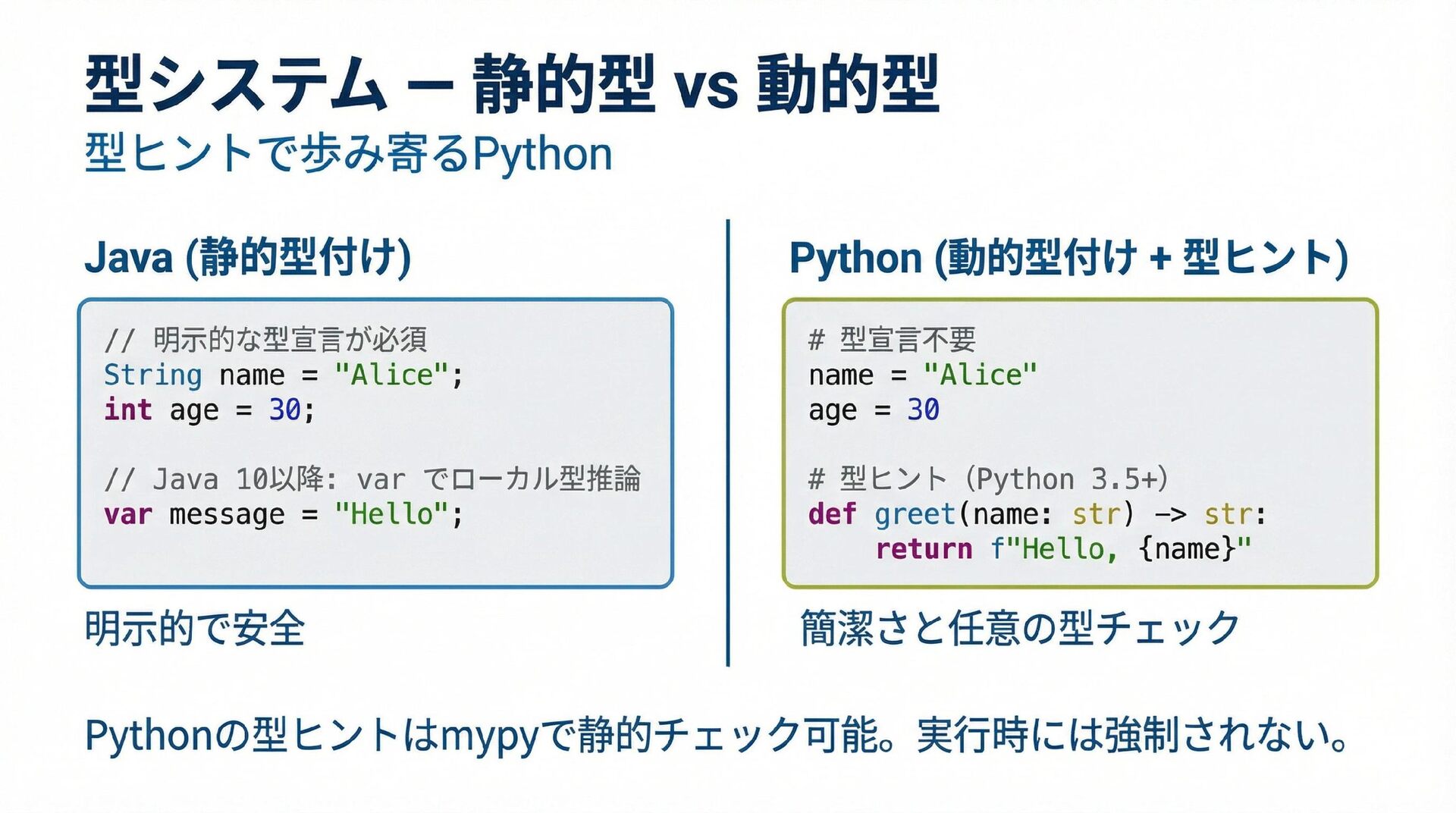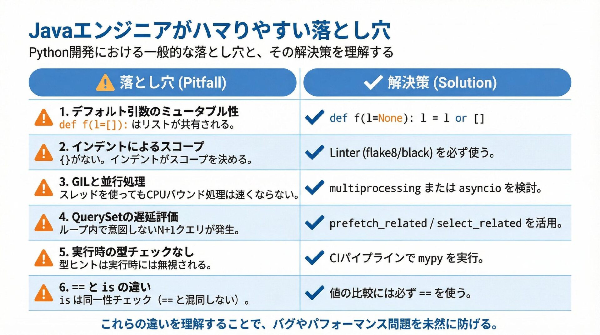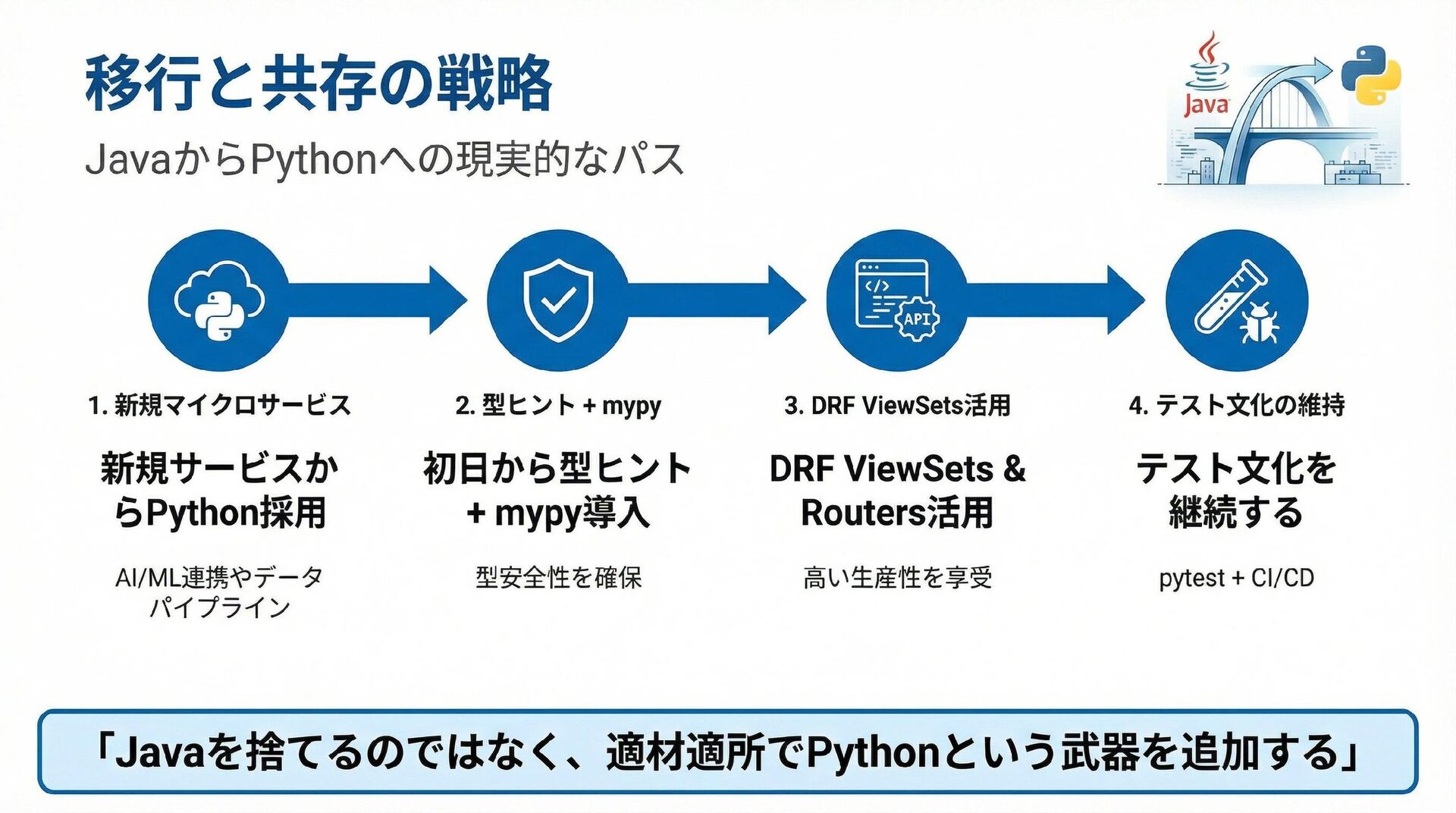 本スライドは、シニアJavaエンジニアがPythonおよびDjangoを学ぶ際に直面する主要な違いを実践的に比較・解説します。言語レベルでは、静的型付けと動的型付け(型ヒント)、冗長な記述と簡潔な構文(Stream API vs 内包表記)の差に焦点を当てます。フレームワークレベルでは、Spring Bootの規約より設定という思想に対し、Djangoの「バッテリー同梱」思想、レイヤー構造とアプリ構造、JPA/HibernateとDjango ORM、Flywayと自動マイグレーションなど、サーバサイドAPI開発における具体的な実装の違いをコードと共に詳説します。