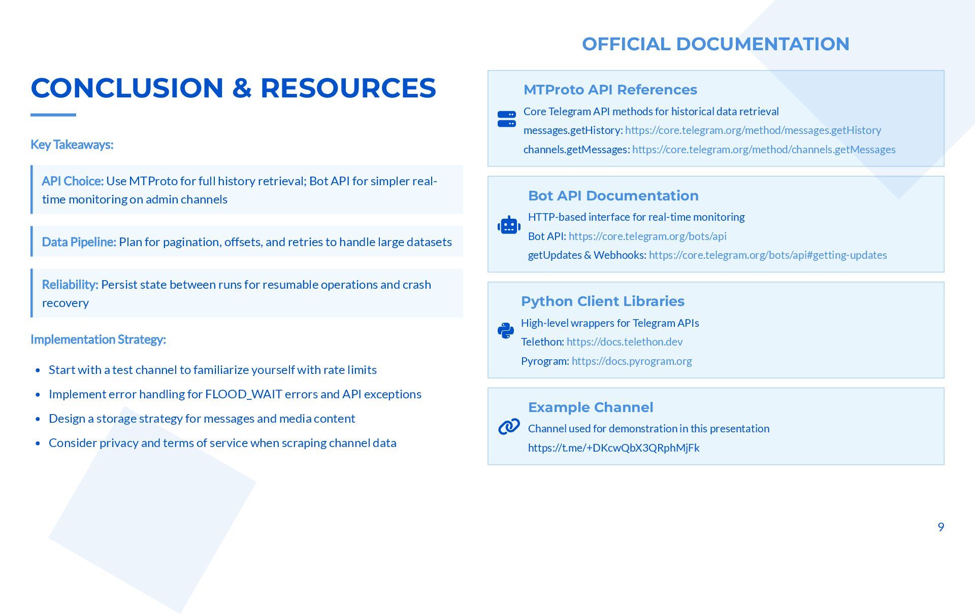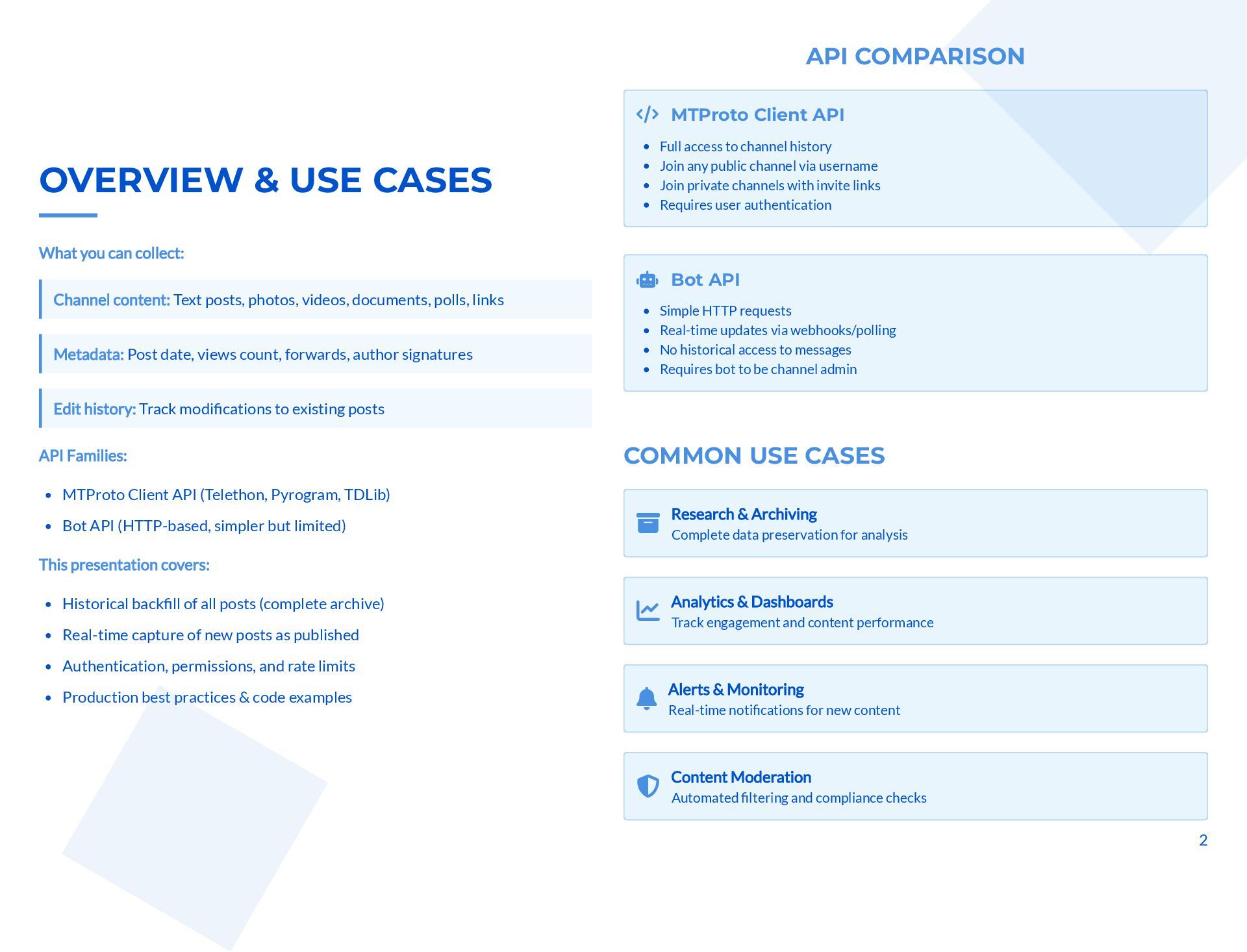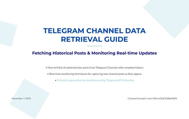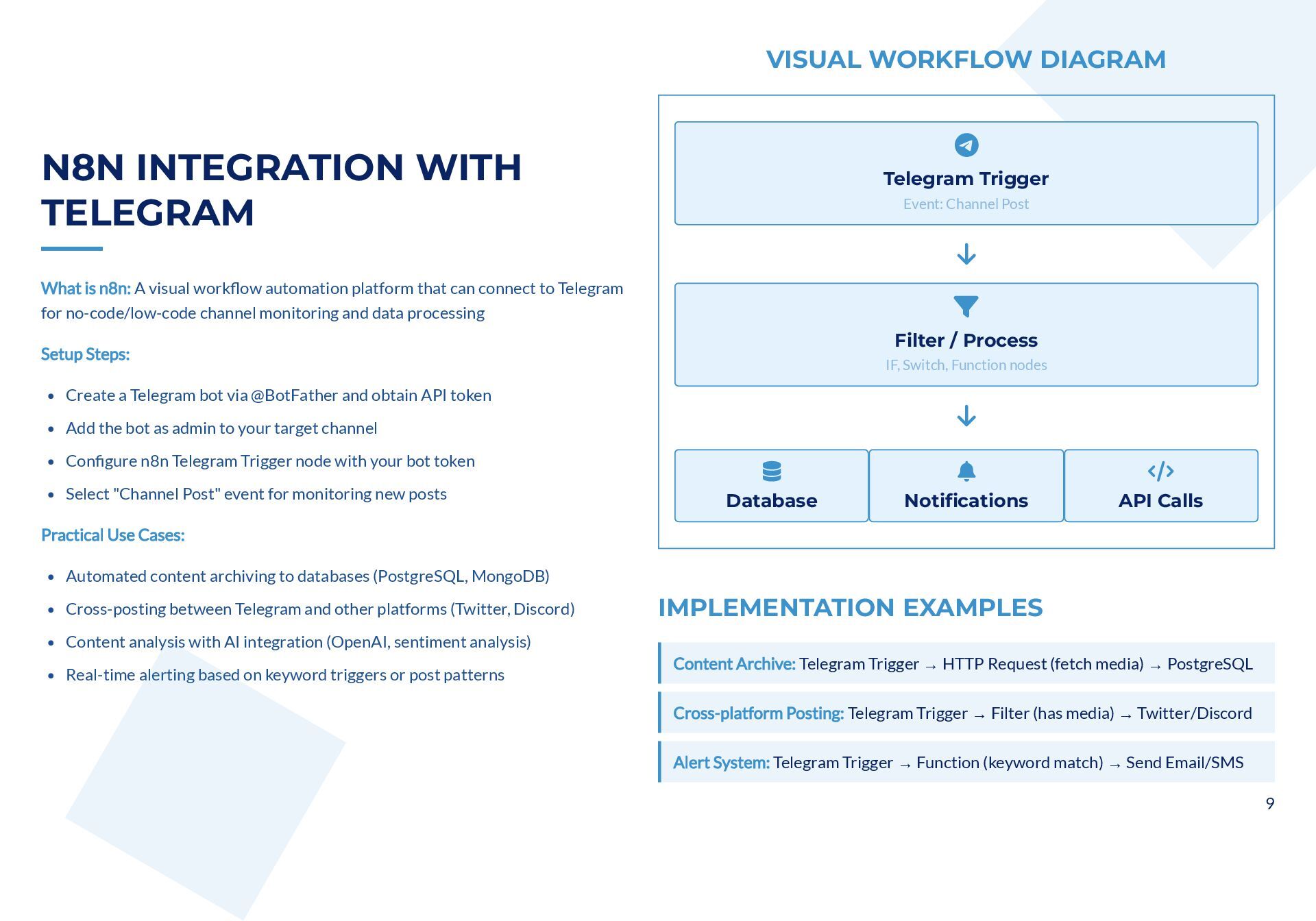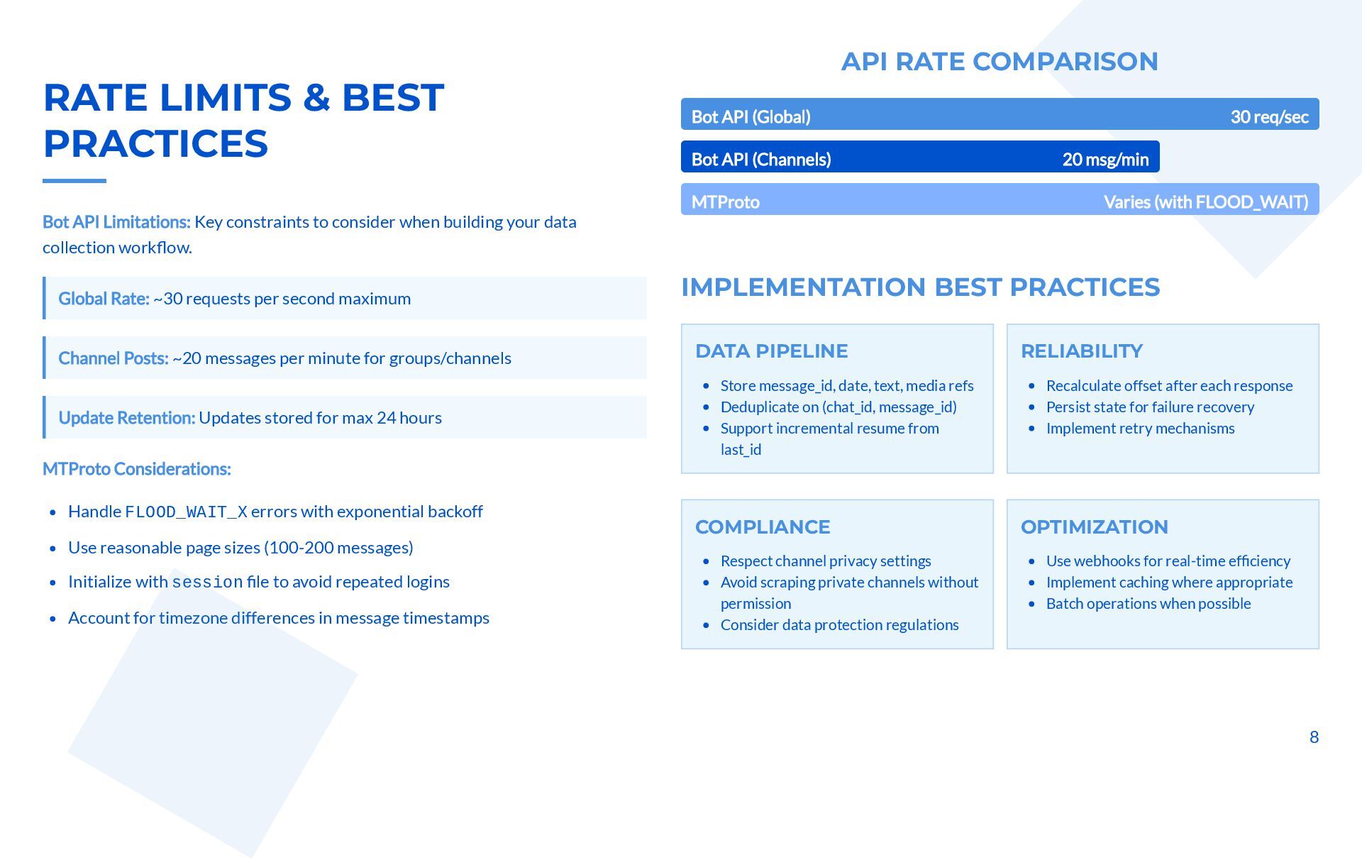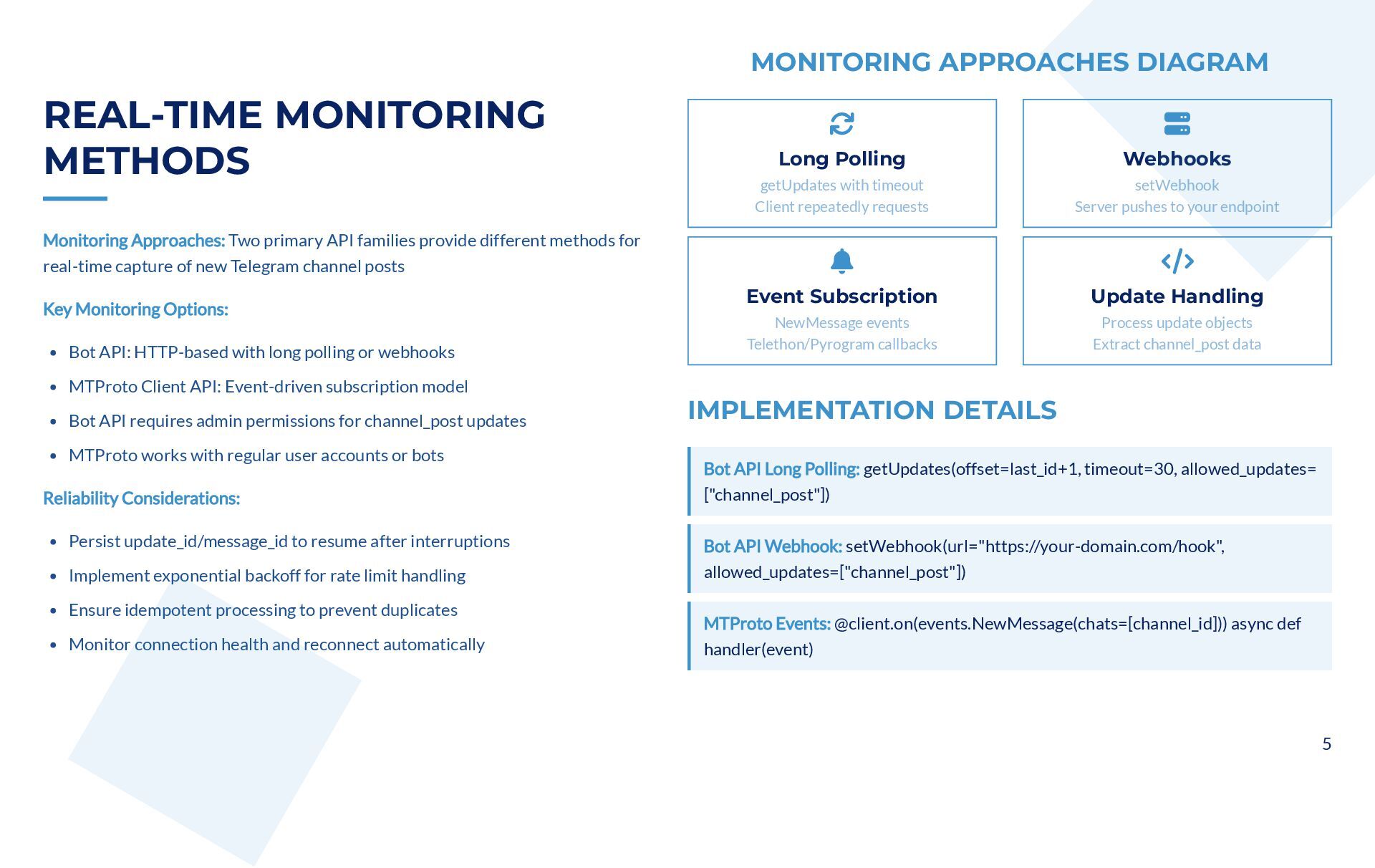 This slide deck is a technical guide to fully archiving admin posts from a Telegram channel while also monitoring new posts in real time. It explains the differences between the MTProto client APIs (Telethon / Pyrogram) and the Bot API, how to authenticate, how to retrieve message history using methods like messages.getHistory and iter_messages, and how to monitor updates via webhooks, long polling, or Telethon events. It also introduces workflow examples using n8n for saving to a database, cross-posting, and alerts, plus best practices for production such as handling rate limits and backing off when FloodWait errors occur.