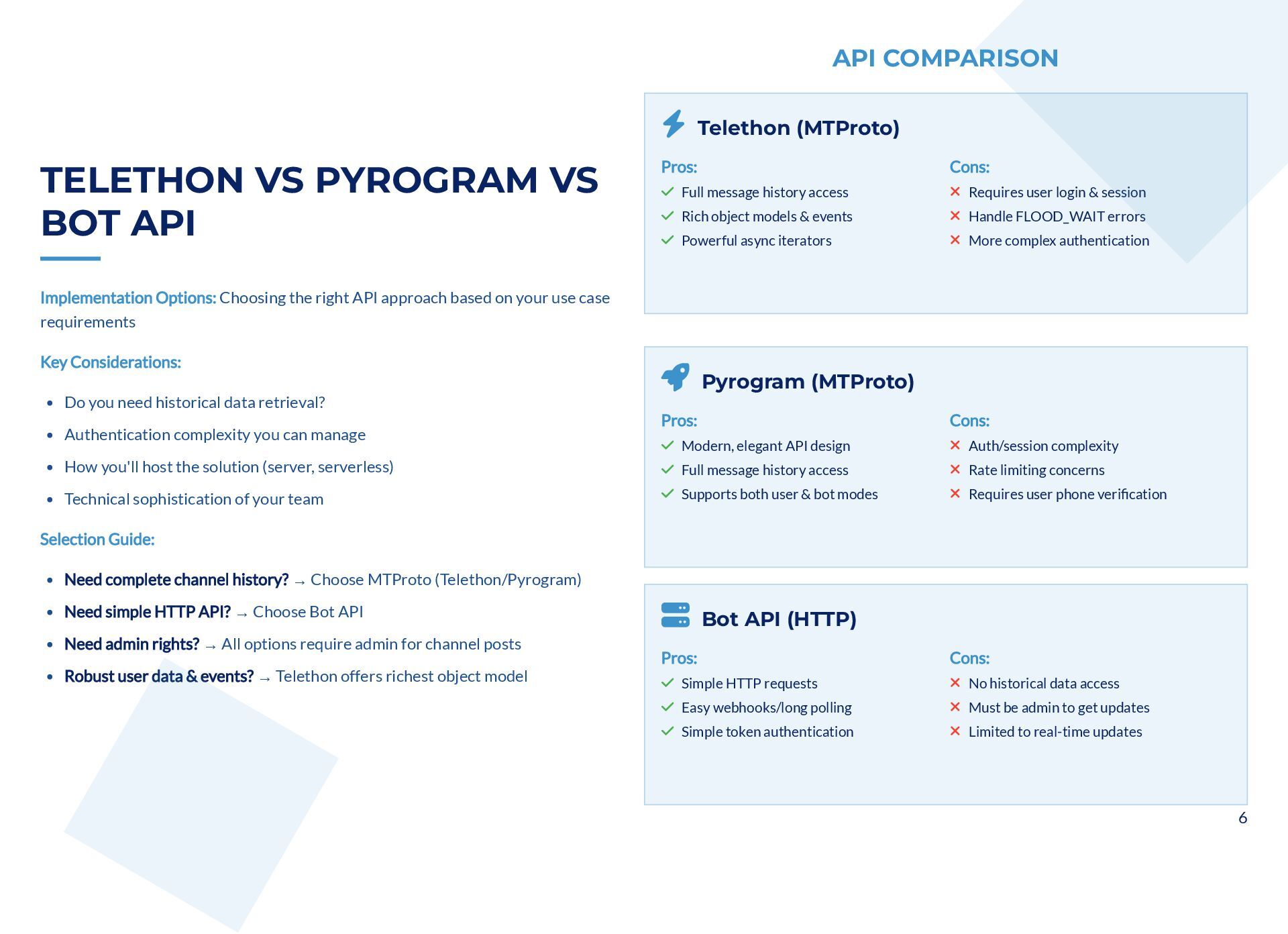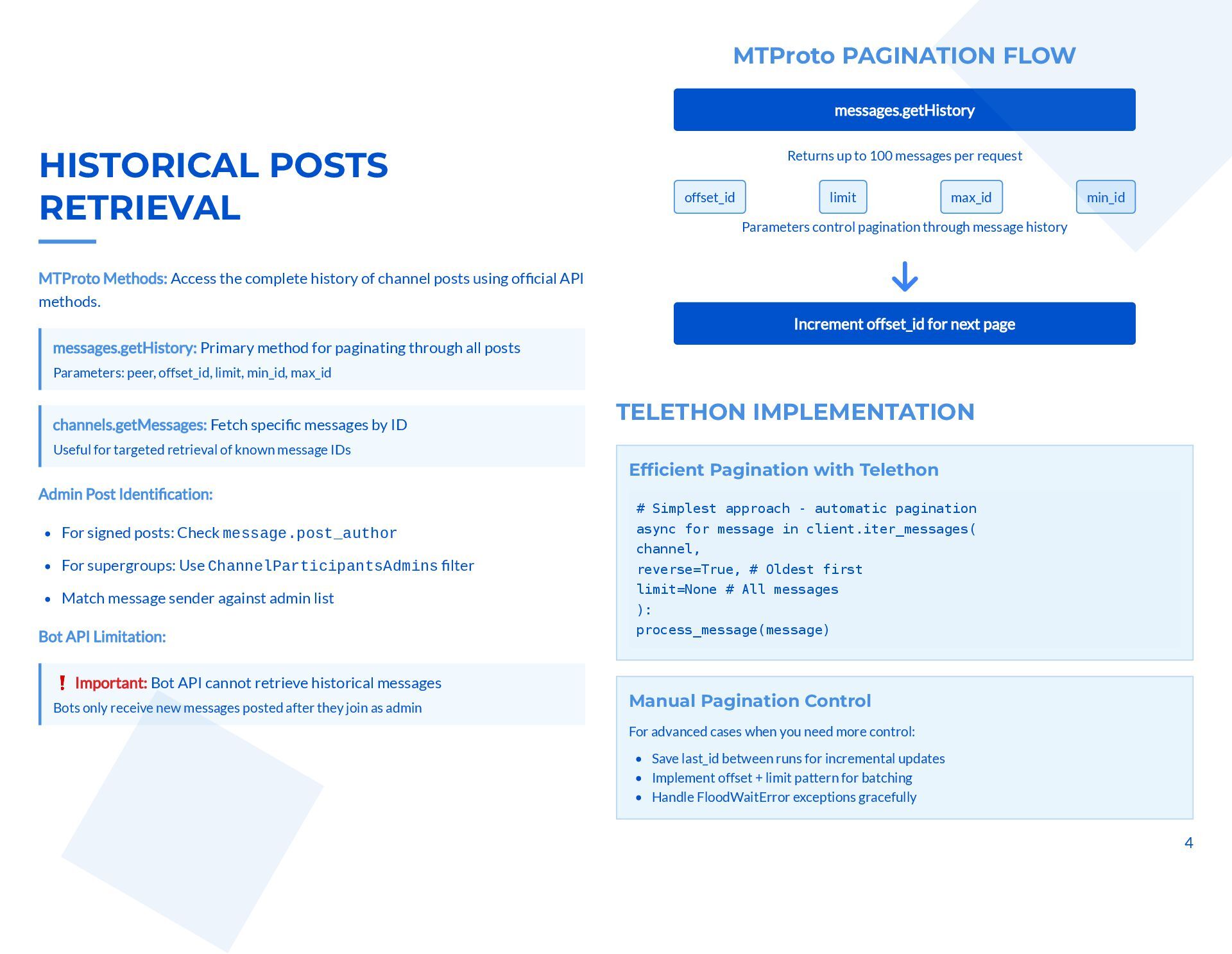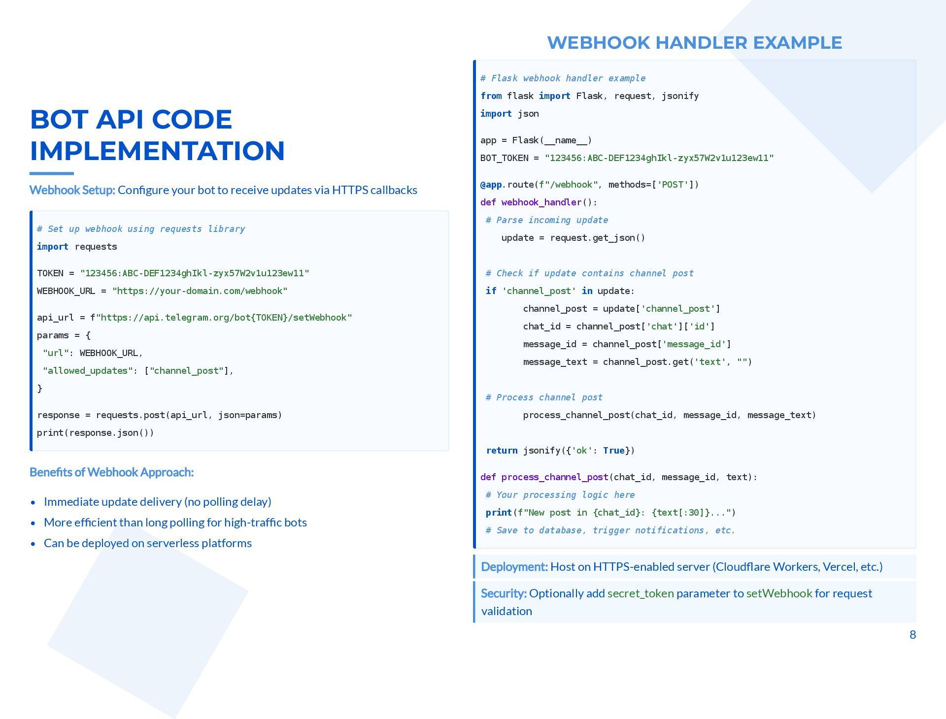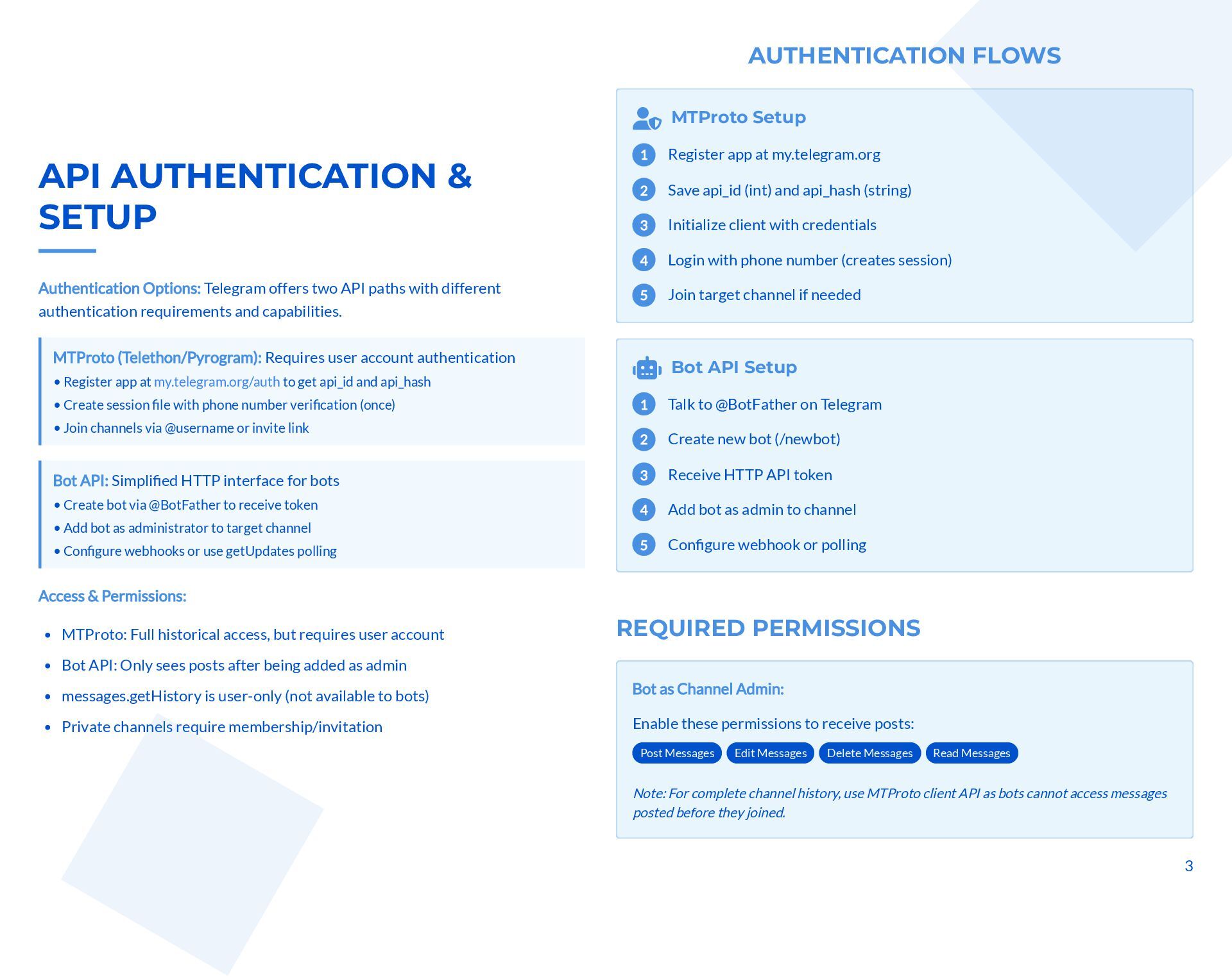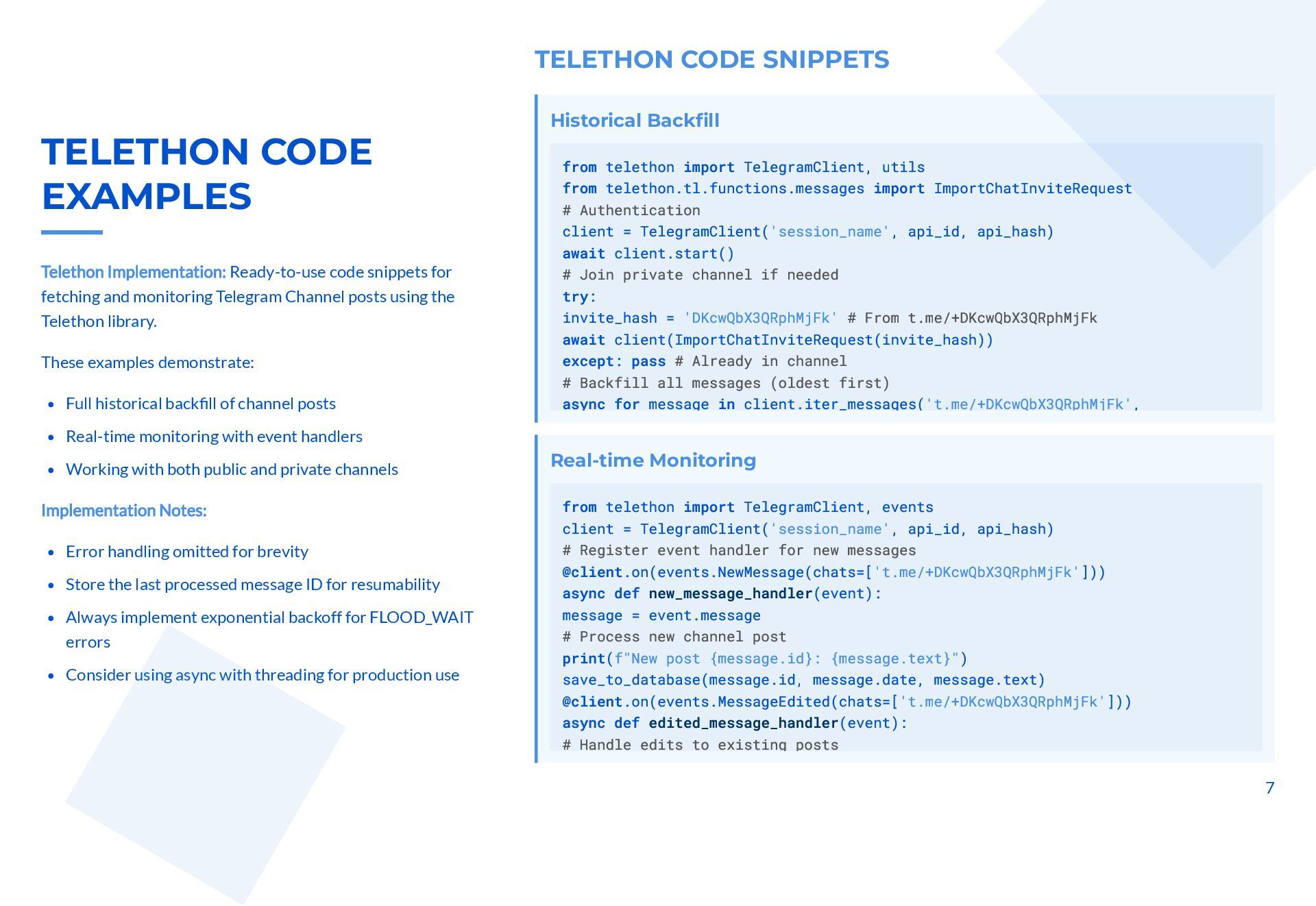 This slide deck is a technical guide to fully archiving admin posts from a Telegram channel while also monitoring new posts in real time. It explains the differences between the MTProto client APIs (Telethon / Pyrogram) and the Bot API, how to authenticate, how to retrieve message history using methods like messages.getHistory and iter_messages, and how to monitor updates via webhooks, long polling, or Telethon events. It also introduces workflow examples using n8n for saving to a database, cross-posting, and alerts, plus best practices for production such as handling rate limits and backing off when FloodWait errors occur.