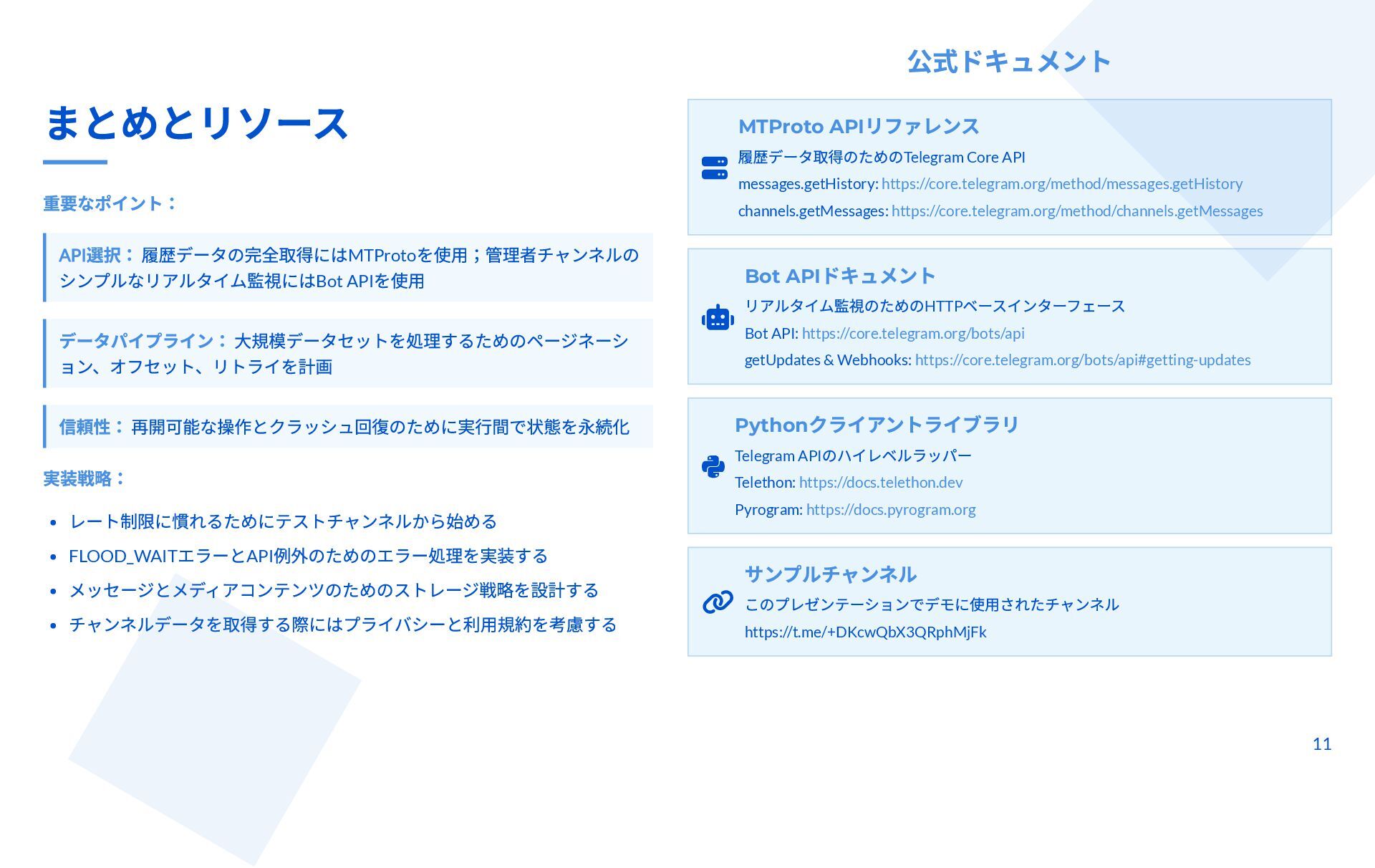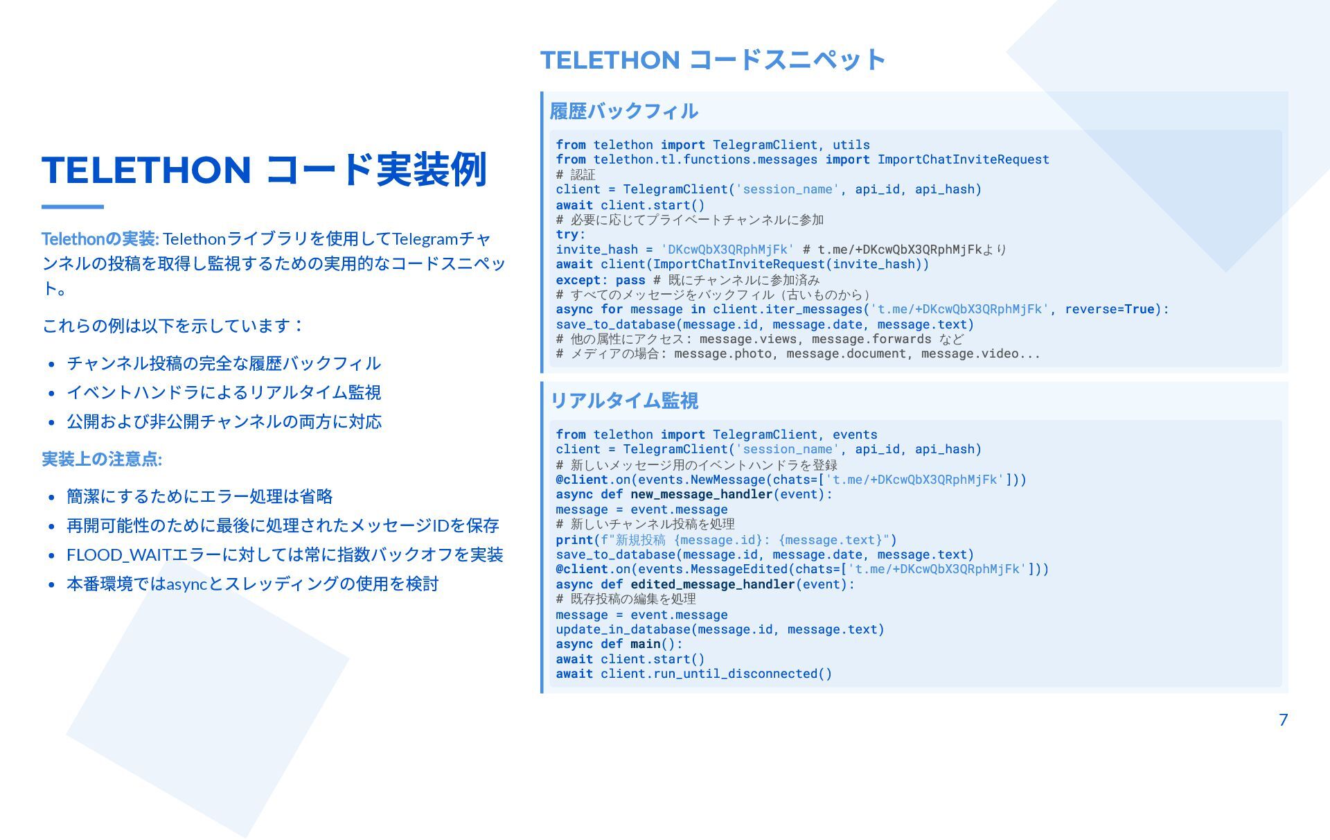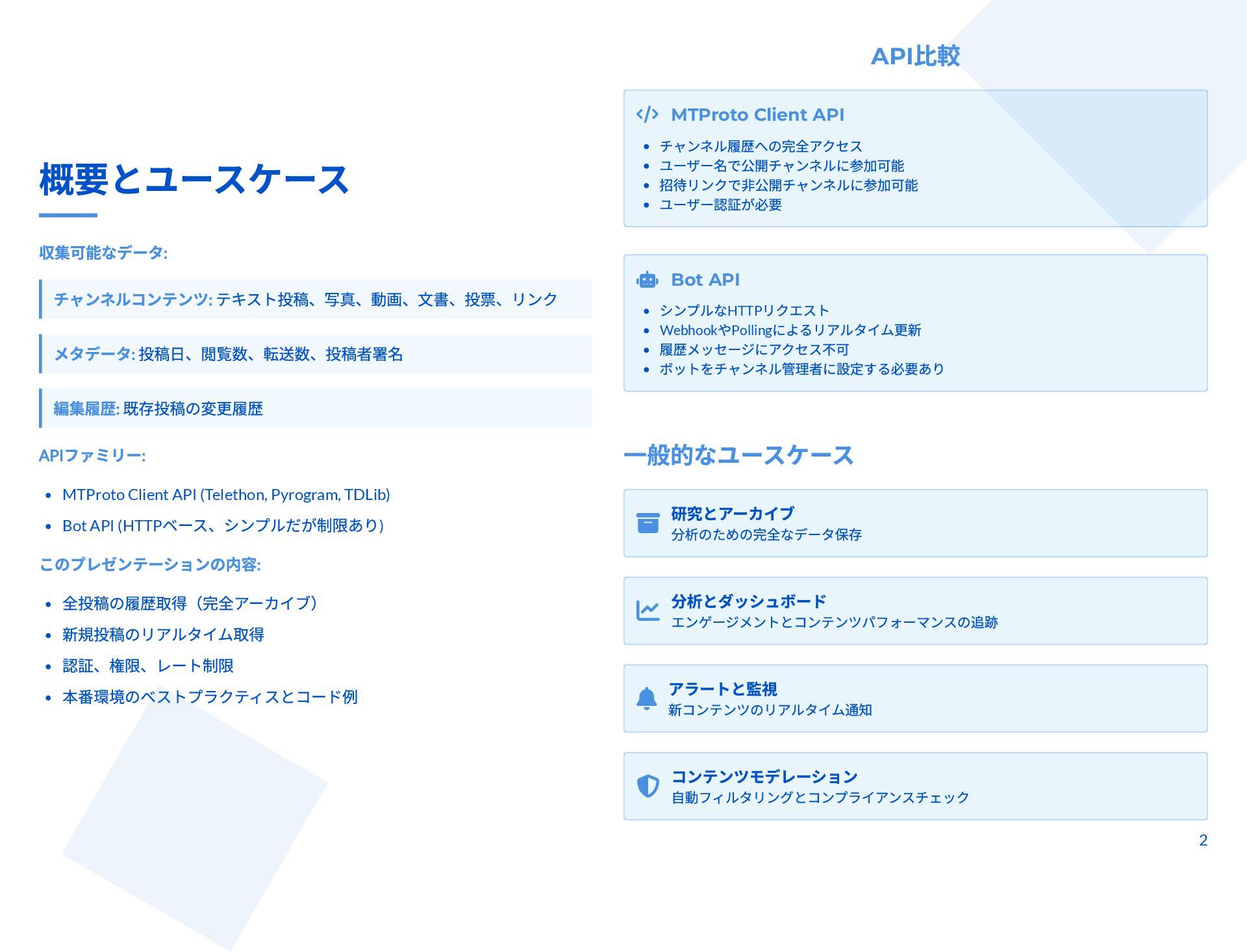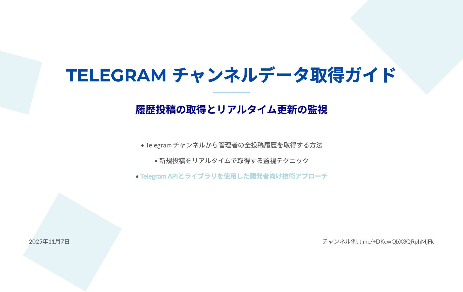 本スライドは、Telegram チャンネルから管理者投稿を完全アーカイブしつつ、新規投稿をリアルタイム監視するための技術ガイドです。MTProto クライアント API(Telethon / Pyrogram)と Bot API の違いと認証手順、messages.getHistory や iter_messages による履歴取得方法、Webhook/ロングポーリングや Telethon のイベントを使った監視手法を解説します。 さらに、n8n によるDB保存・クロスポスト・アラートなどのワークフロー事例と、レート制限・FloodWait発生時のバックオフなど本番運用のベストプラクティスが整理されています。