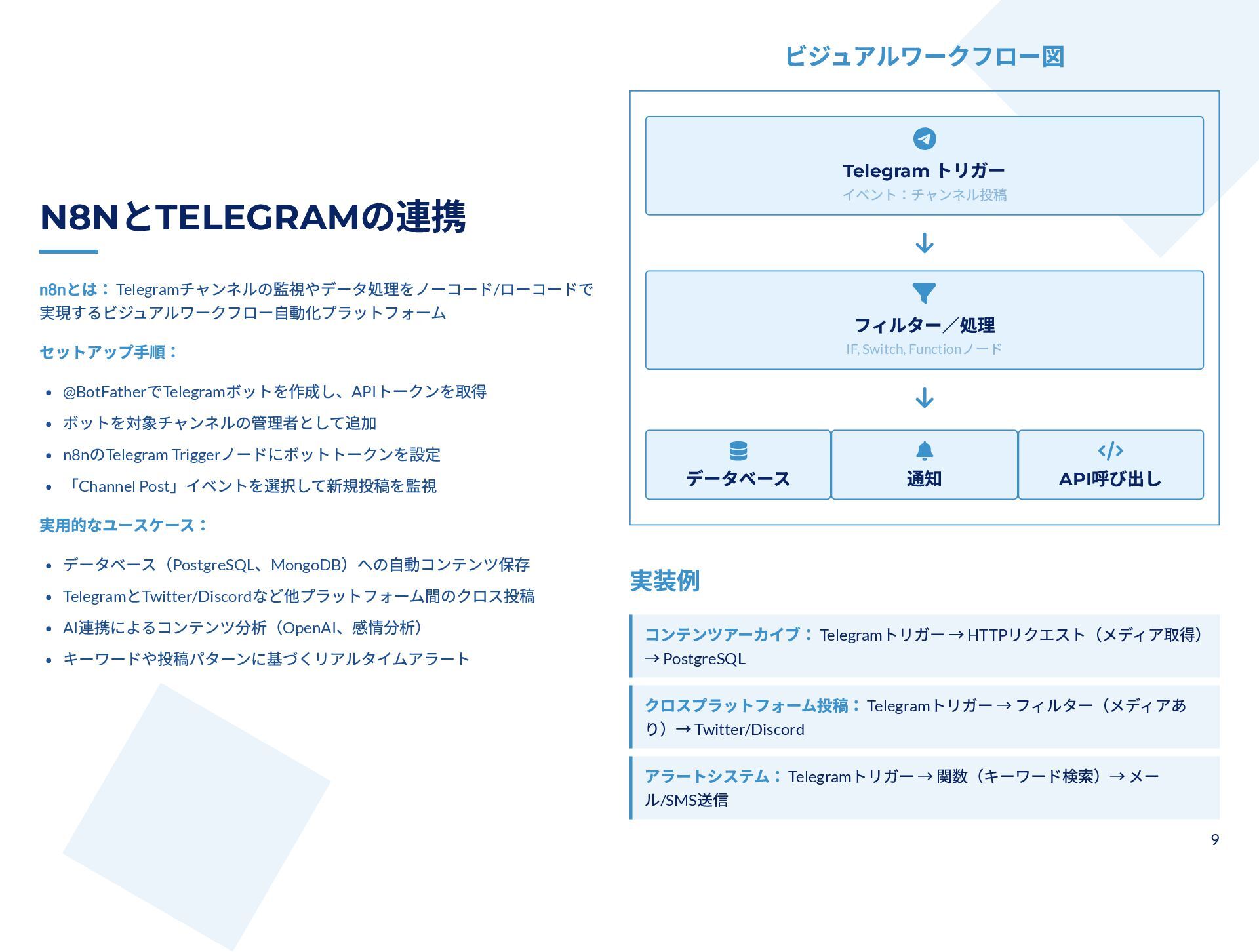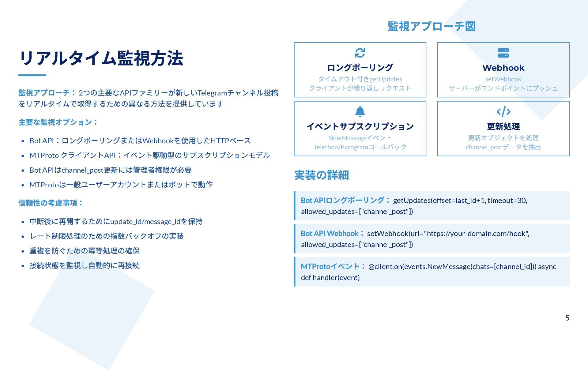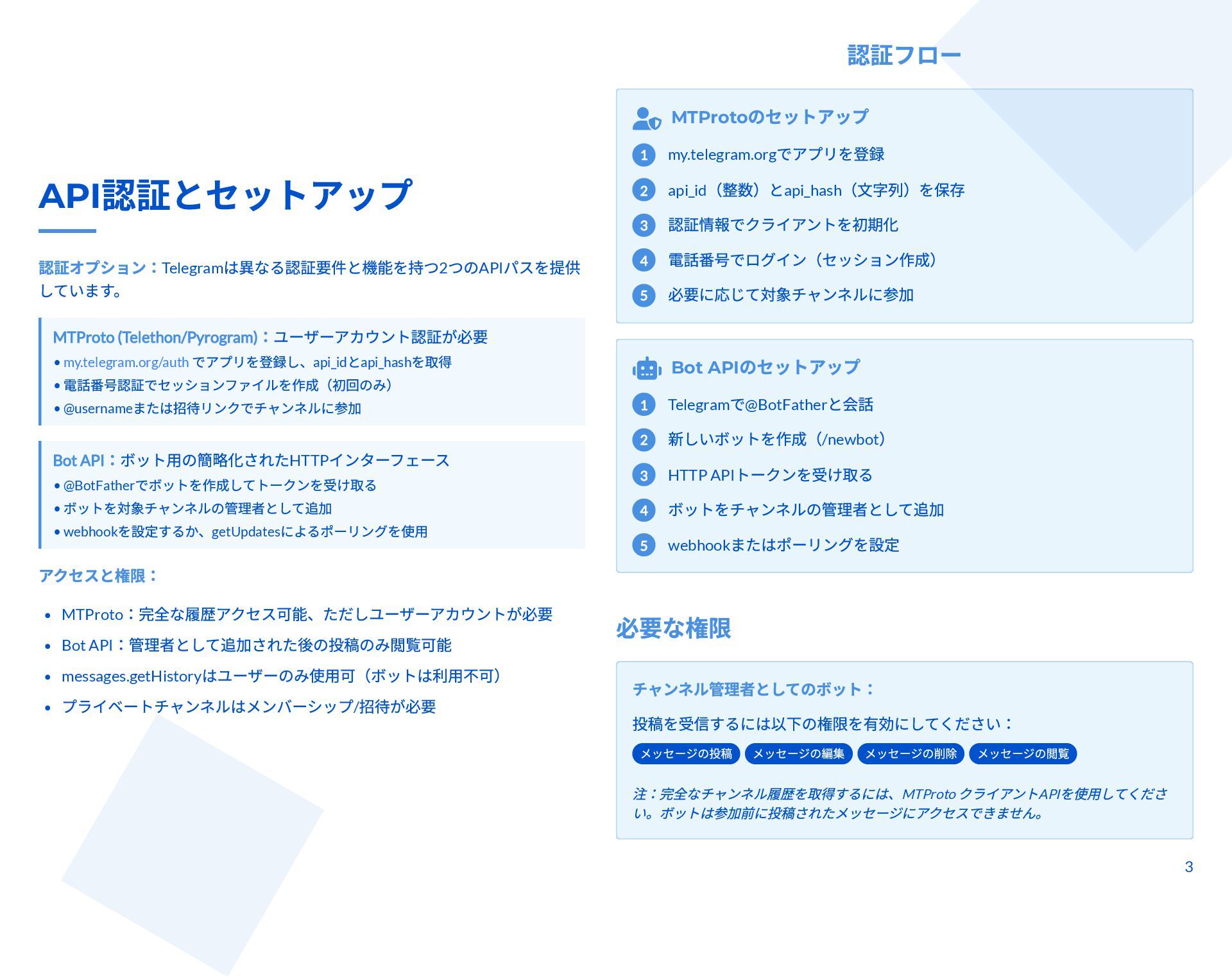 本スライドは、Telegram チャンネルから管理者投稿を完全アーカイブしつつ、新規投稿をリアルタイム監視するための技術ガイドです。MTProto クライアント API(Telethon / Pyrogram)と Bot API の違いと認証手順、messages.getHistory や iter_messages による履歴取得方法、Webhook/ロングポーリングや Telethon のイベントを使った監視手法を解説します。 さらに、n8n によるDB保存・クロスポスト・アラートなどのワークフロー事例と、レート制限・FloodWait発生時のバックオフなど本番運用のベストプラクティスが整理されています。