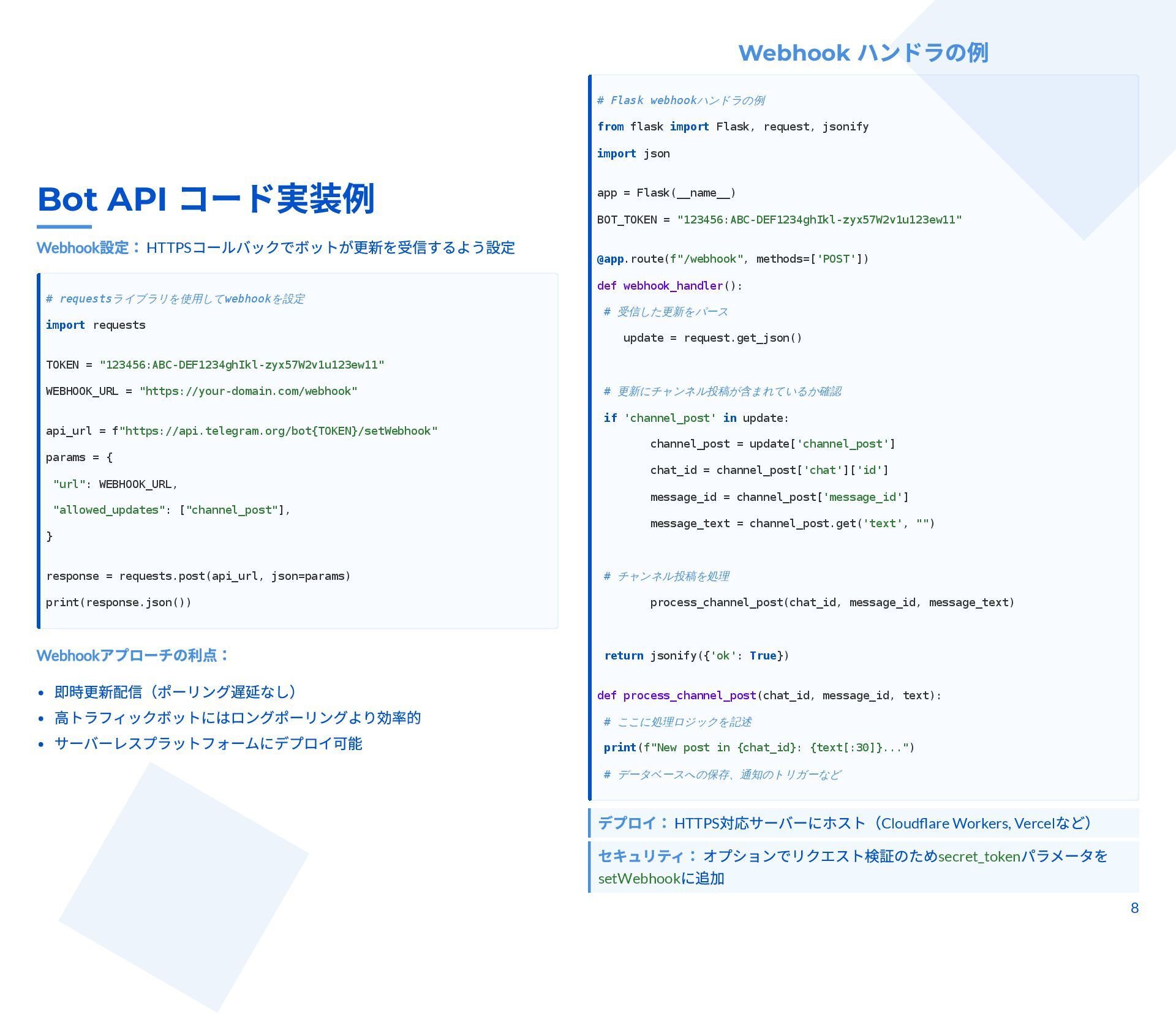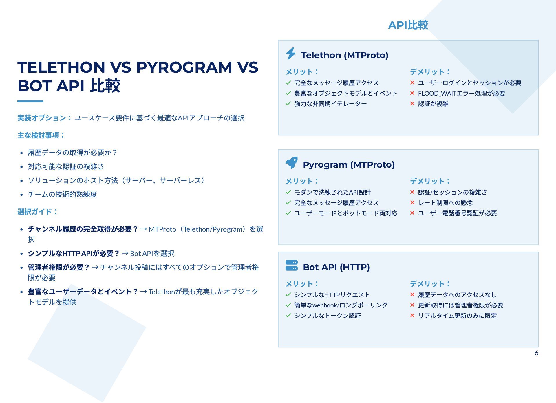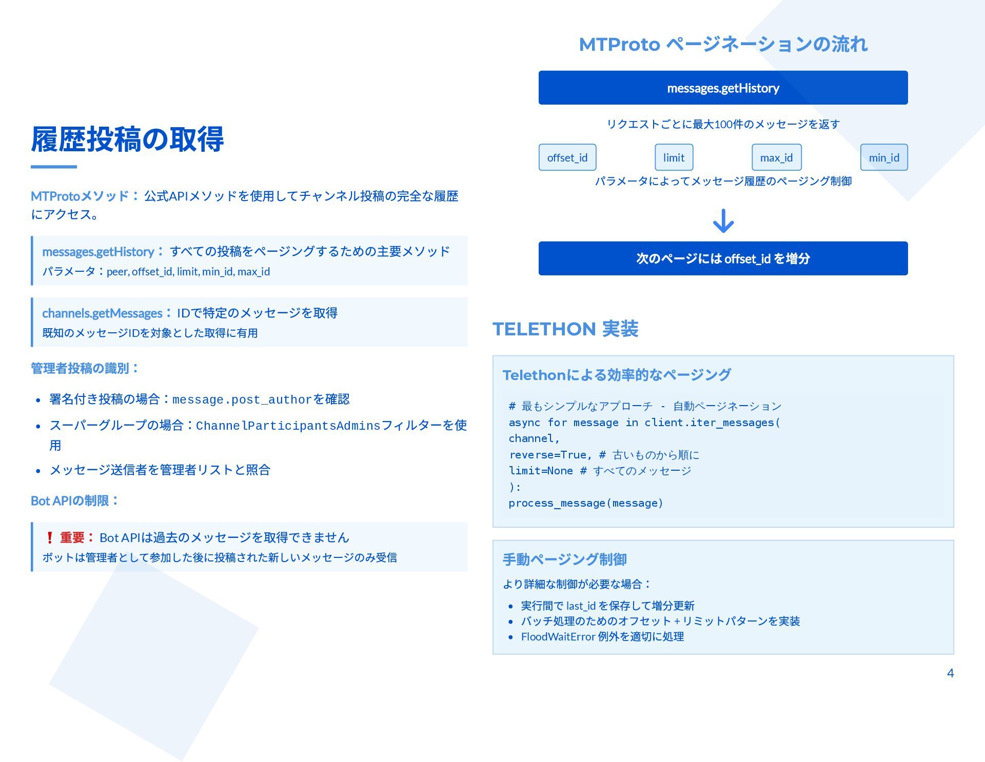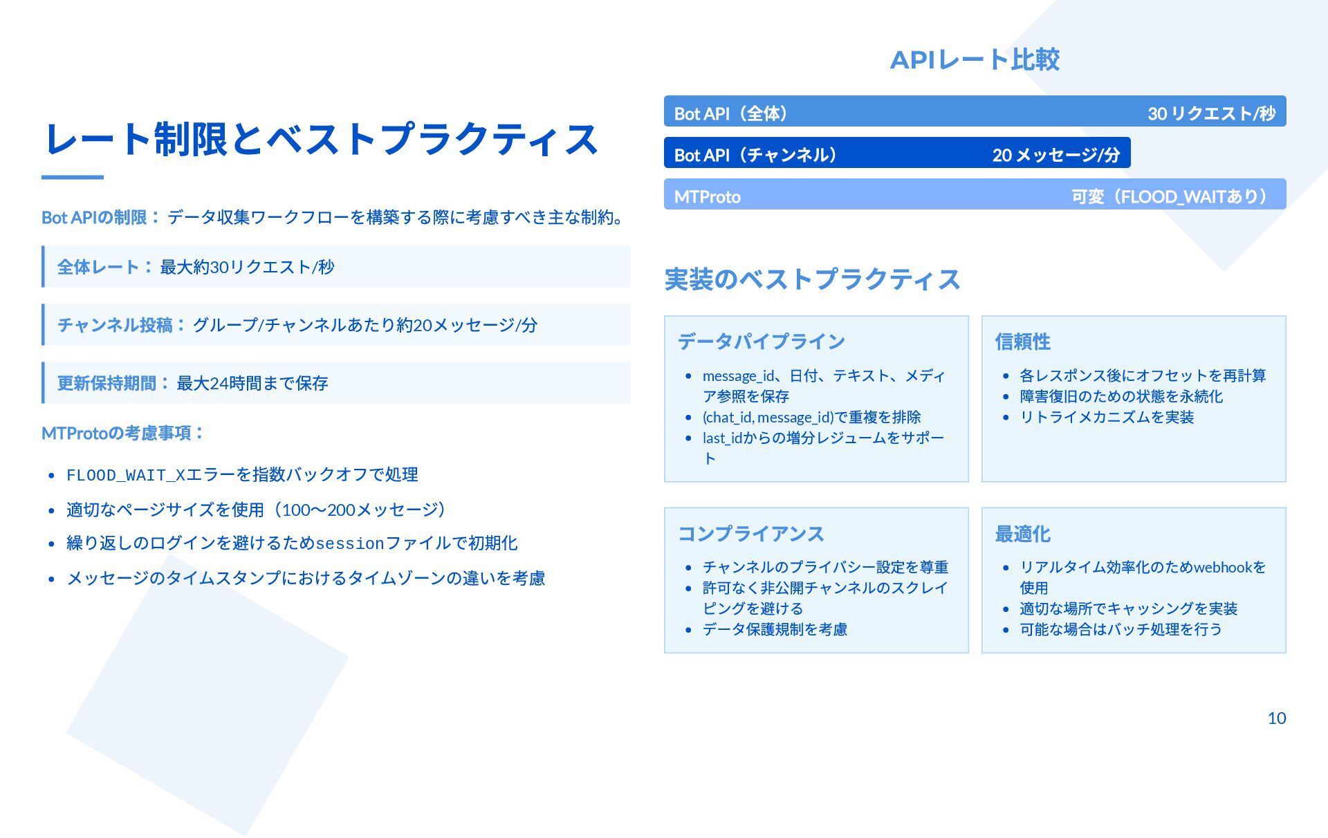 本スライドは、Telegram チャンネルから管理者投稿を完全アーカイブしつつ、新規投稿をリアルタイム監視するための技術ガイドです。MTProto クライアント API(Telethon / Pyrogram)と Bot API の違いと認証手順、messages.getHistory や iter_messages による履歴取得方法、Webhook/ロングポーリングや Telethon のイベントを使った監視手法を解説します。 さらに、n8n によるDB保存・クロスポスト・アラートなどのワークフロー事例と、レート制限・FloodWait発生時のバックオフなど本番運用のベストプラクティスが整理されています。