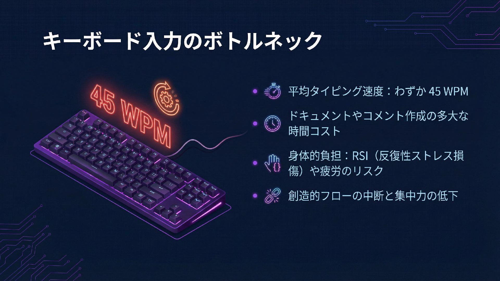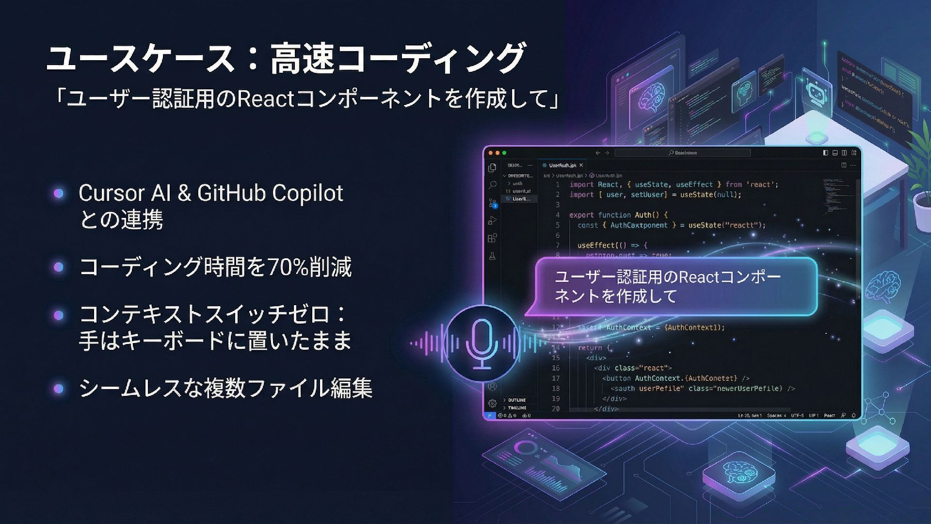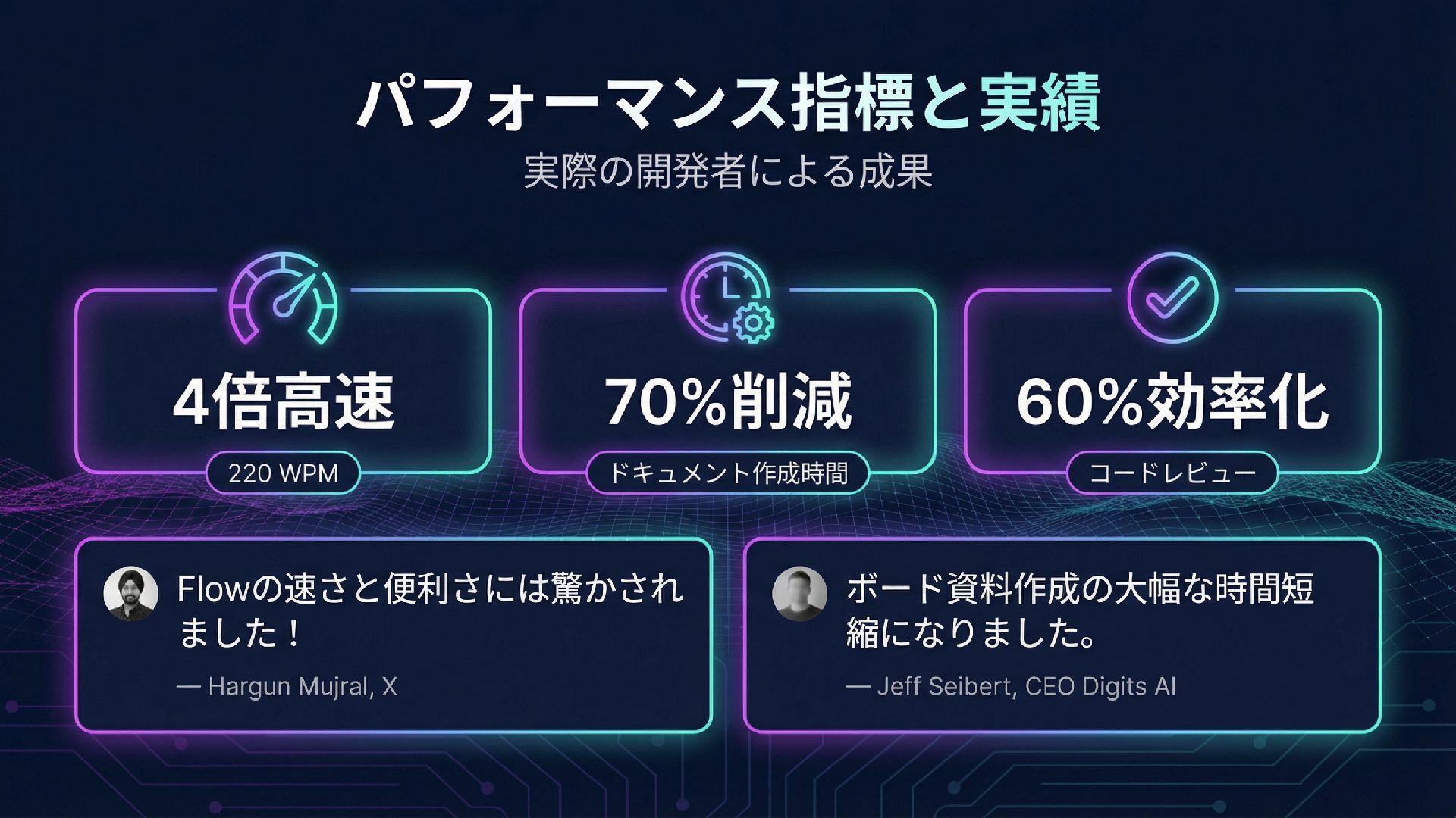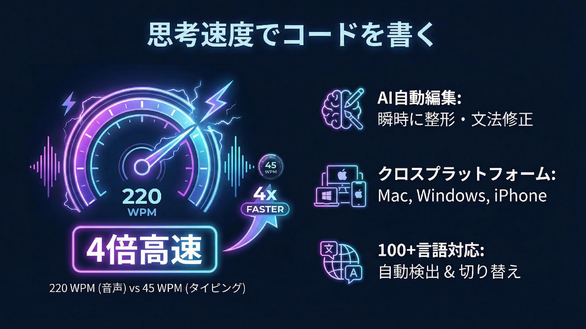 Wispr Flowは、エンジニアが自然言語で音声コマンドを送ることで、タイピングの4倍速(220 WPM)でコーディングできるボイスディクテーションツールです。AI自動編集、個人辞書、クロスプラットフォーム対応、Cursor・Copilot・Warpとの統合を備えています。生産性向上だけでなく、RSI予防や身体障害者への対応も実現し、「Vibe Coding」という新しい開発パラダイムの実装を通じて、エンジニアの未来の働き方を変革します。