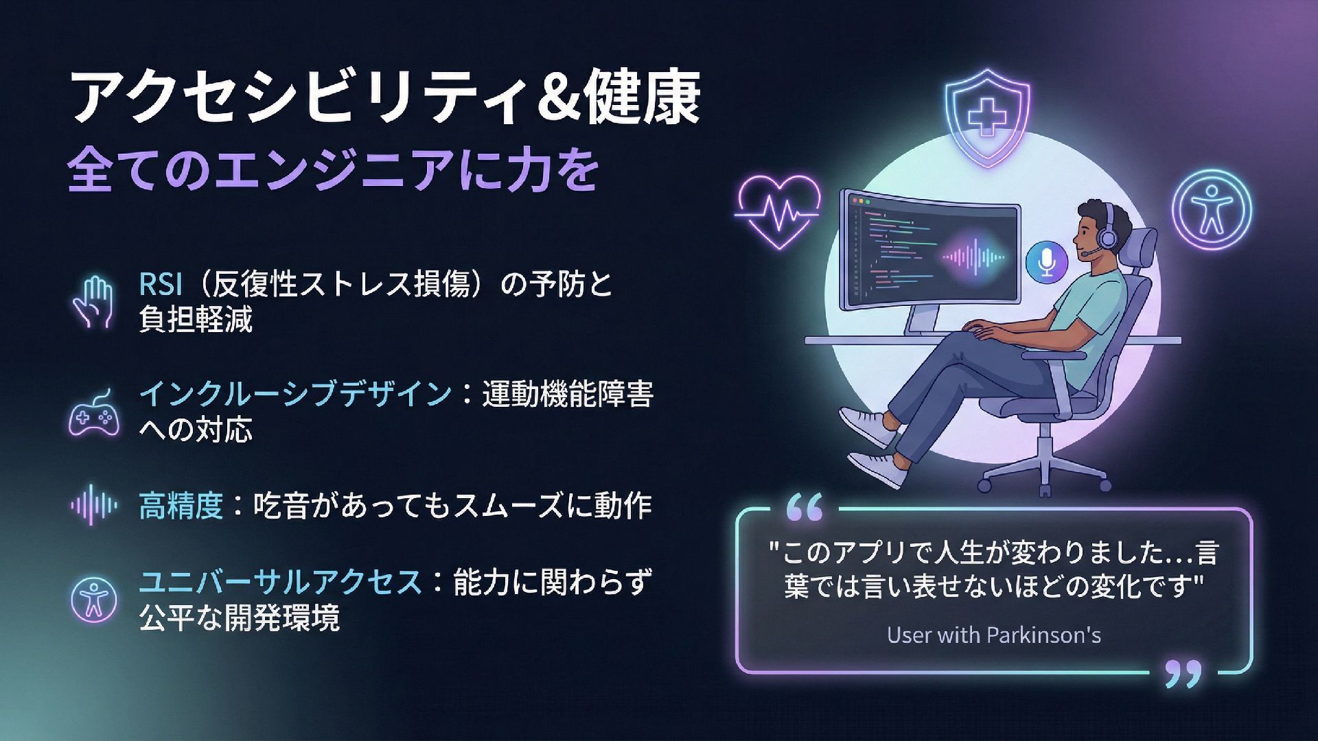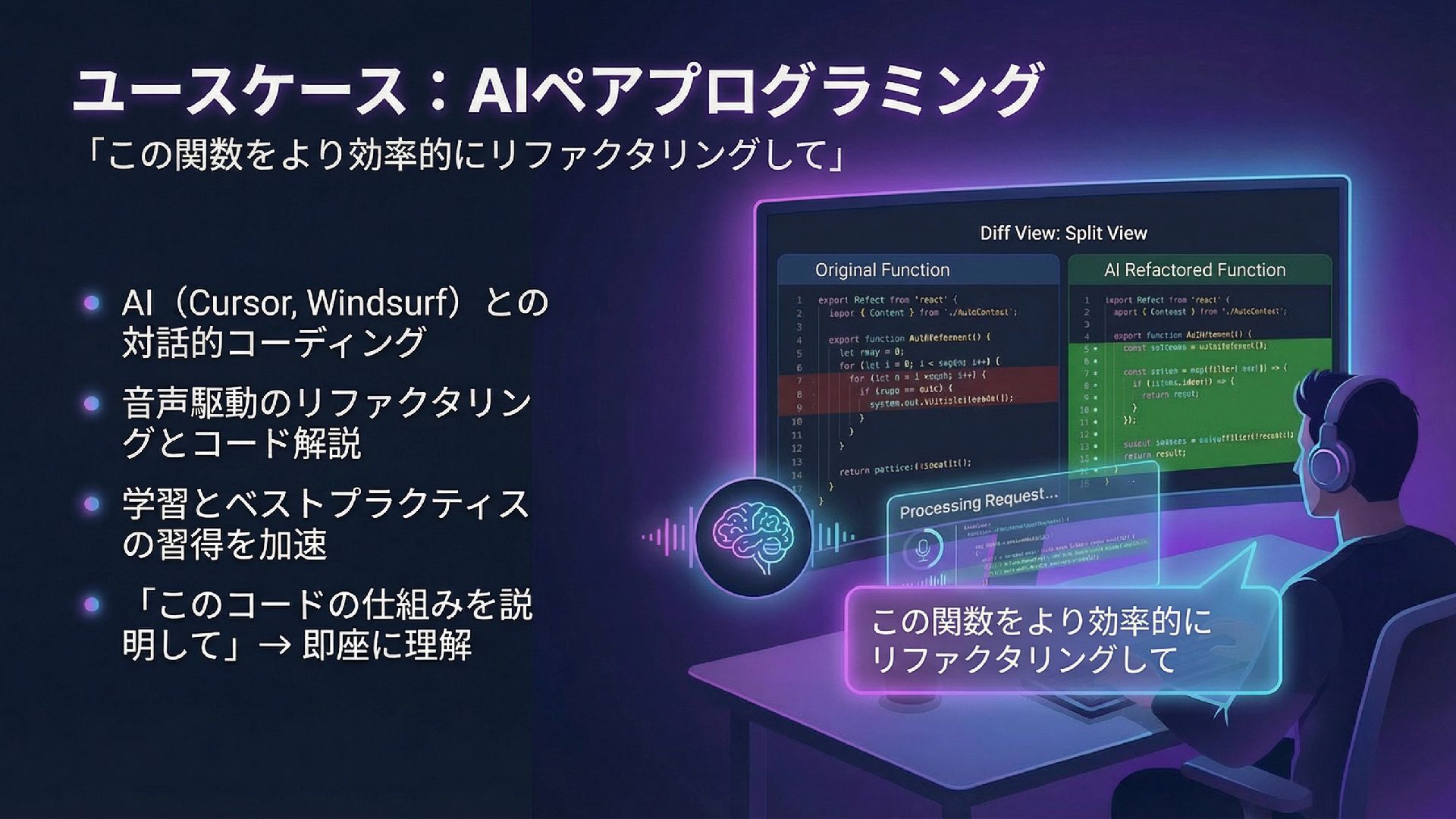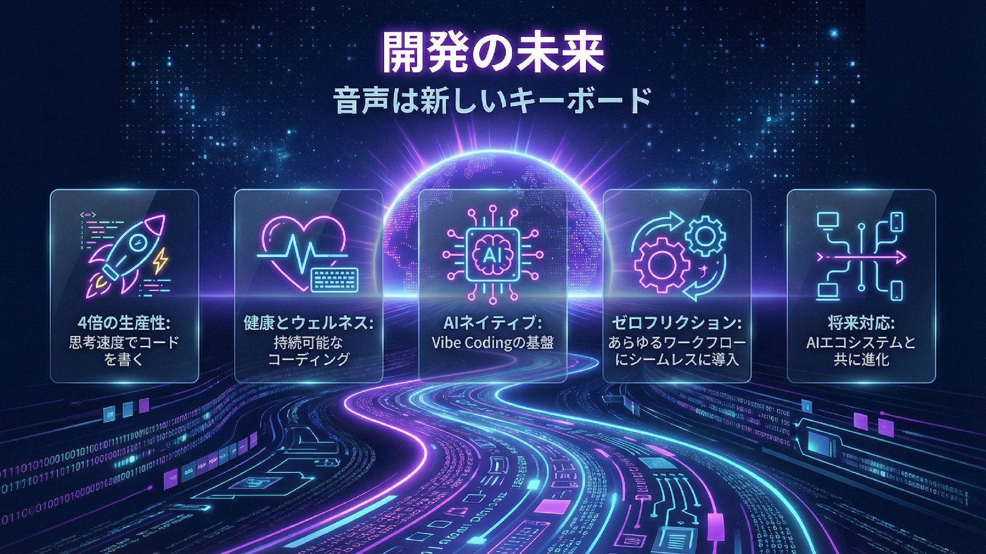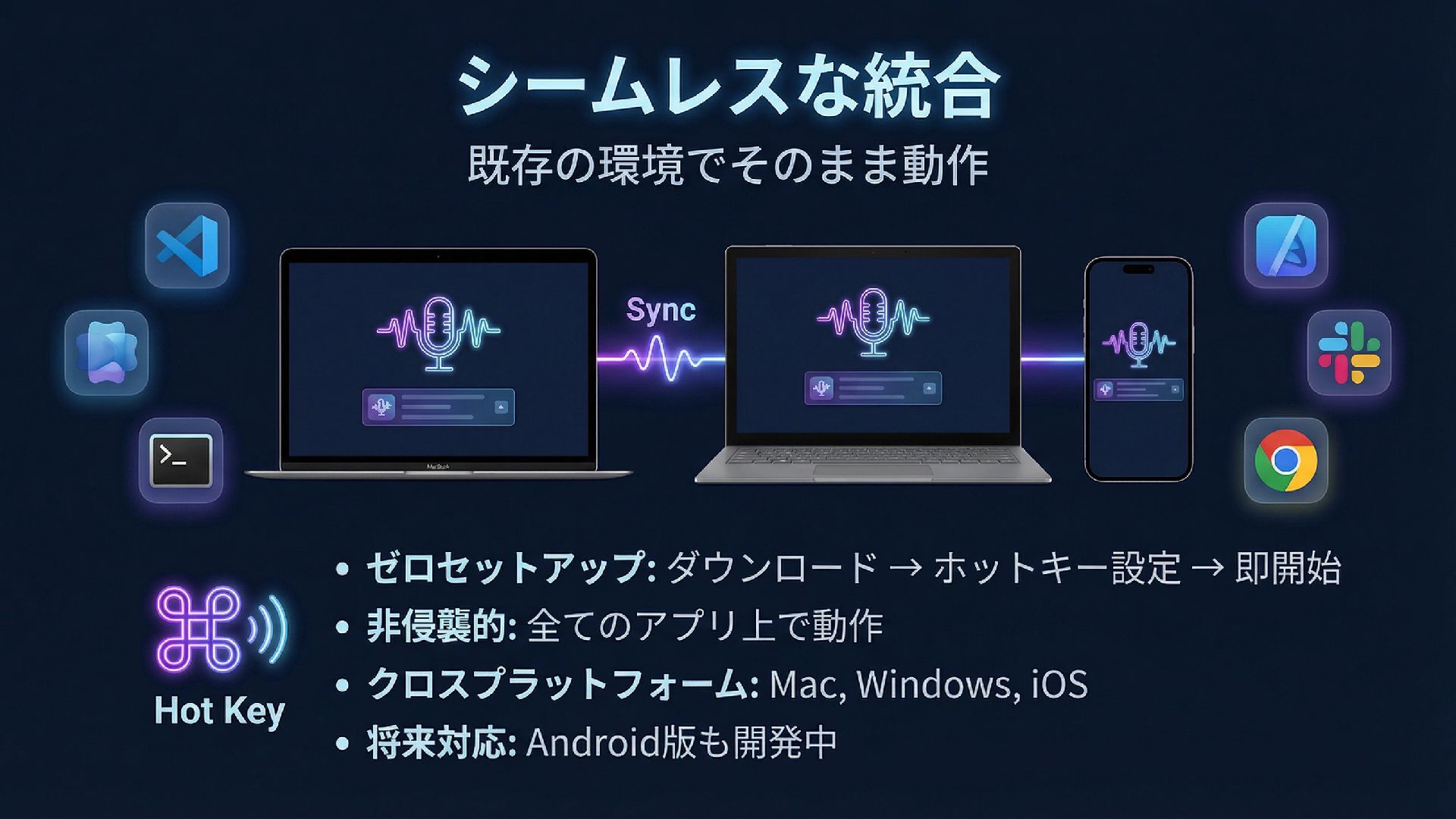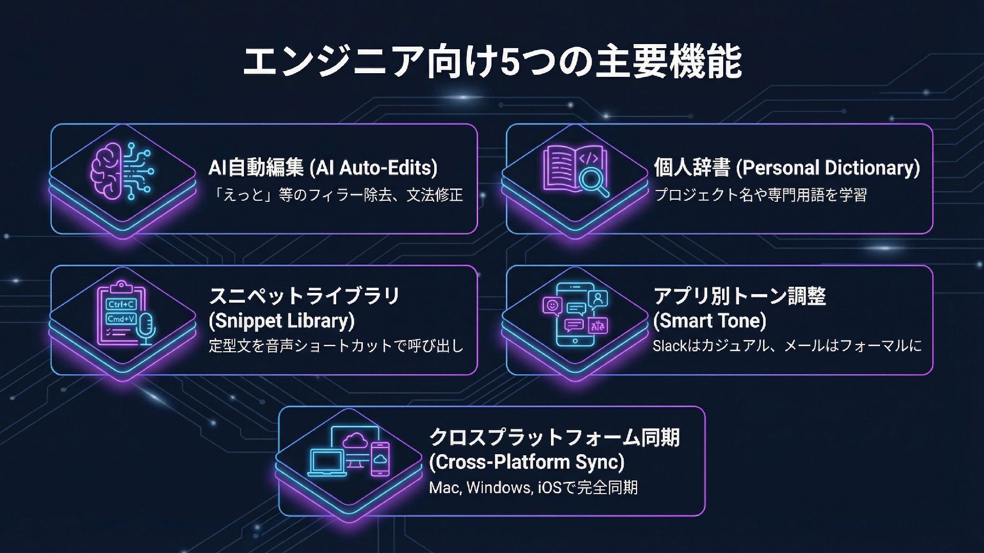 Wispr Flowは、エンジニアが自然言語で音声コマンドを送ることで、タイピングの4倍速(220 WPM)でコーディングできるボイスディクテーションツールです。AI自動編集、個人辞書、クロスプラットフォーム対応、Cursor・Copilot・Warpとの統合を備えています。生産性向上だけでなく、RSI予防や身体障害者への対応も実現し、「Vibe Coding」という新しい開発パラダイムの実装を通じて、エンジニアの未来の働き方を変革します。
