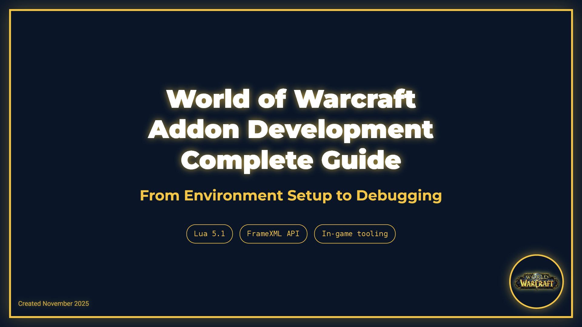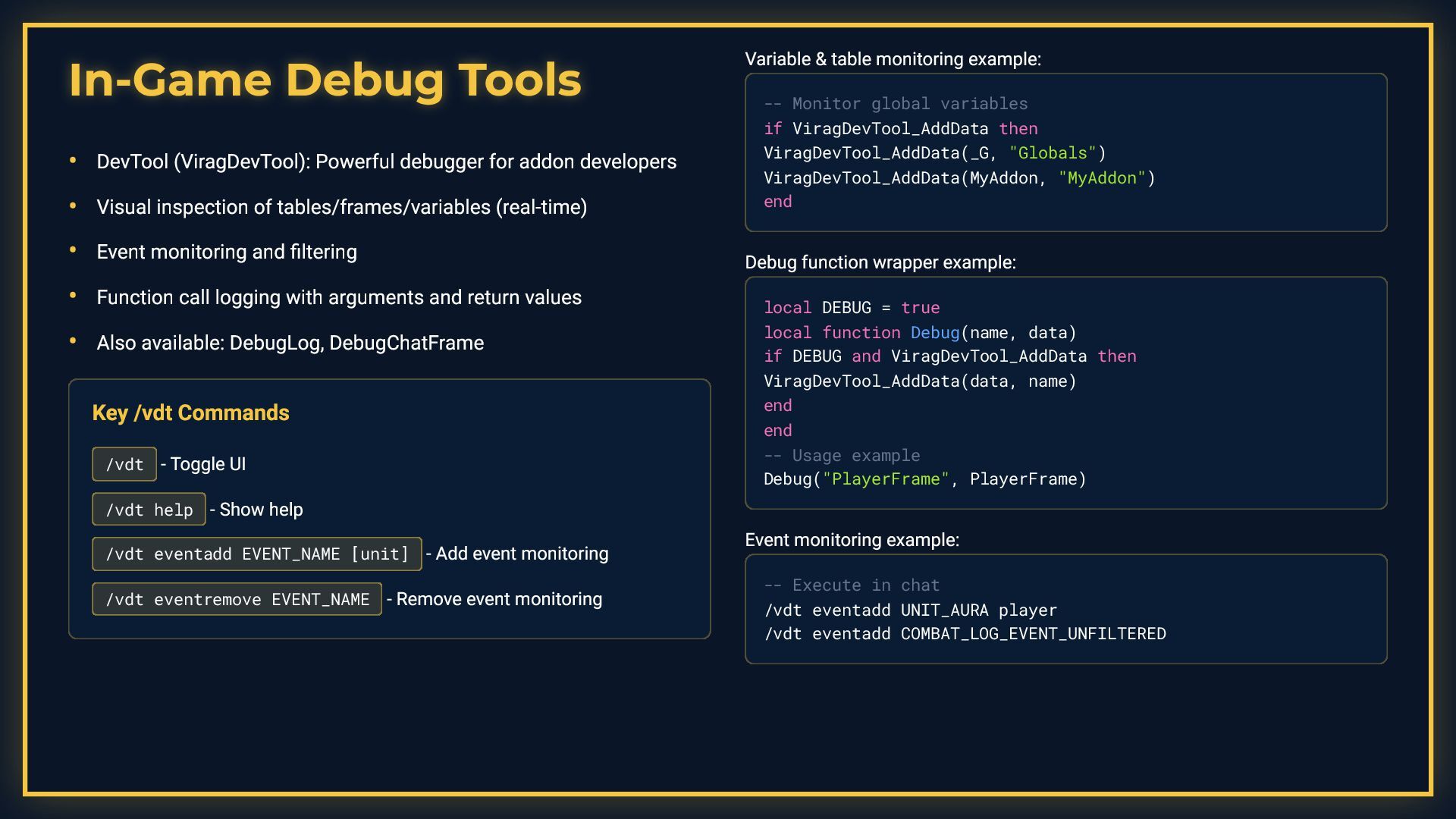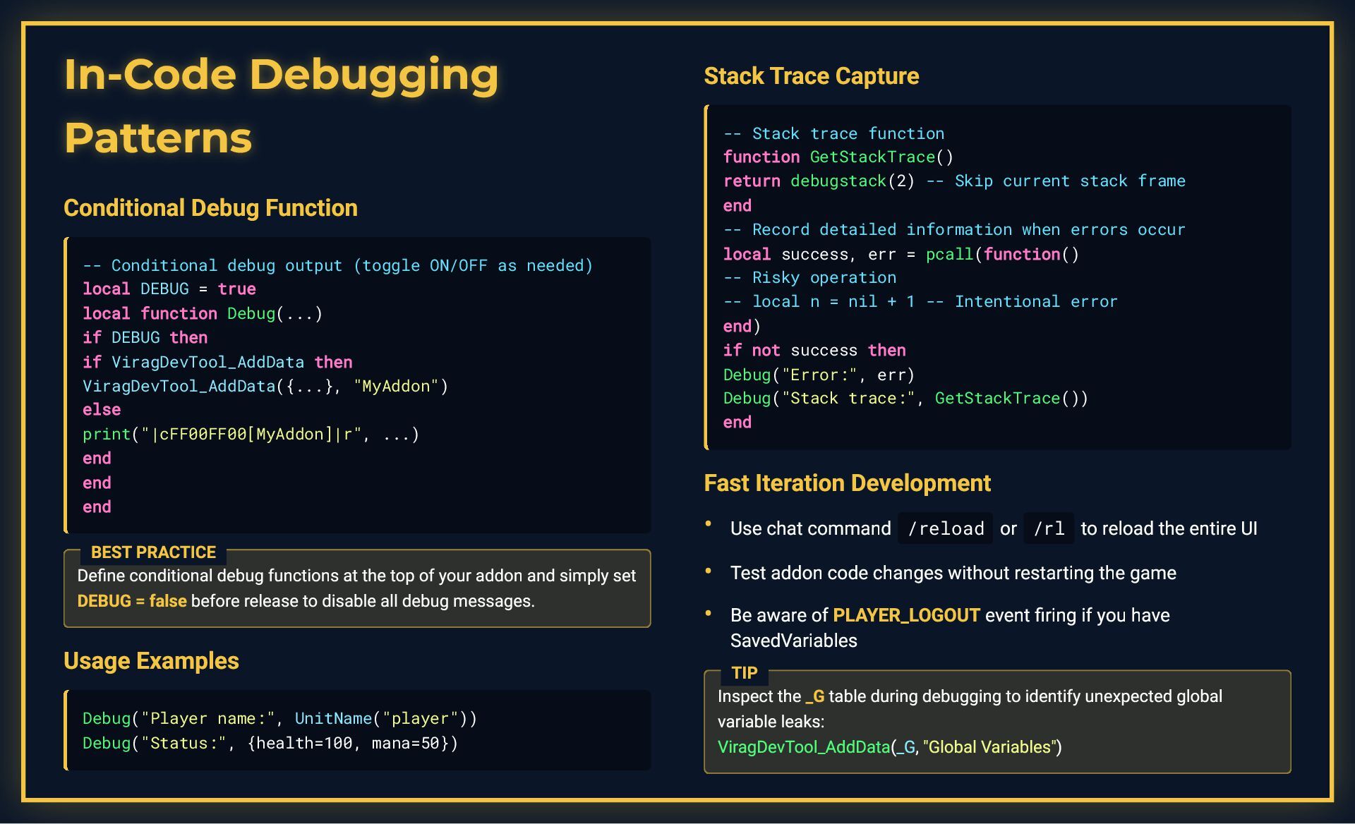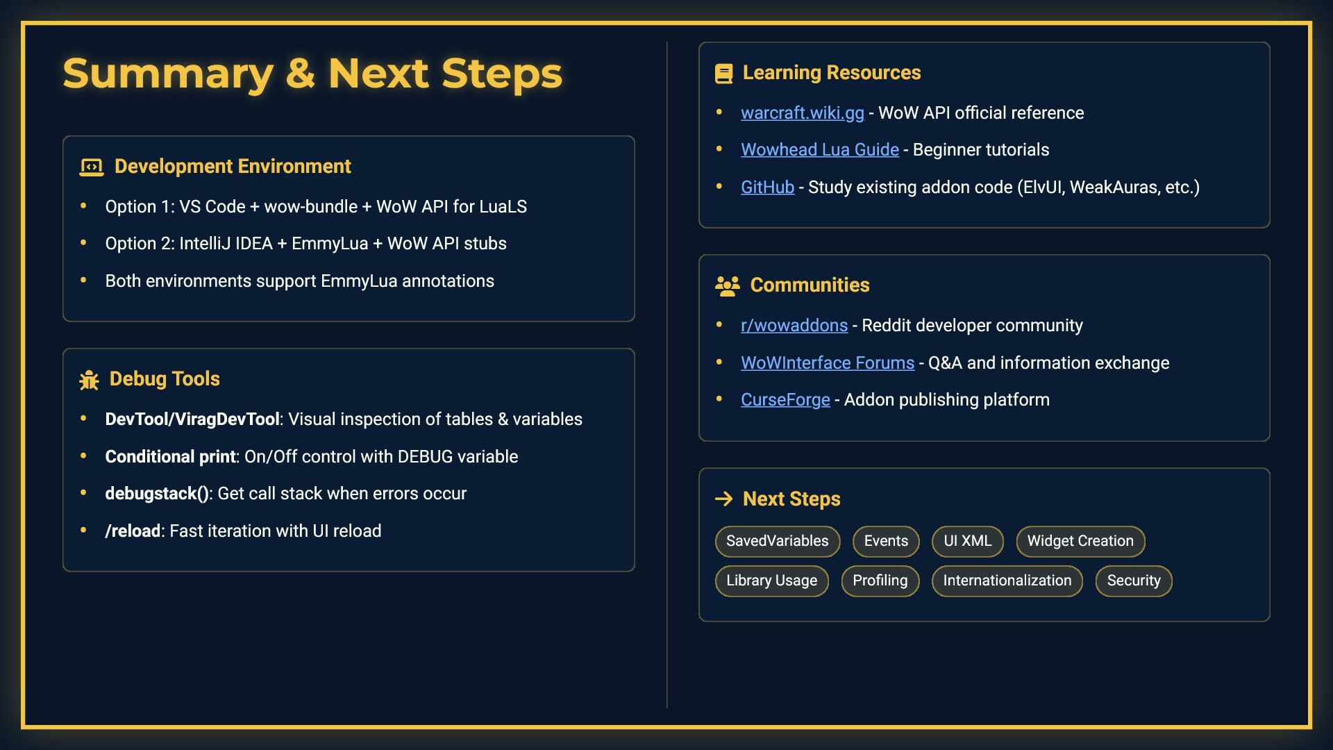 This presentation is a comprehensive guide to World of Warcraft addon development, covering essential development practices. It demonstrates debugging techniques including conditional debug output with toggleable flags, stack trace capture for error tracking, and integration with tools like ViragDevTool. The guide emphasizes fast iteration development using the /reload command to test changes without restarting the game, while noting important considerations like SavedVariables and PLAYER_LOGOUT events. It also covers best practices for identifying global variable leaks by inspecting the _G table, helping developers maintain clean and efficient addon code.