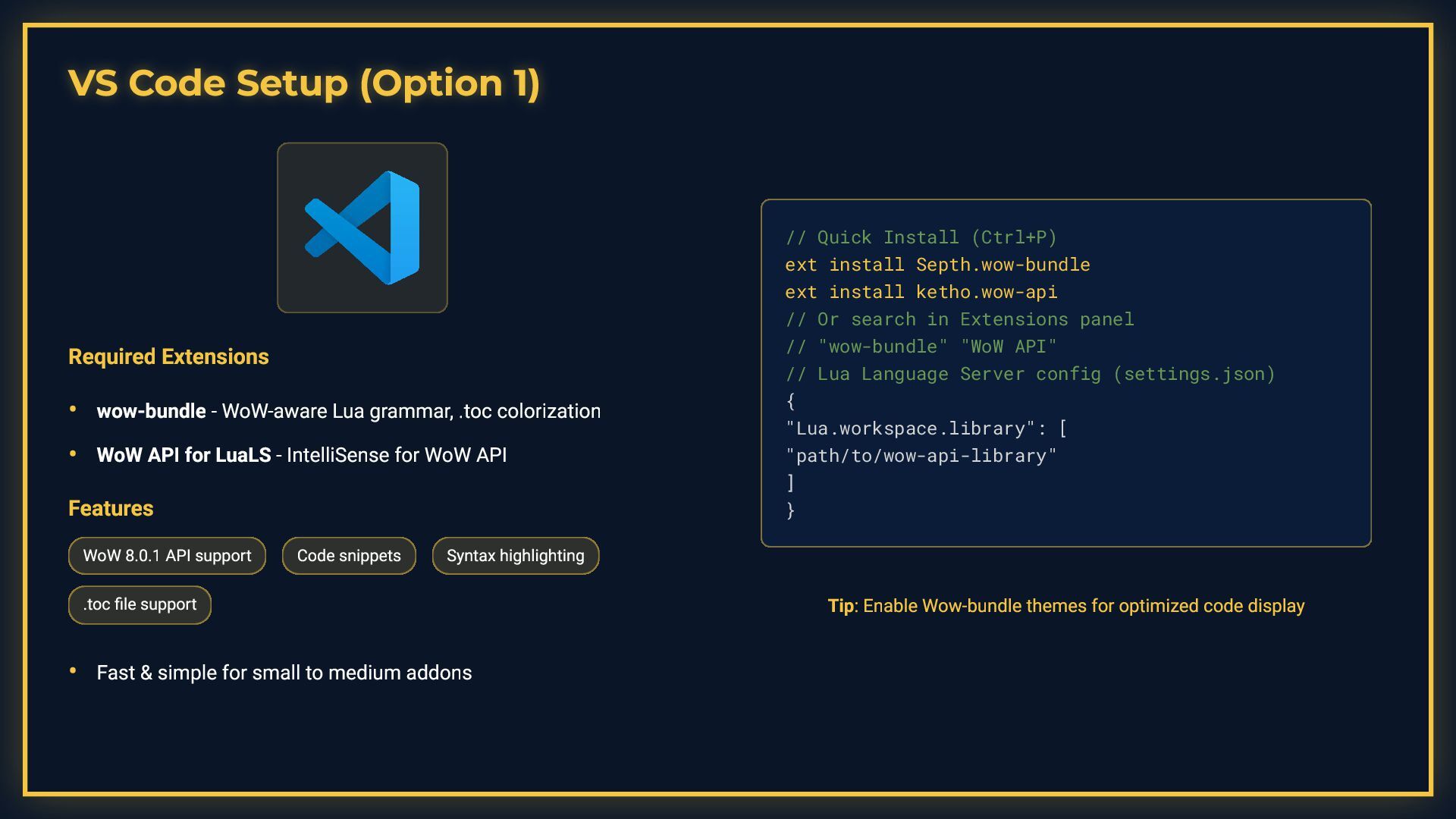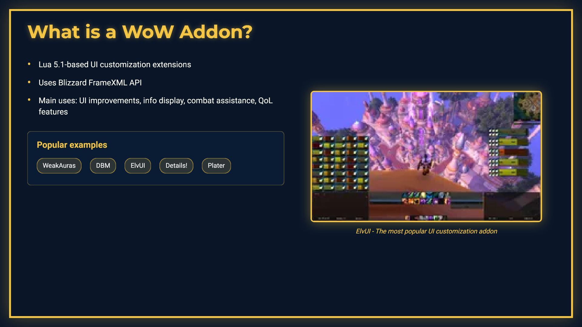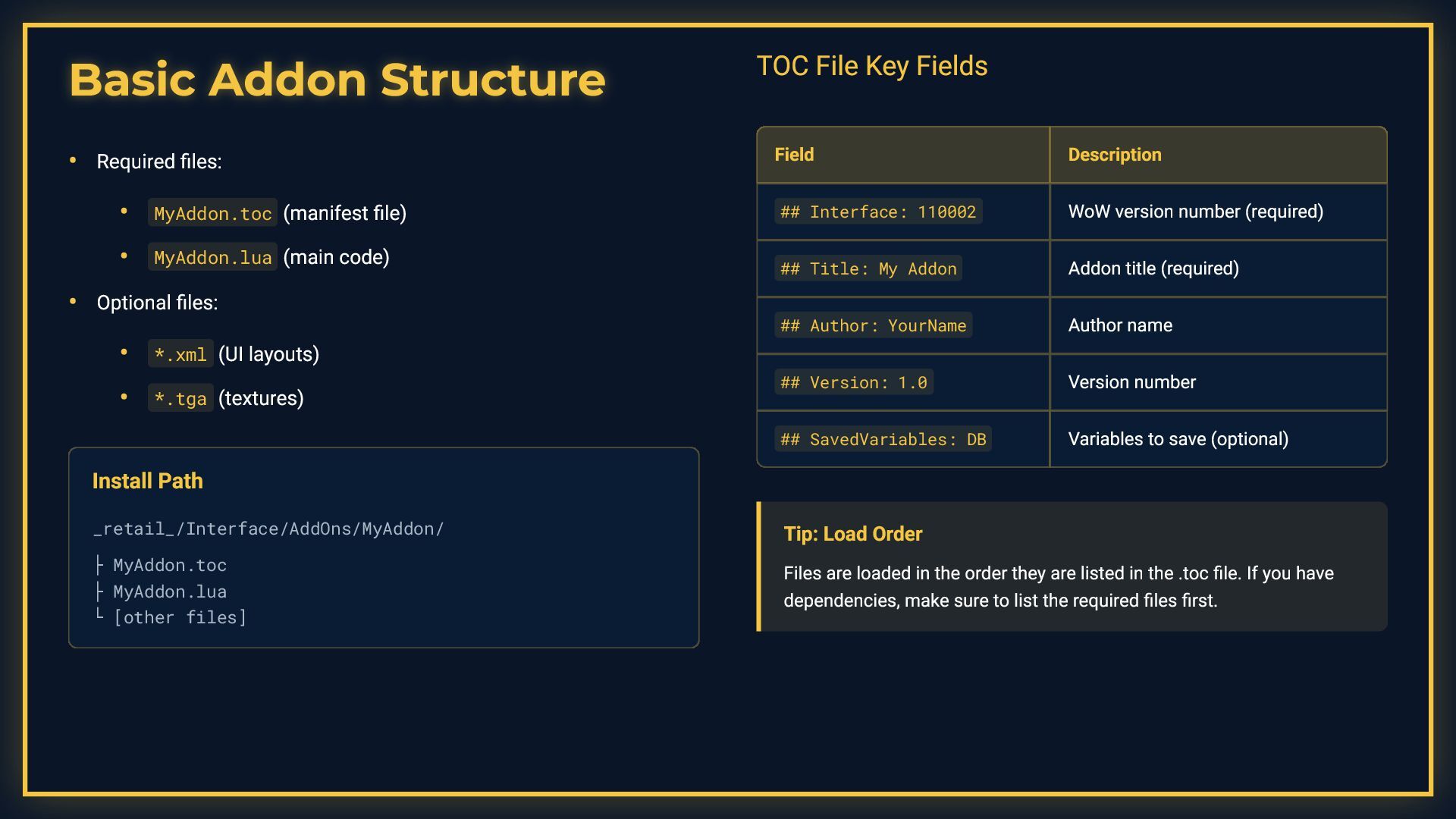 This presentation is a comprehensive guide to World of Warcraft addon development, covering essential development practices. It demonstrates debugging techniques including conditional debug output with toggleable flags, stack trace capture for error tracking, and integration with tools like ViragDevTool. The guide emphasizes fast iteration development using the /reload command to test changes without restarting the game, while noting important considerations like SavedVariables and PLAYER_LOGOUT events. It also covers best practices for identifying global variable leaks by inspecting the _G table, helping developers maintain clean and efficient addon code.