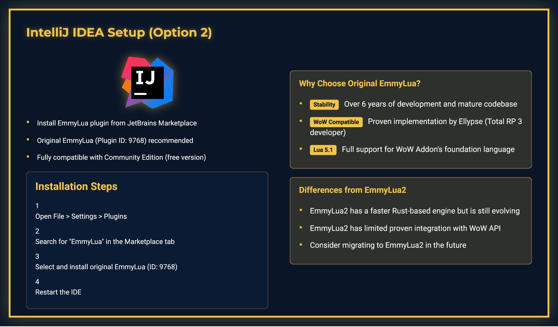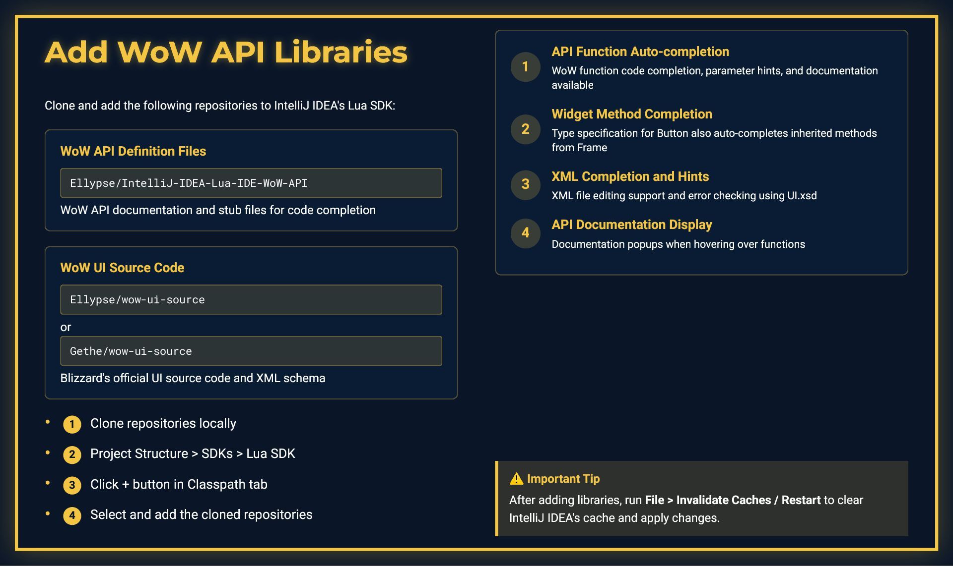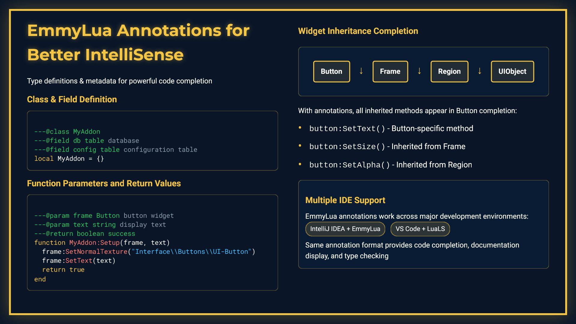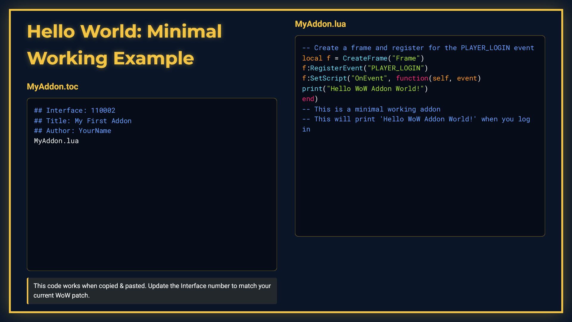 This presentation is a comprehensive guide to World of Warcraft addon development, covering essential development practices. It demonstrates debugging techniques including conditional debug output with toggleable flags, stack trace capture for error tracking, and integration with tools like ViragDevTool. The guide emphasizes fast iteration development using the /reload command to test changes without restarting the game, while noting important considerations like SavedVariables and PLAYER_LOGOUT events. It also covers best practices for identifying global variable leaks by inspecting the _G table, helping developers maintain clean and efficient addon code.