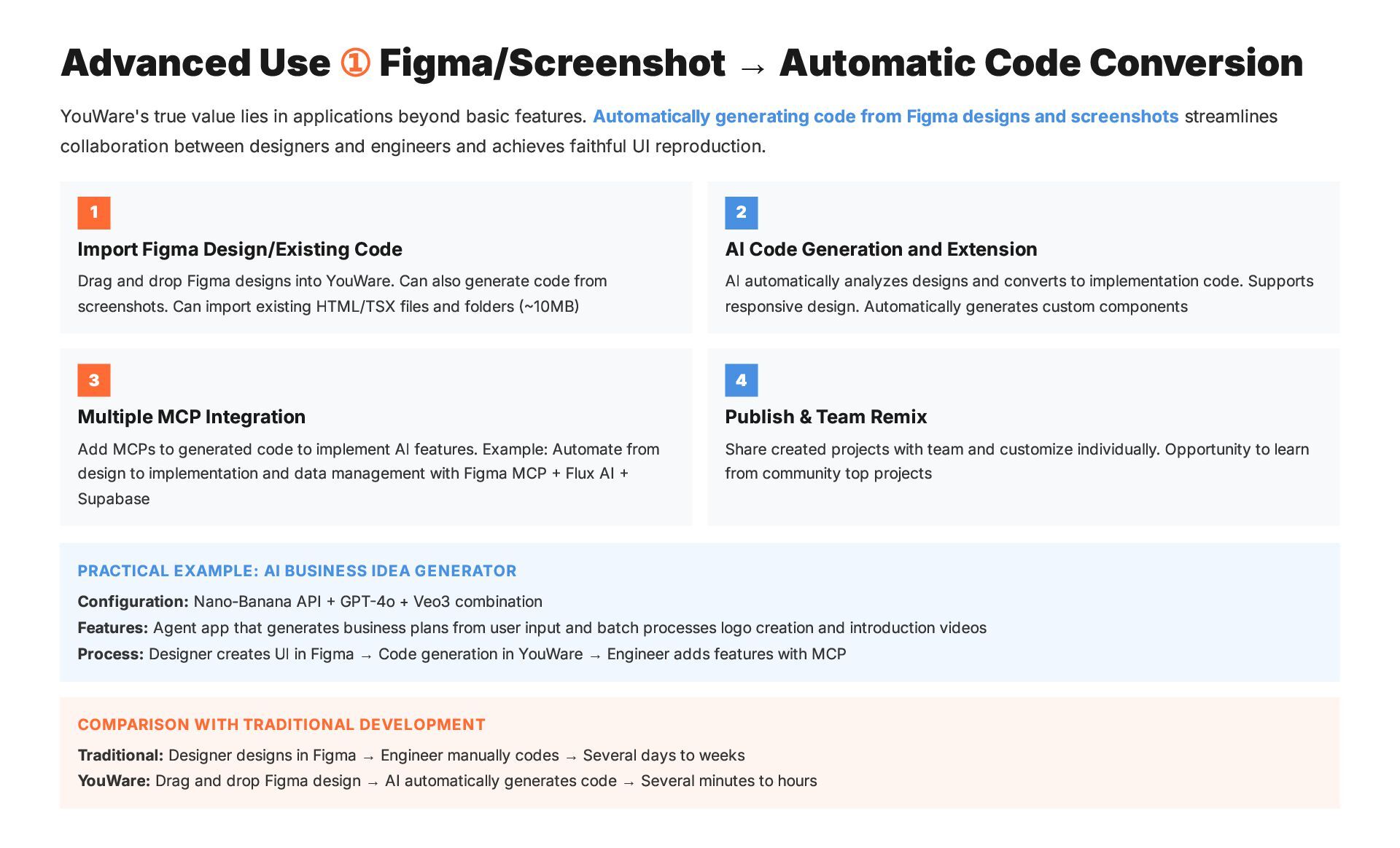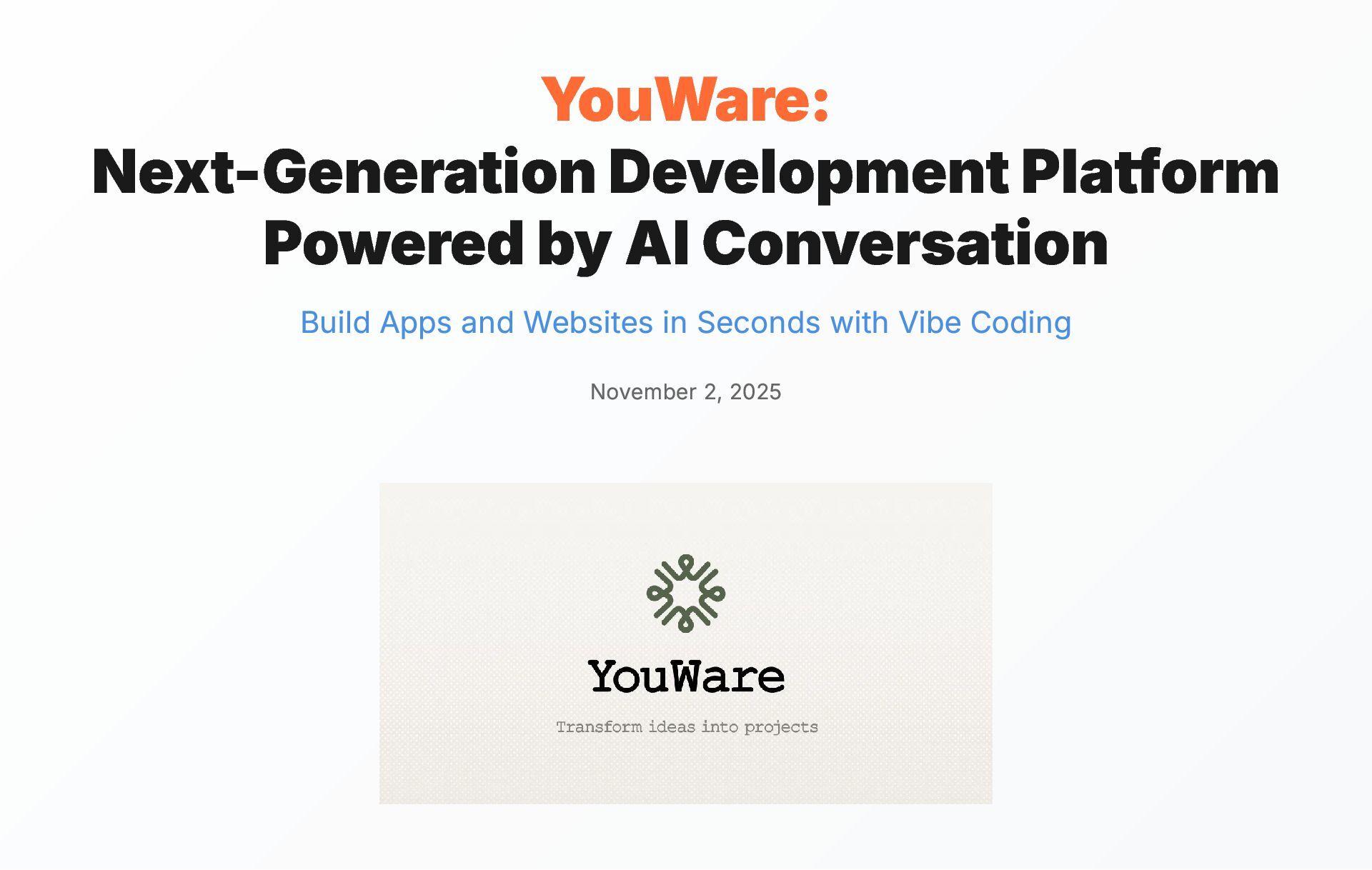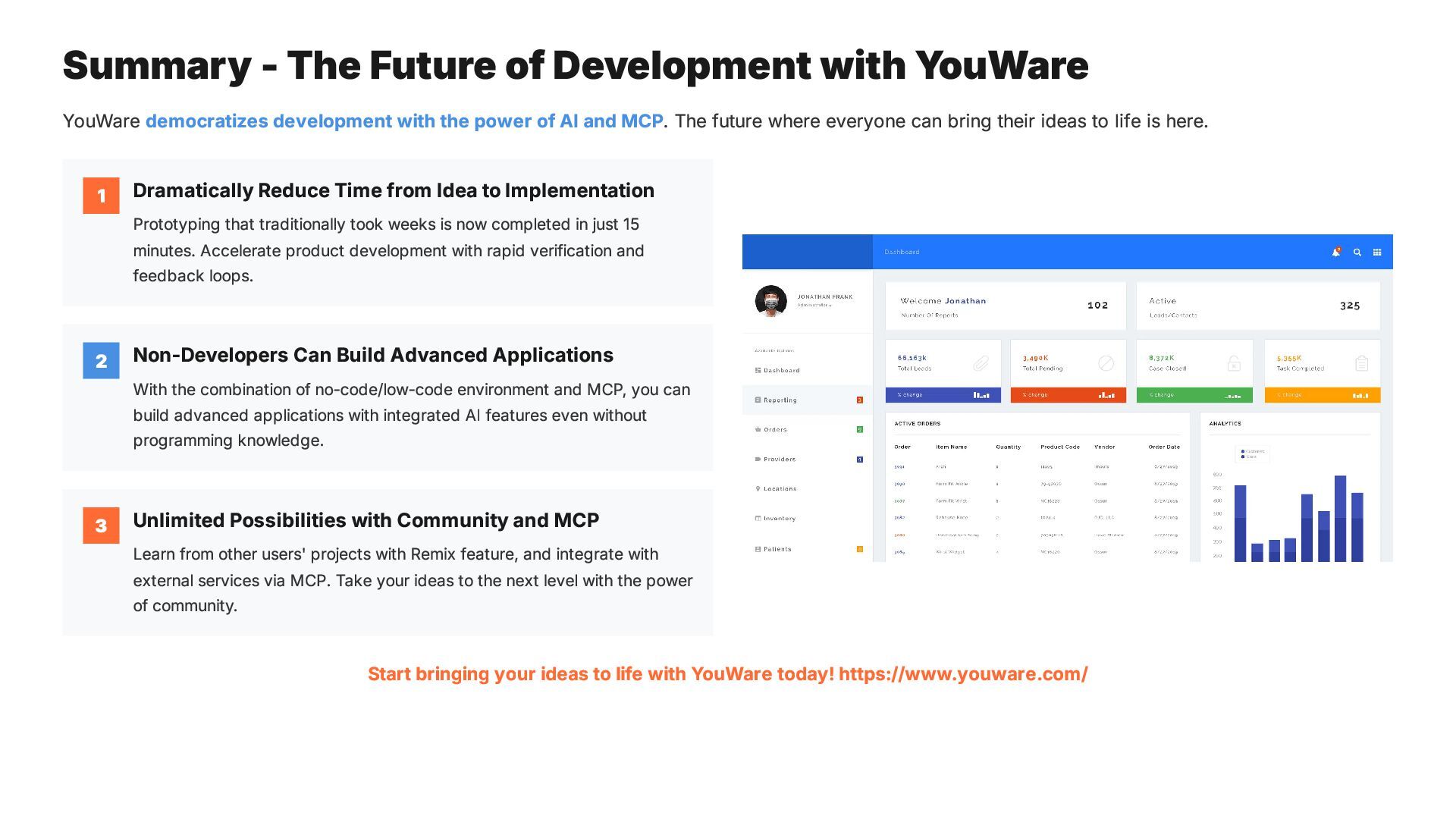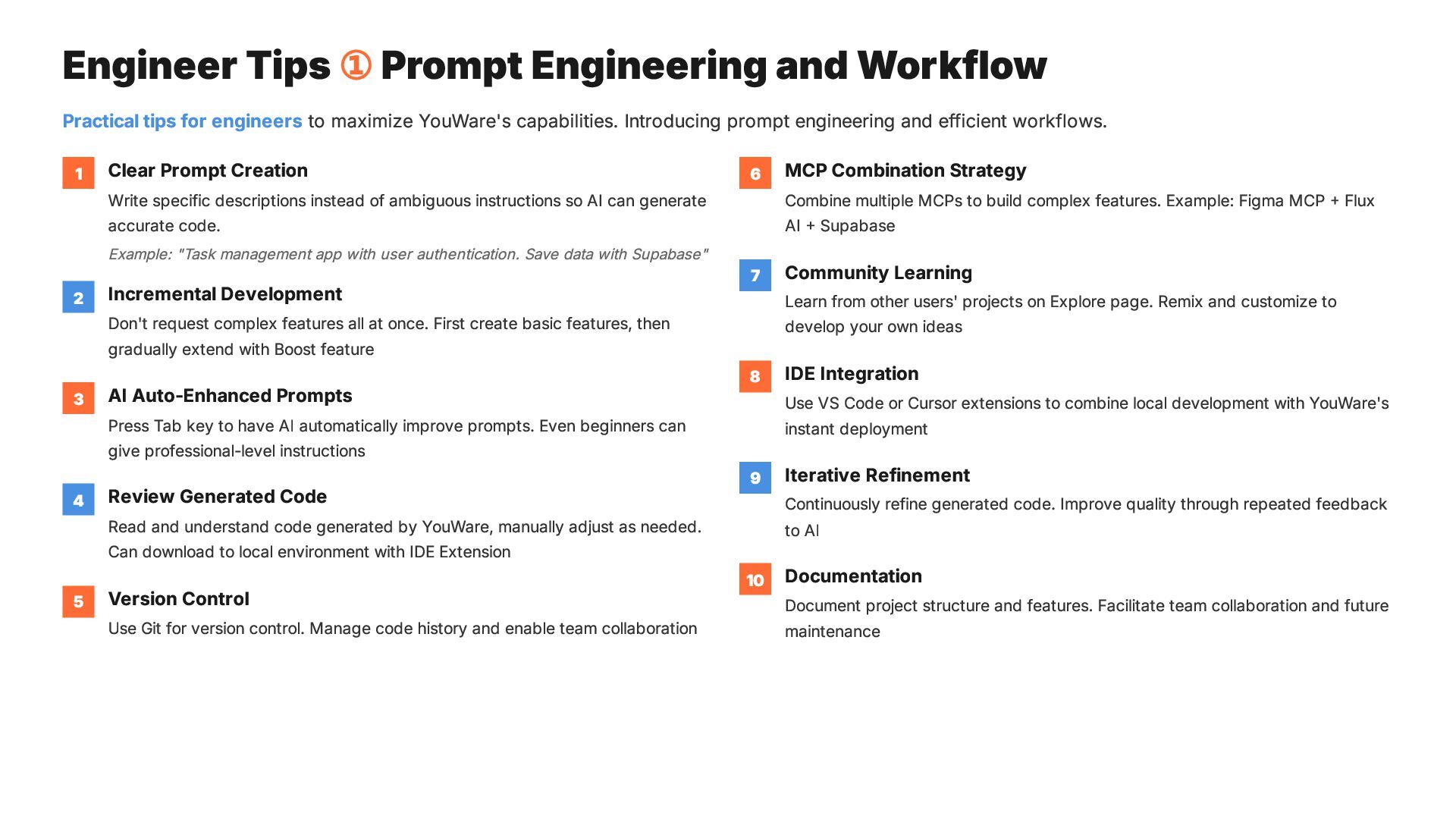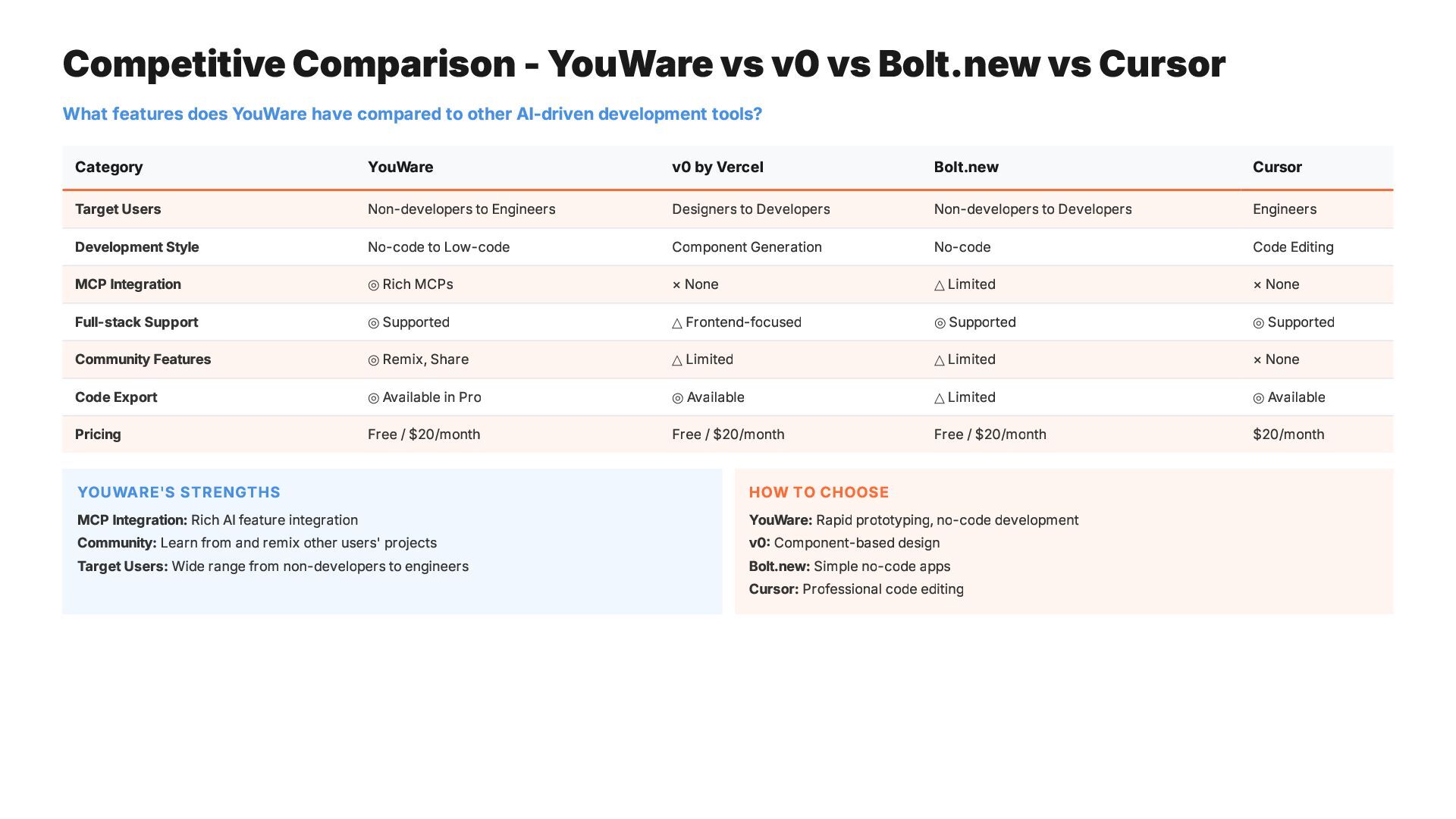 This presentation provides a comprehensive 22-page overview of YouWare, an AI-driven next-generation development platform. YouWare is a revolutionary platform that enables anyone to build full-stack applications without programming knowledge, with over 100,000 creators having already built more than 300,000 projects. The presentation details key features including AI Coding Assistant, Backend Code Generator, and MCP Server integration, while showcasing practical use cases such as MVP prototyping, no-code development, and AI chatbot creation with real-world examples. It further explores advanced applications like automatic code conversion from Figma designs and AI Agent development, alongside extensive engineer-focused tips covering prompt engineering, architecture design, security, testing strategies, and advanced integration techniques. The presentation concludes with a pricing comparison between Free and Pro plans, competitive analysis against v0, Bolt.new, and Cursor to highlight YouWare's unique strengths and optimal use cases, ultimately delivering the message "Stop Dreaming. Start Building." to present a future where anyone can become a developer.