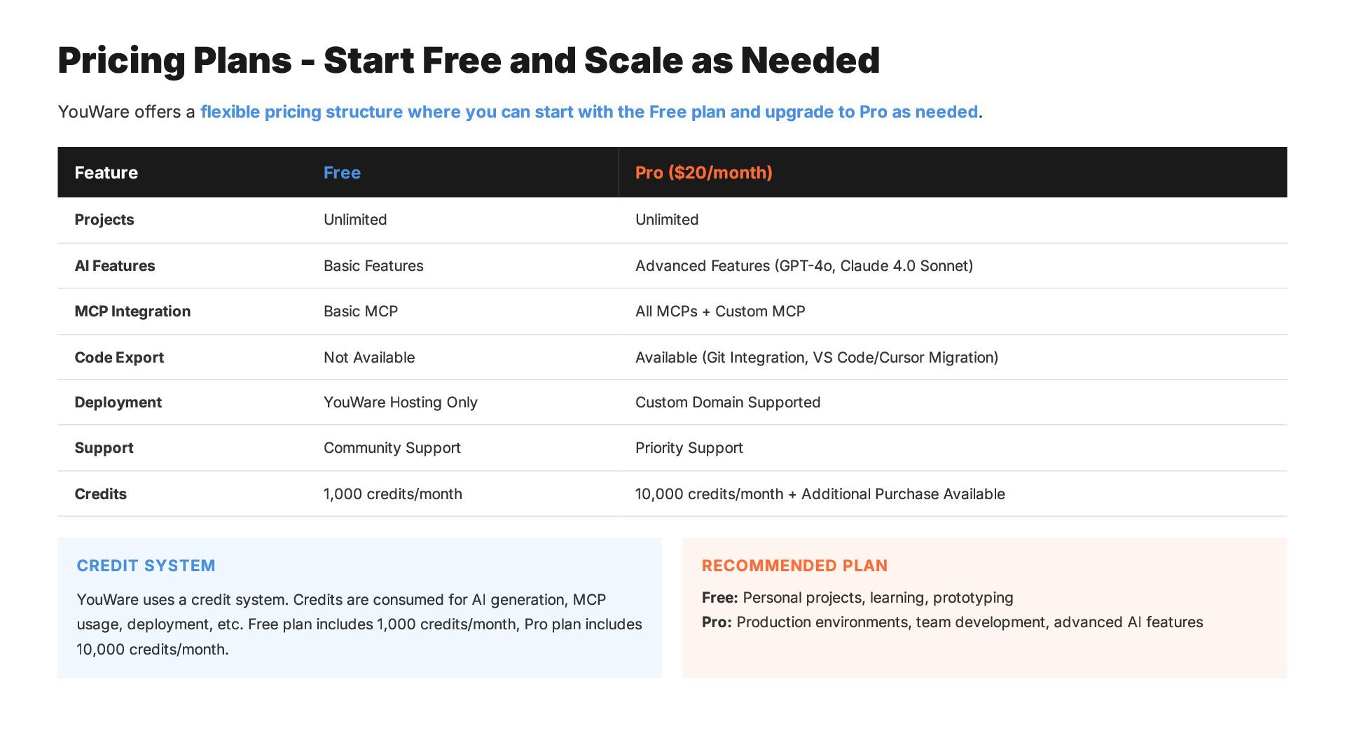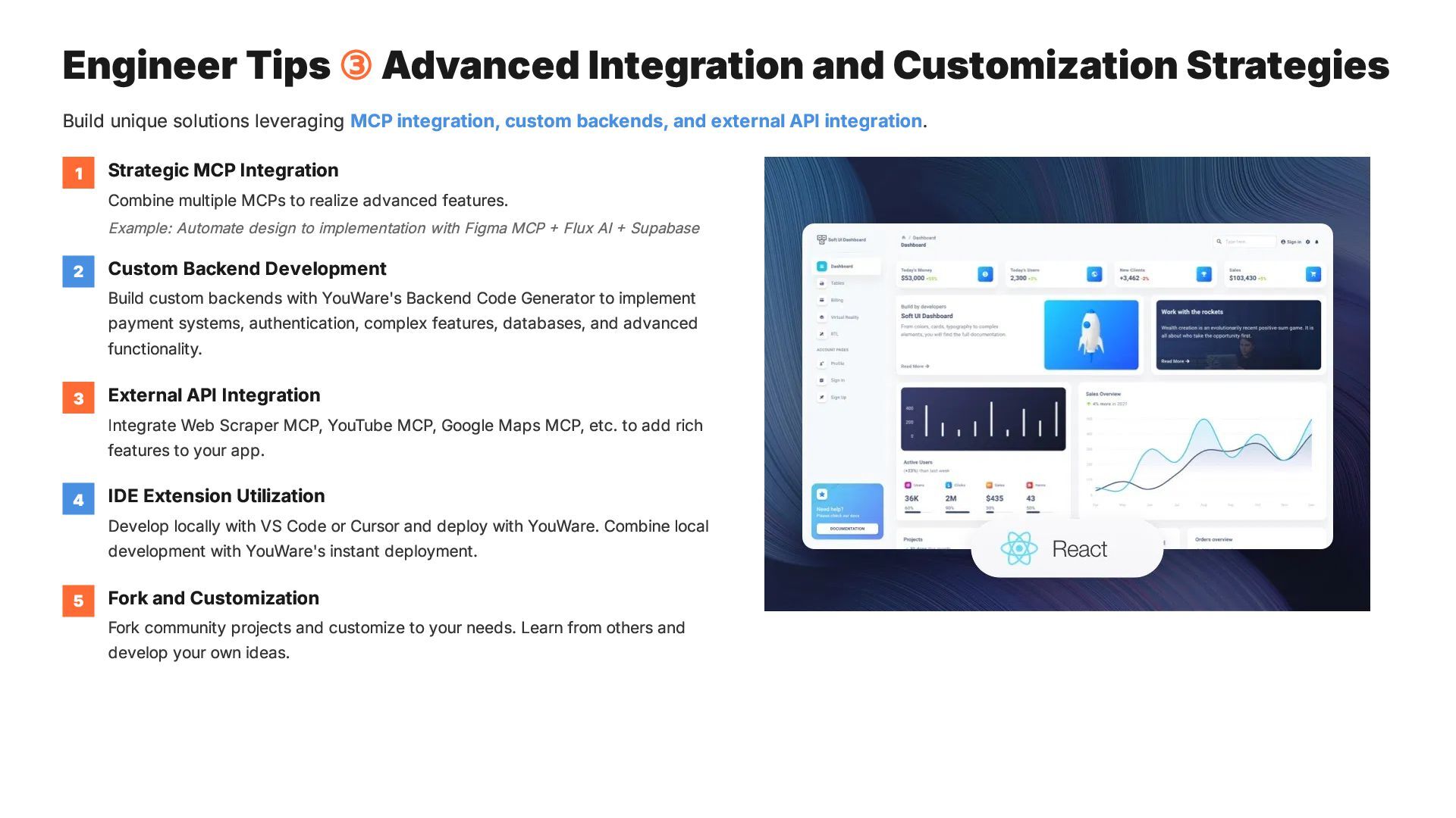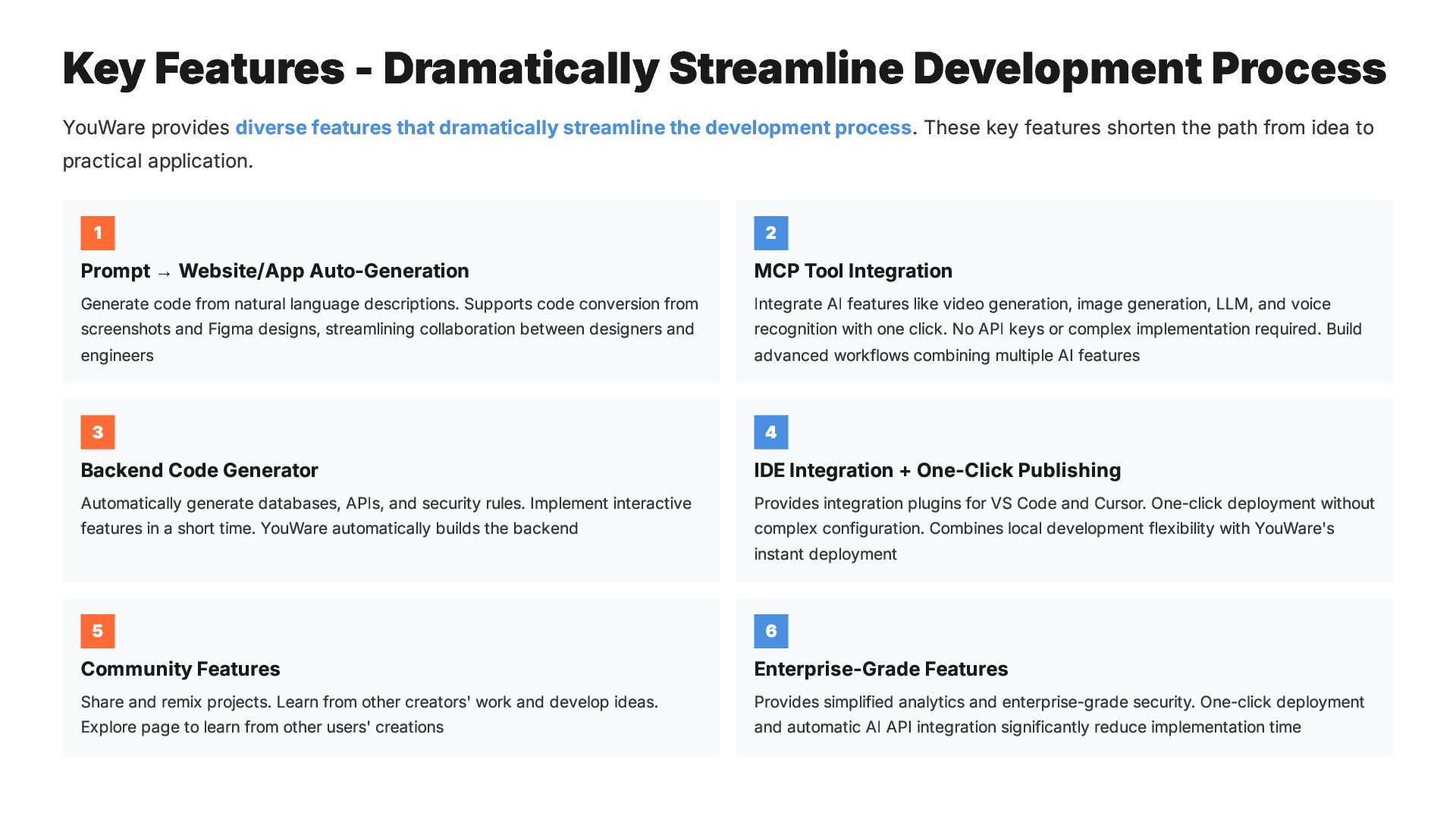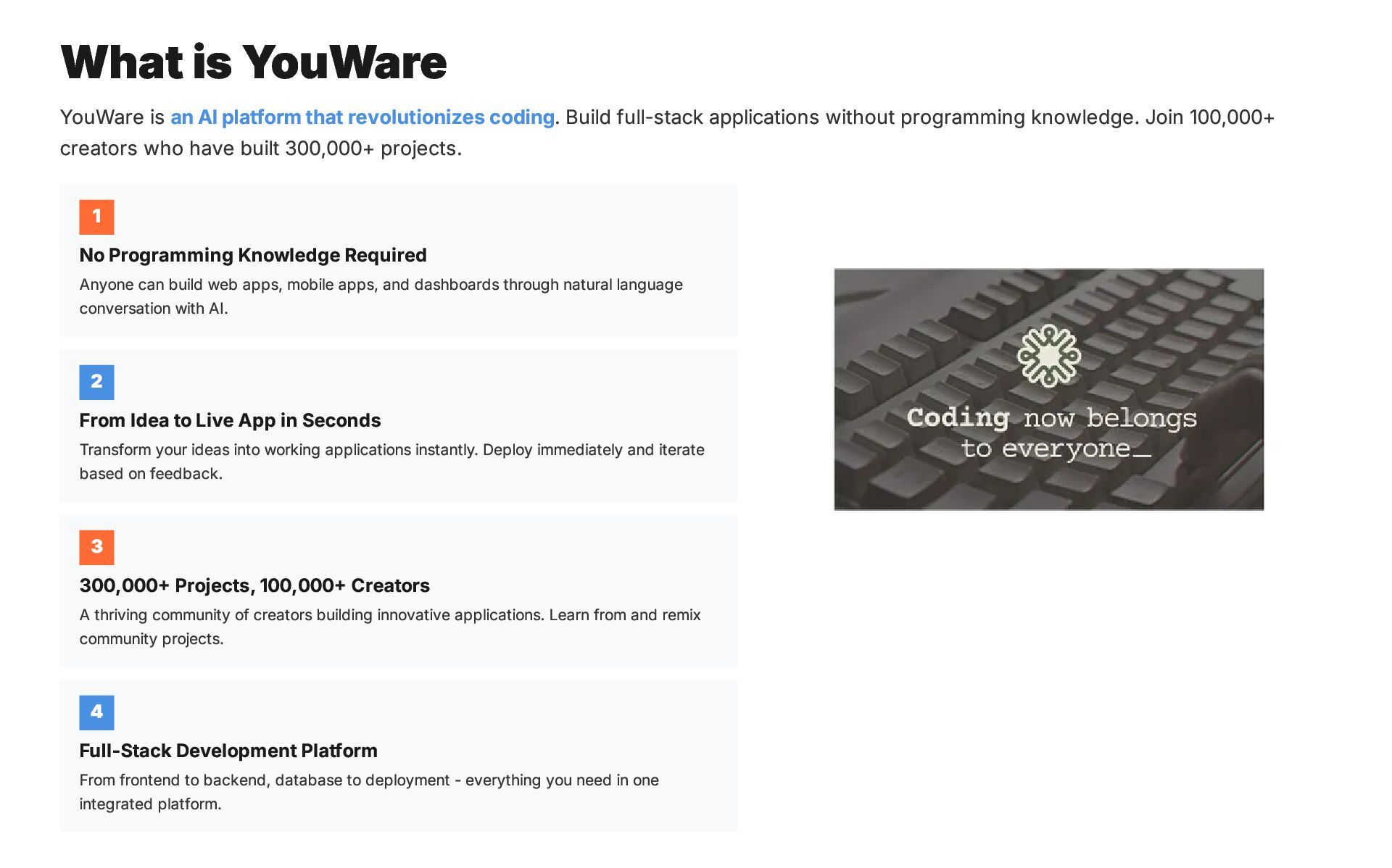 This presentation provides a comprehensive 22-page overview of YouWare, an AI-driven next-generation development platform. YouWare is a revolutionary platform that enables anyone to build full-stack applications without programming knowledge, with over 100,000 creators having already built more than 300,000 projects. The presentation details key features including AI Coding Assistant, Backend Code Generator, and MCP Server integration, while showcasing practical use cases such as MVP prototyping, no-code development, and AI chatbot creation with real-world examples. It further explores advanced applications like automatic code conversion from Figma designs and AI Agent development, alongside extensive engineer-focused tips covering prompt engineering, architecture design, security, testing strategies, and advanced integration techniques. The presentation concludes with a pricing comparison between Free and Pro plans, competitive analysis against v0, Bolt.new, and Cursor to highlight YouWare's unique strengths and optimal use cases, ultimately delivering the message "Stop Dreaming. Start Building." to present a future where anyone can become a developer.