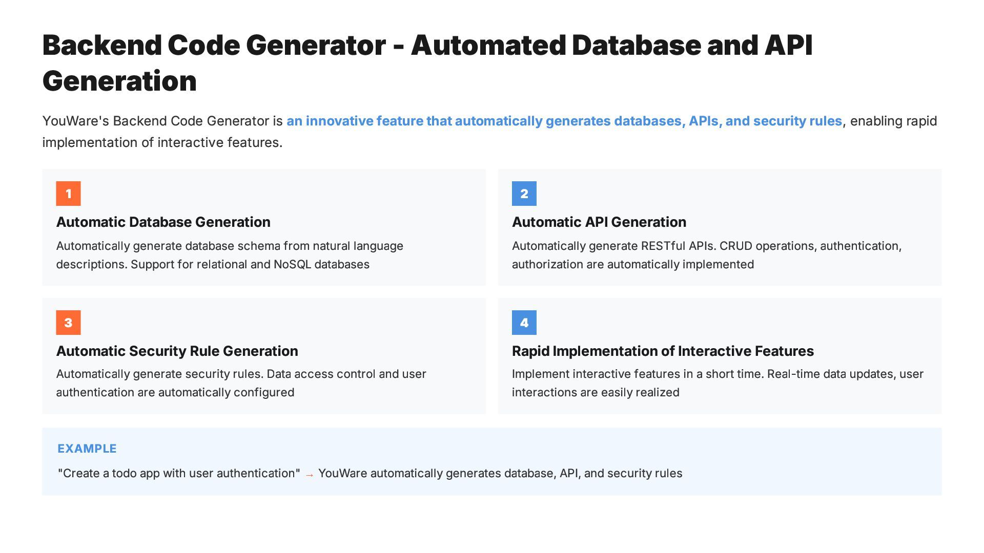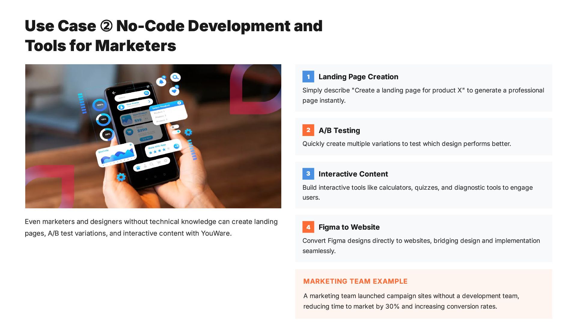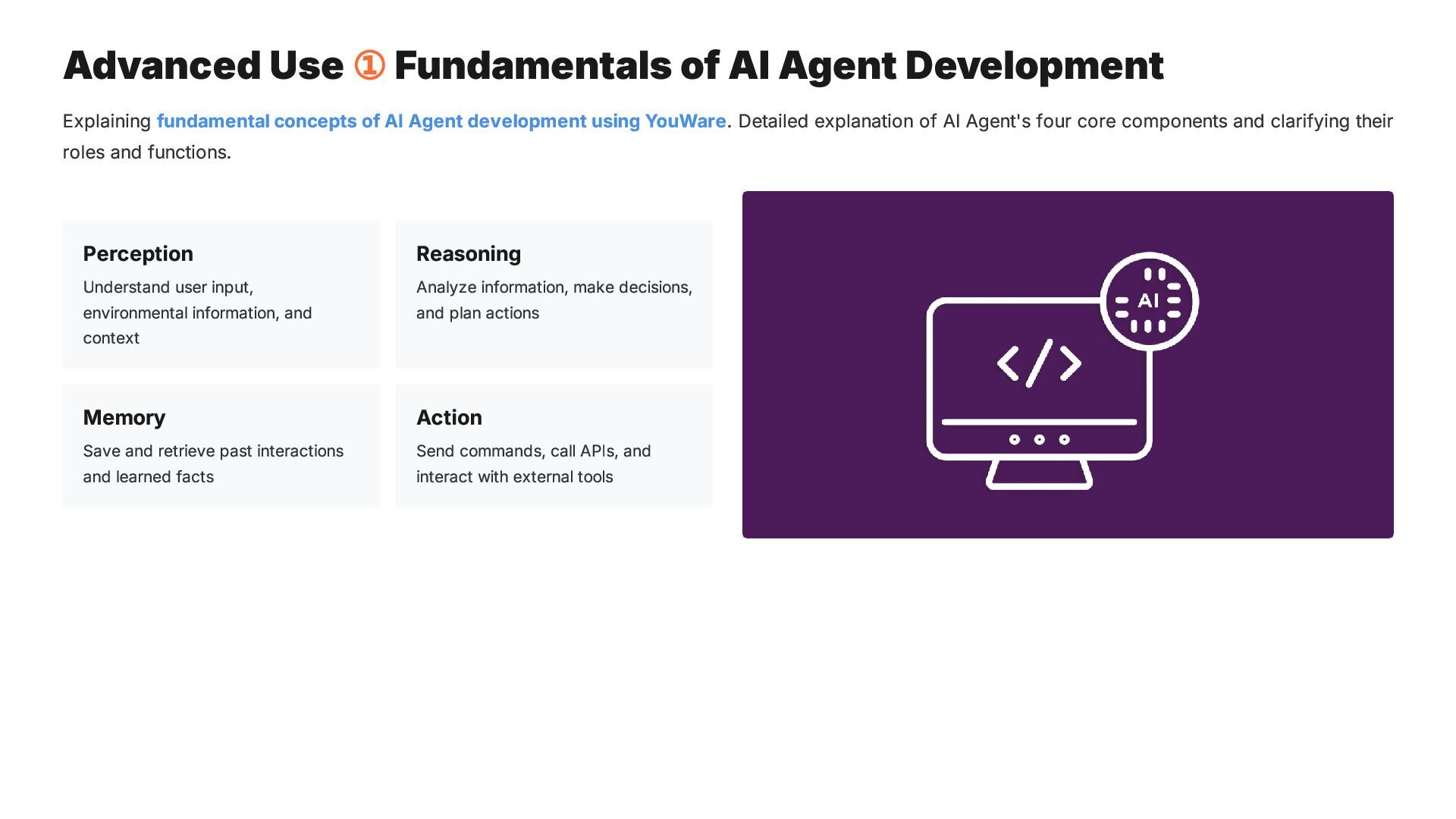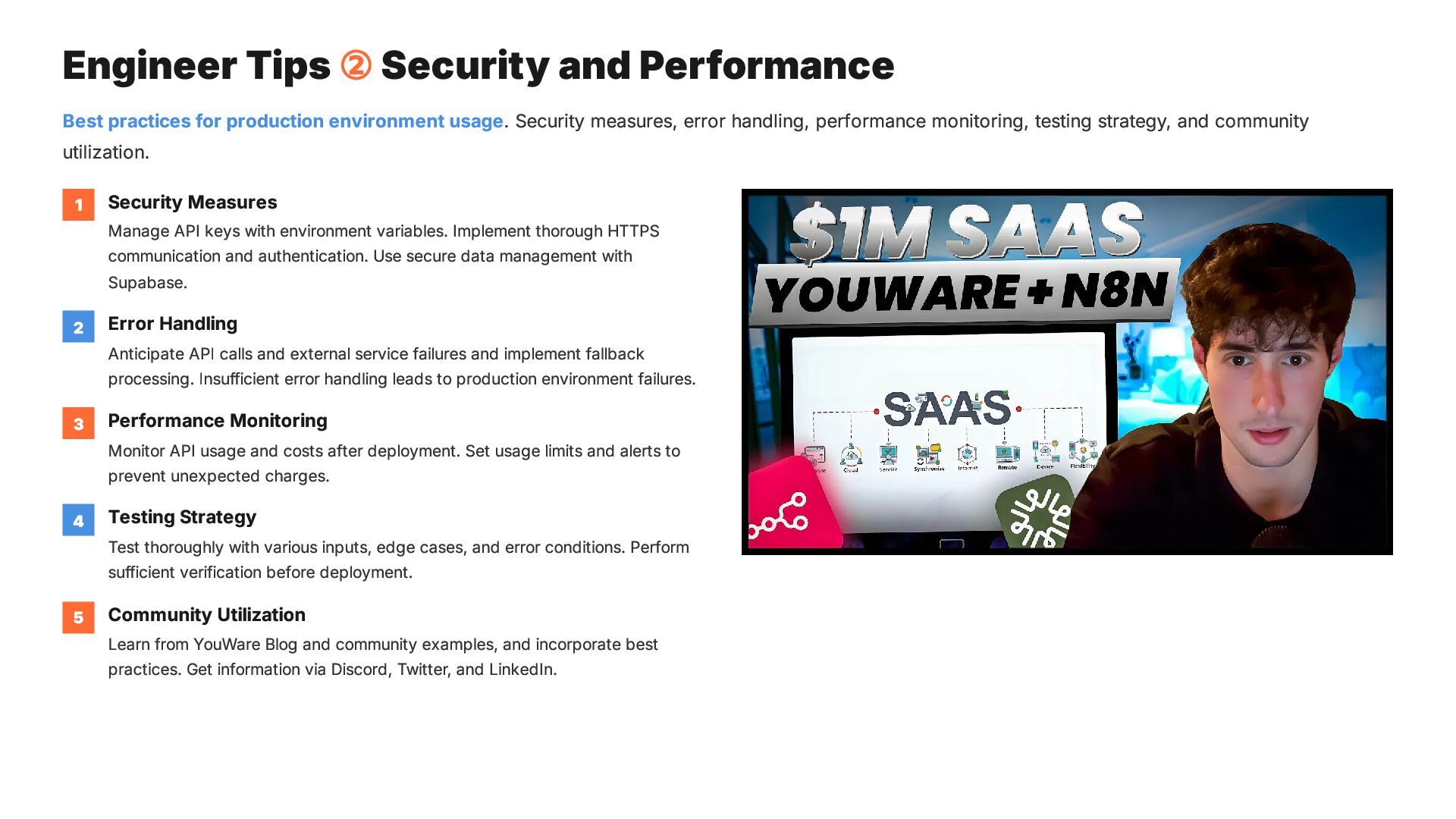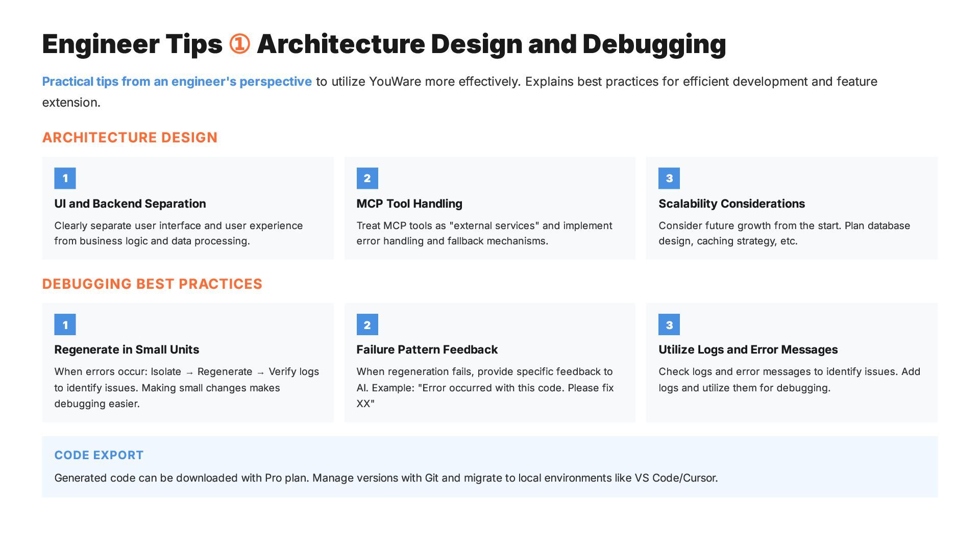 This presentation provides a comprehensive 22-page overview of YouWare, an AI-driven next-generation development platform. YouWare is a revolutionary platform that enables anyone to build full-stack applications without programming knowledge, with over 100,000 creators having already built more than 300,000 projects. The presentation details key features including AI Coding Assistant, Backend Code Generator, and MCP Server integration, while showcasing practical use cases such as MVP prototyping, no-code development, and AI chatbot creation with real-world examples. It further explores advanced applications like automatic code conversion from Figma designs and AI Agent development, alongside extensive engineer-focused tips covering prompt engineering, architecture design, security, testing strategies, and advanced integration techniques. The presentation concludes with a pricing comparison between Free and Pro plans, competitive analysis against v0, Bolt.new, and Cursor to highlight YouWare's unique strengths and optimal use cases, ultimately delivering the message "Stop Dreaming. Start Building." to present a future where anyone can become a developer.