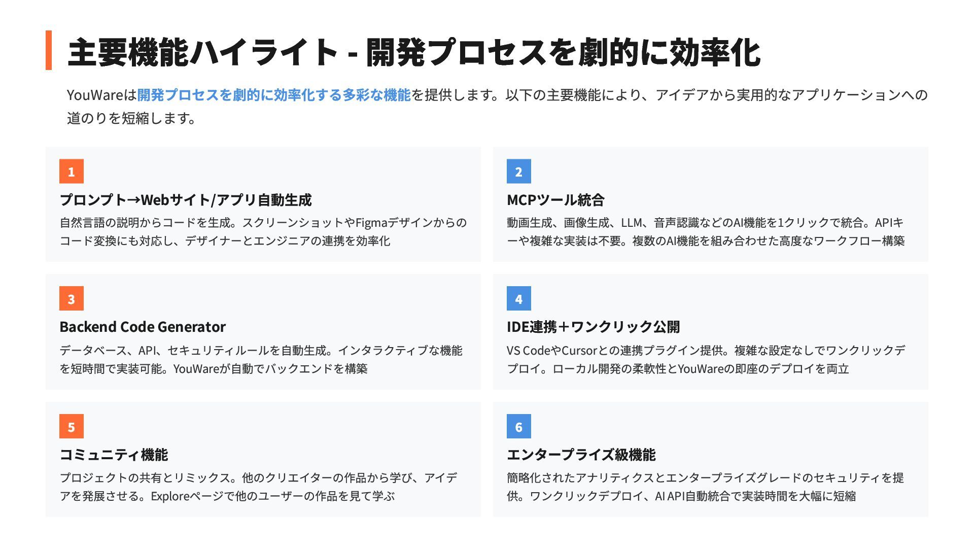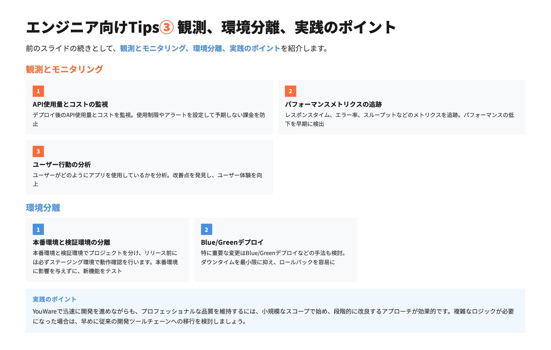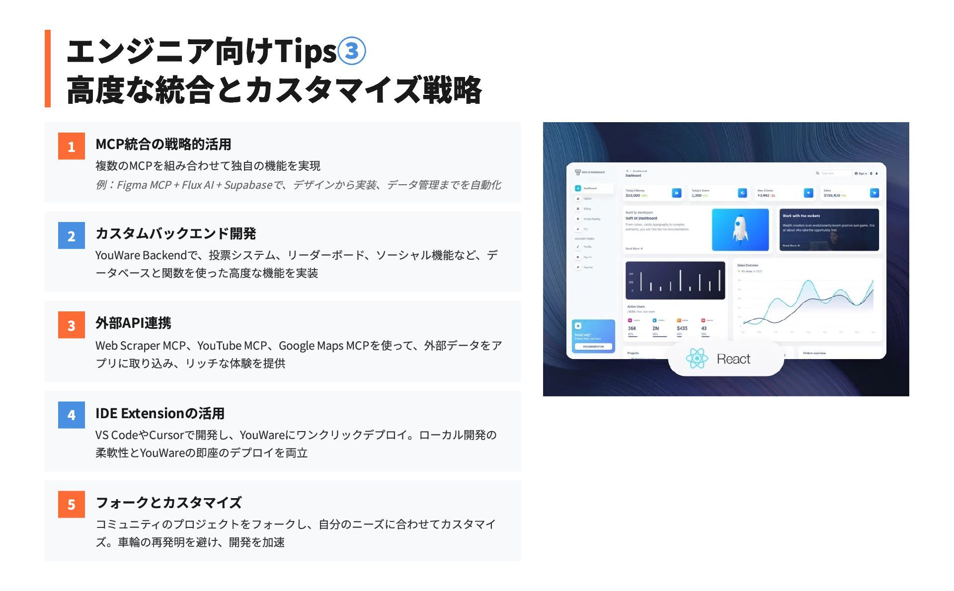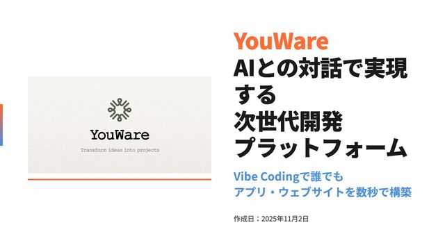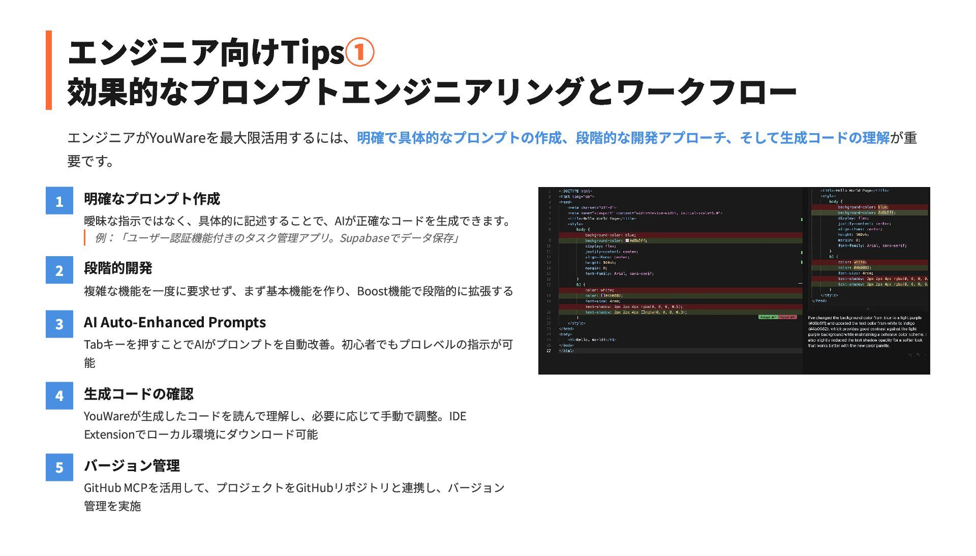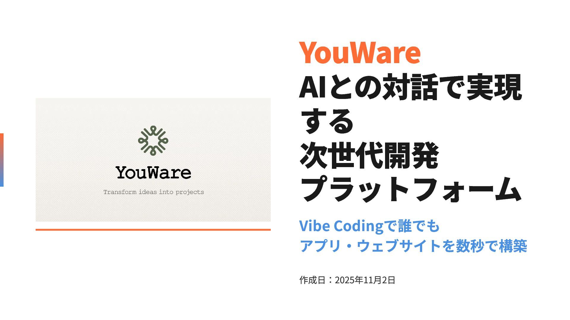 本プレゼンテーションは、AI駆動型の次世代開発プラットフォーム「YouWare」について、全22ページで包括的に解説しています。YouWareは、プログラミング知識不要で誰でもフルスタックアプリケーションを構築できる革新的なプラットフォームであり、すでに10万人以上のクリエイターが30万以上のプロジェクトを生み出しています。プレゼンテーションでは、AI Coding Assistant、Backend Code Generator、MCP Server統合などの主要機能を詳細に紹介し、MVPプロトタイピング、ノーコード開発、AIチャットボット構築などの想定利用方法を実例とともに提示します。さらに、Figmaデザインからのコード自動変換やAI Agent開発といった応用的な利用方法、そしてプロンプトエンジニアリング、アーキテクチャ設計、セキュリティ、テスト戦略、高度な統合など、エンジニア向けの実践的なTipsを豊富に含んでいます。最後に、無料プランとProプランの価格比較、v0、Bolt.new、Cursorとの競合比較を通じて、YouWareの独自の強みと使い分けのポイントを明確にし、「Stop Dreaming. Start Building.」というメッセージで、誰もが開発者になれる未来を提示しています。