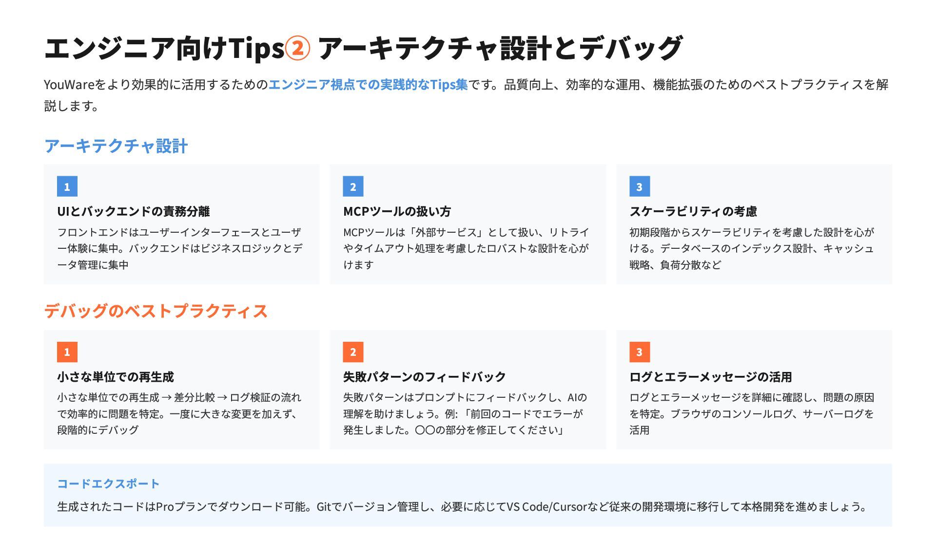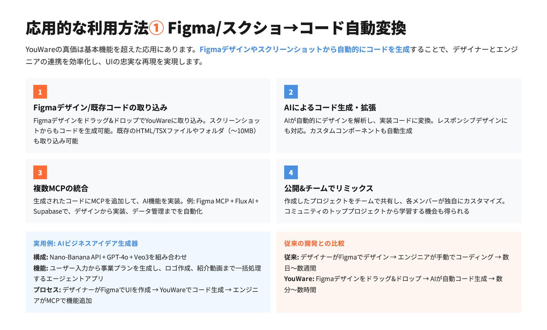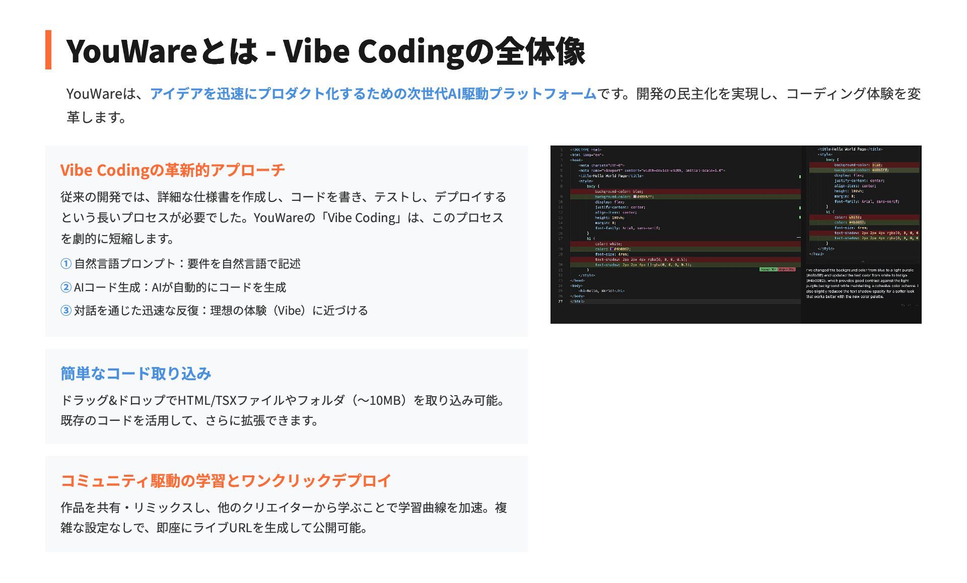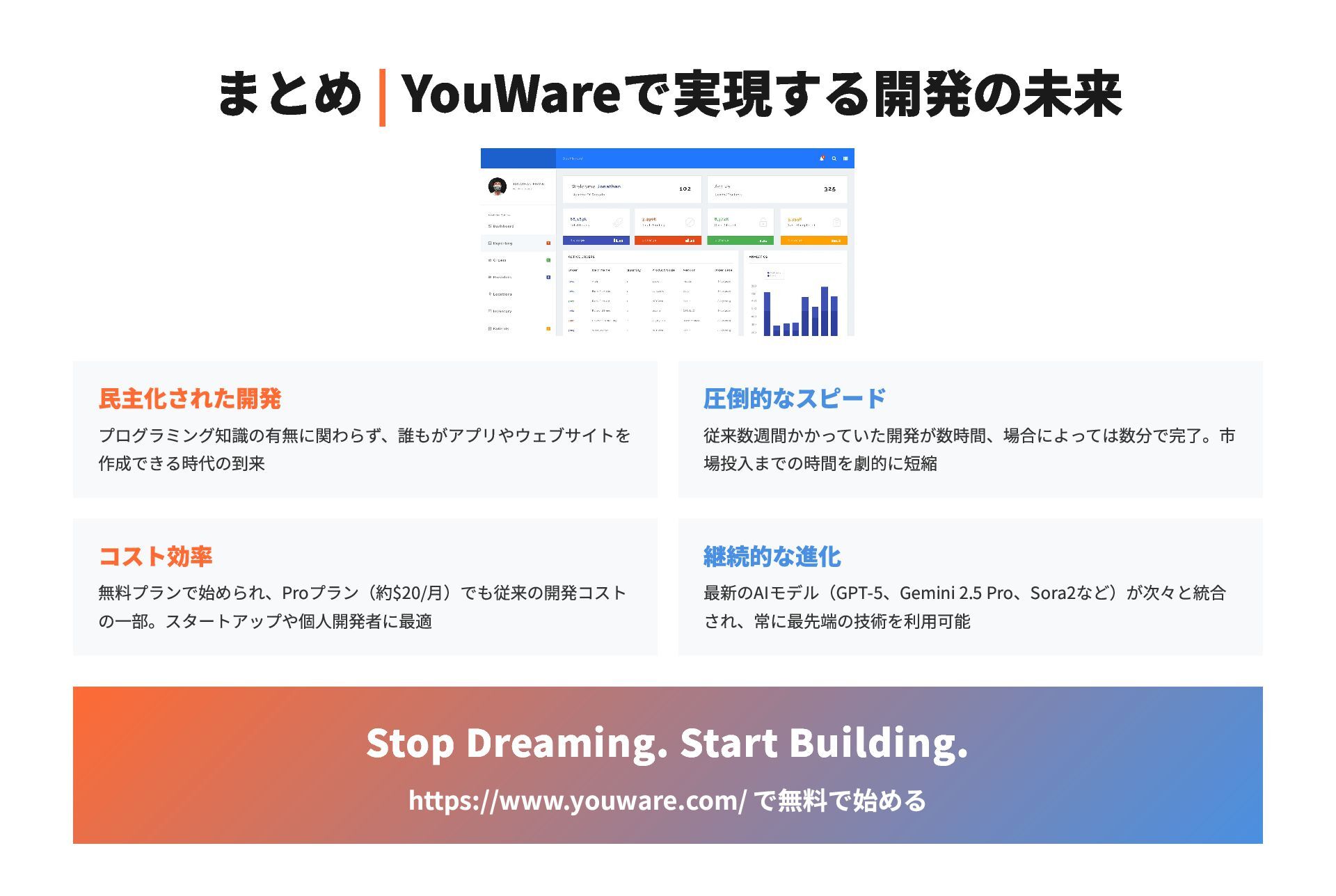 本プレゼンテーションは、AI駆動型の次世代開発プラットフォーム「YouWare」について、全22ページで包括的に解説しています。YouWareは、プログラミング知識不要で誰でもフルスタックアプリケーションを構築できる革新的なプラットフォームであり、すでに10万人以上のクリエイターが30万以上のプロジェクトを生み出しています。プレゼンテーションでは、AI Coding Assistant、Backend Code Generator、MCP Server統合などの主要機能を詳細に紹介し、MVPプロトタイピング、ノーコード開発、AIチャットボット構築などの想定利用方法を実例とともに提示します。さらに、Figmaデザインからのコード自動変換やAI Agent開発といった応用的な利用方法、そしてプロンプトエンジニアリング、アーキテクチャ設計、セキュリティ、テスト戦略、高度な統合など、エンジニア向けの実践的なTipsを豊富に含んでいます。最後に、無料プランとProプランの価格比較、v0、Bolt.new、Cursorとの競合比較を通じて、YouWareの独自の強みと使い分けのポイントを明確にし、「Stop Dreaming. Start Building.」というメッセージで、誰もが開発者になれる未来を提示しています。