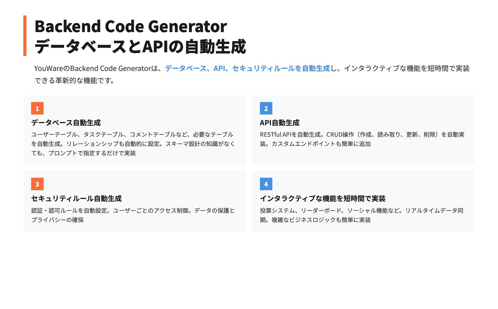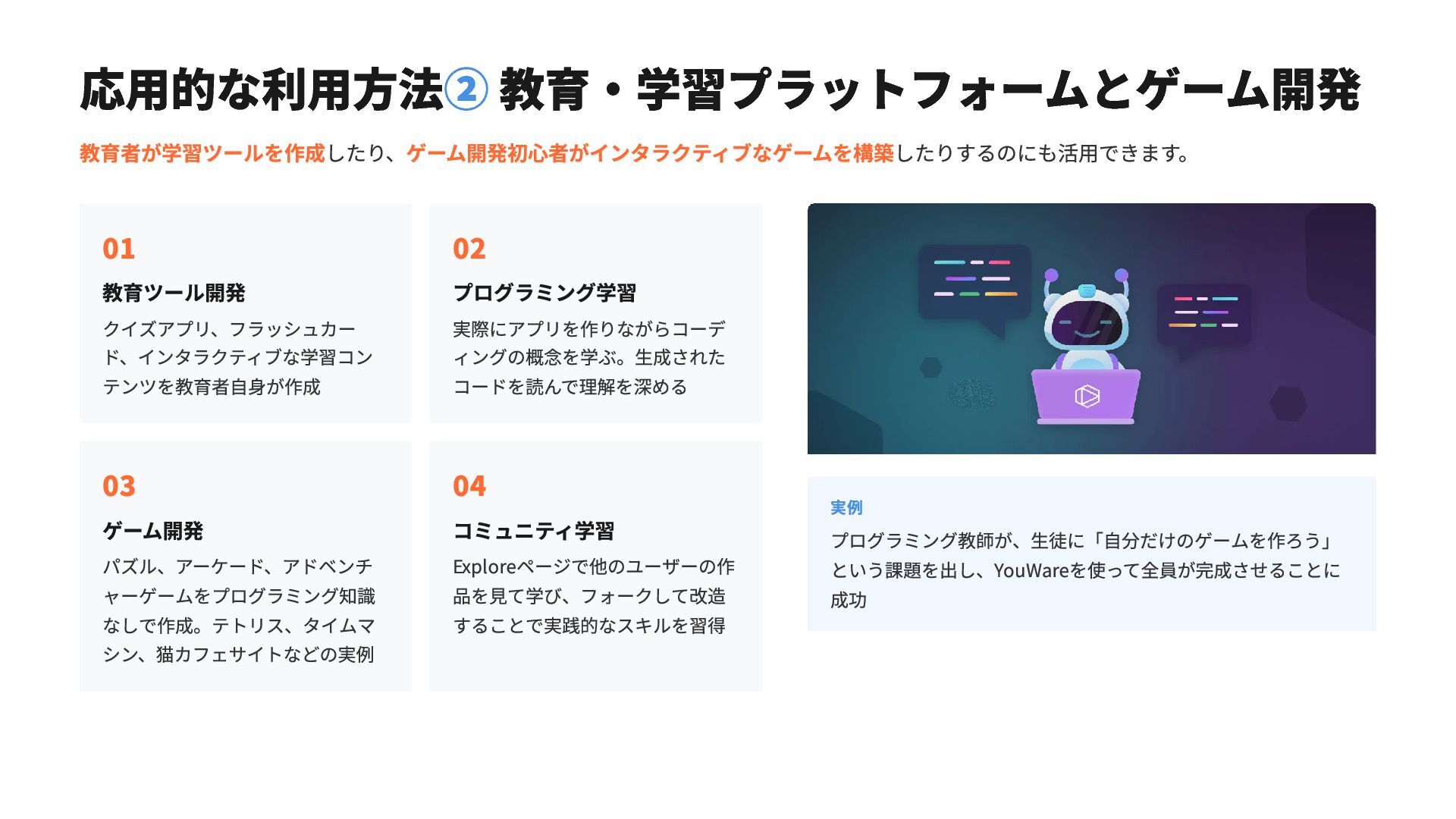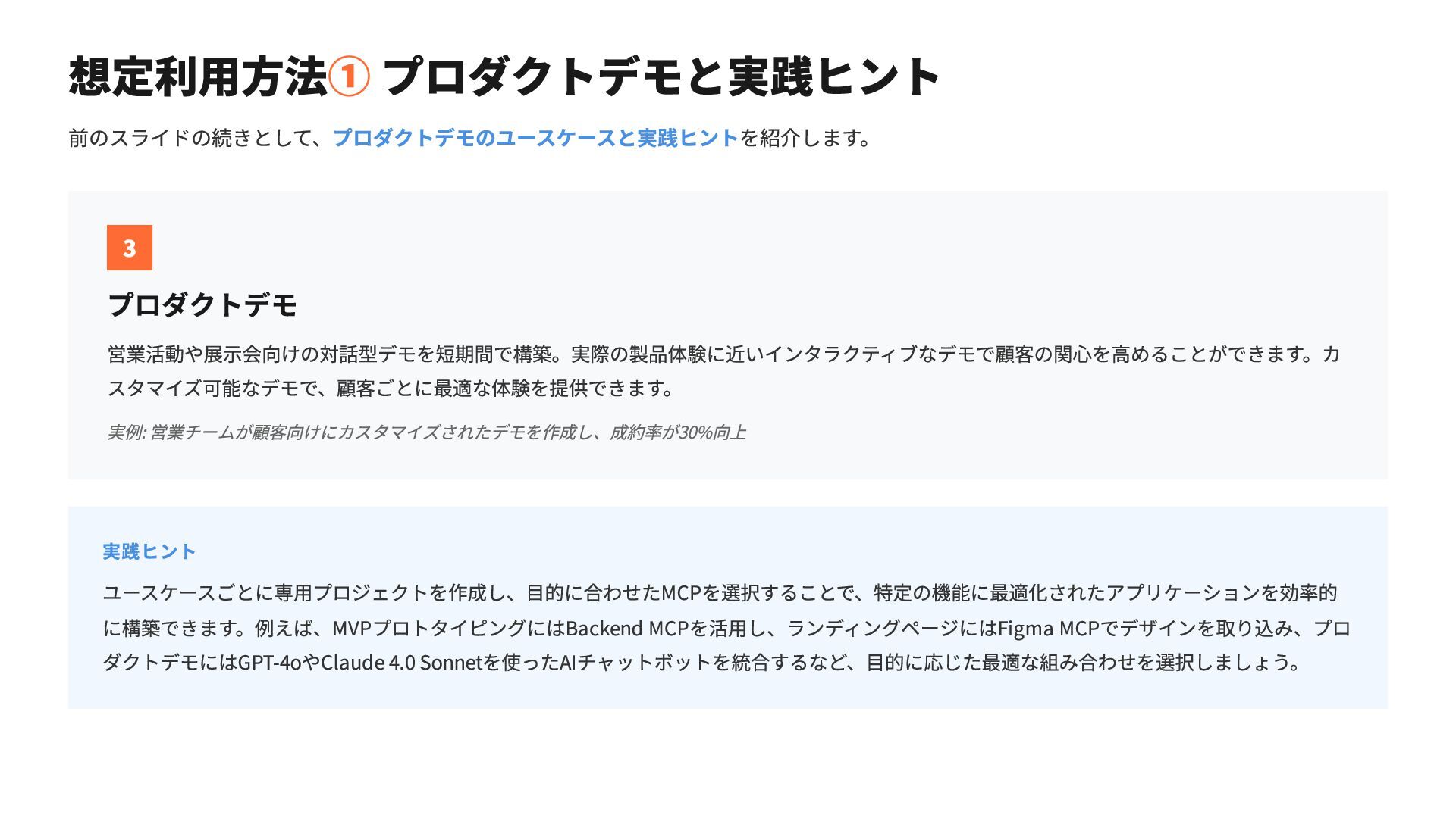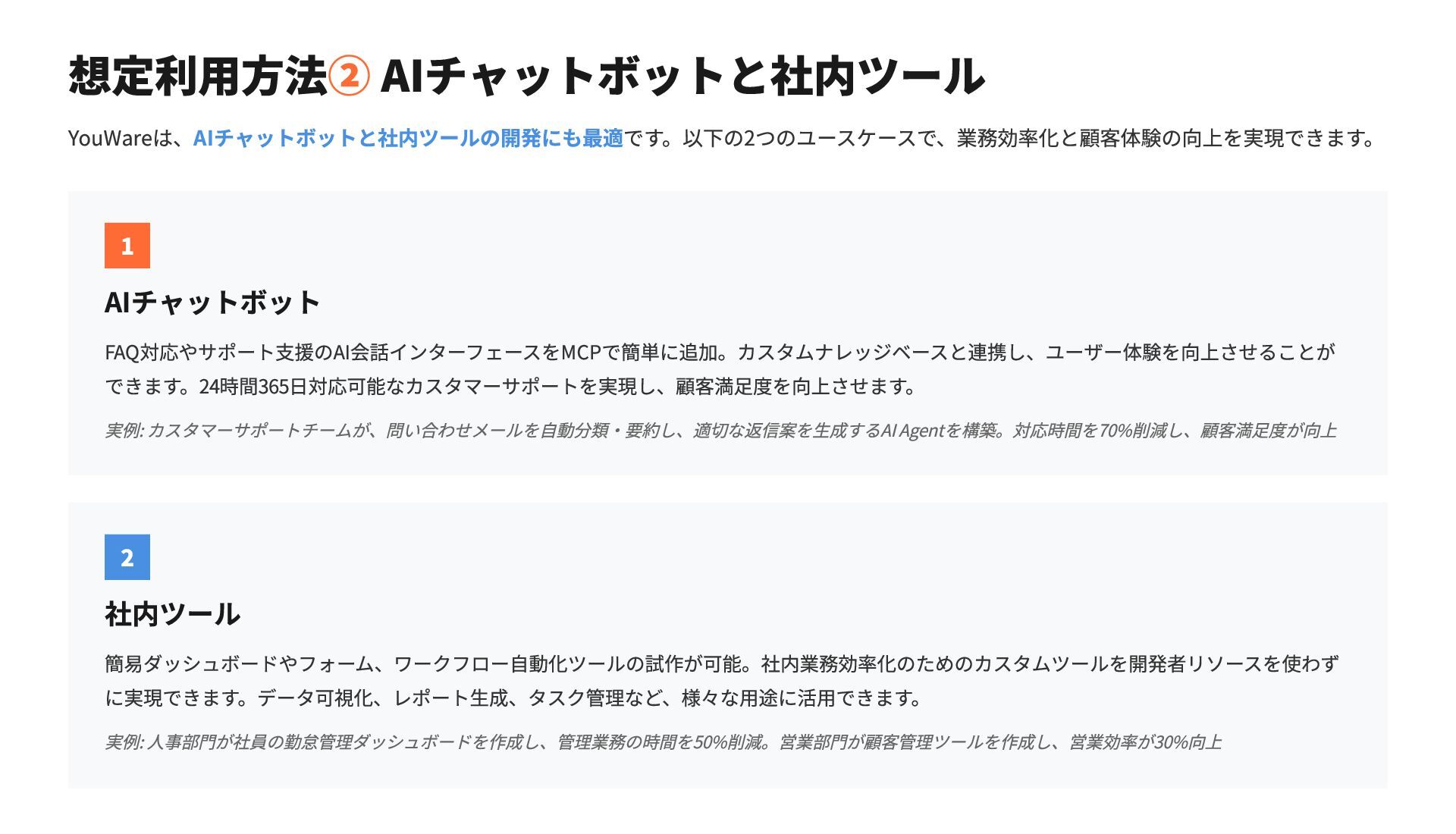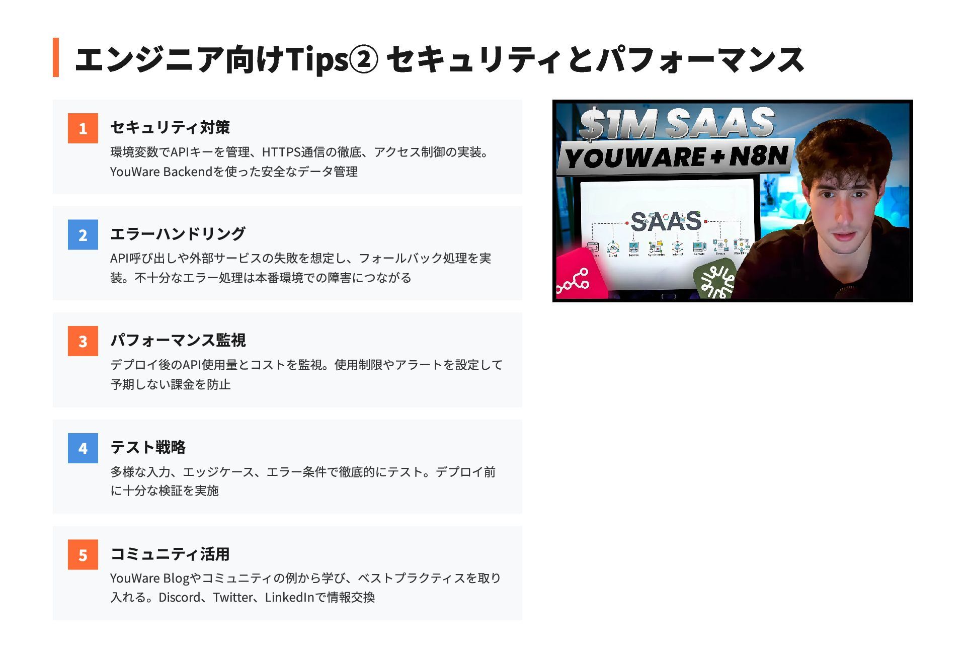 本プレゼンテーションは、AI駆動型の次世代開発プラットフォーム「YouWare」について、全22ページで包括的に解説しています。YouWareは、プログラミング知識不要で誰でもフルスタックアプリケーションを構築できる革新的なプラットフォームであり、すでに10万人以上のクリエイターが30万以上のプロジェクトを生み出しています。プレゼンテーションでは、AI Coding Assistant、Backend Code Generator、MCP Server統合などの主要機能を詳細に紹介し、MVPプロトタイピング、ノーコード開発、AIチャットボット構築などの想定利用方法を実例とともに提示します。さらに、Figmaデザインからのコード自動変換やAI Agent開発といった応用的な利用方法、そしてプロンプトエンジニアリング、アーキテクチャ設計、セキュリティ、テスト戦略、高度な統合など、エンジニア向けの実践的なTipsを豊富に含んでいます。最後に、無料プランとProプランの価格比較、v0、Bolt.new、Cursorとの競合比較を通じて、YouWareの独自の強みと使い分けのポイントを明確にし、「Stop Dreaming. Start Building.」というメッセージで、誰もが開発者になれる未来を提示しています。