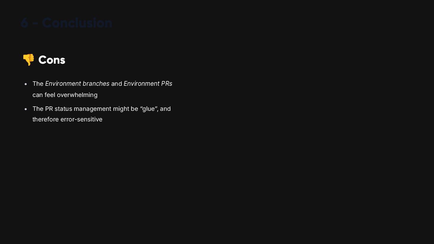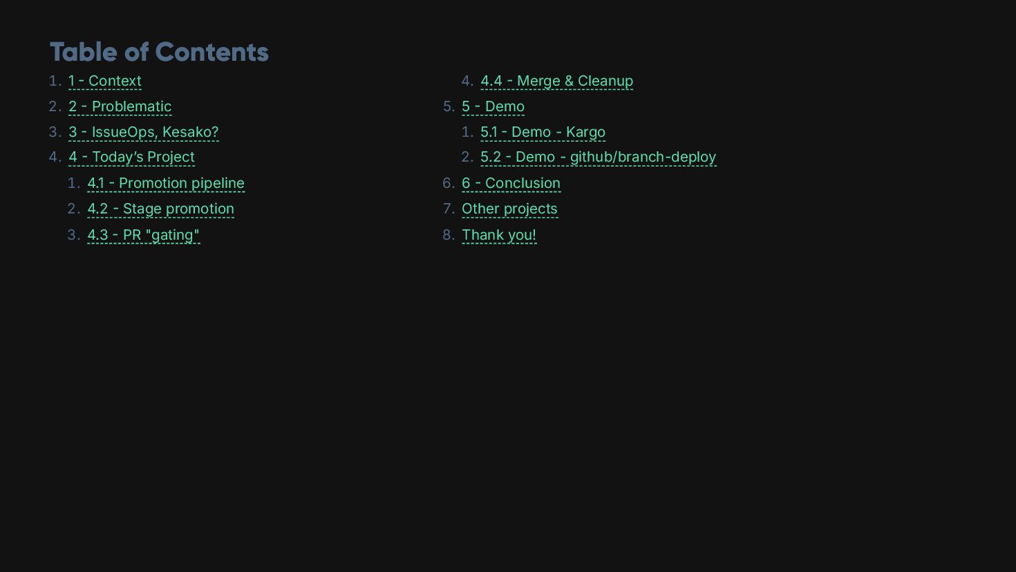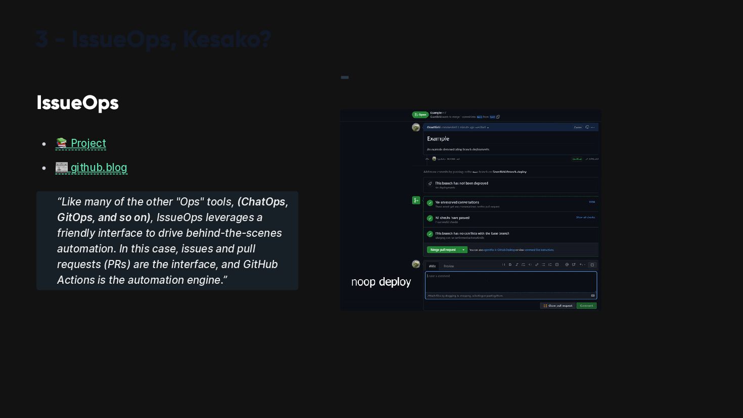 🎯 During this presentation, we will explore a solution using the concept of "promotion," aka pipelines, and an "issueOps" approach to avoid PR fatigue and blind reviews.