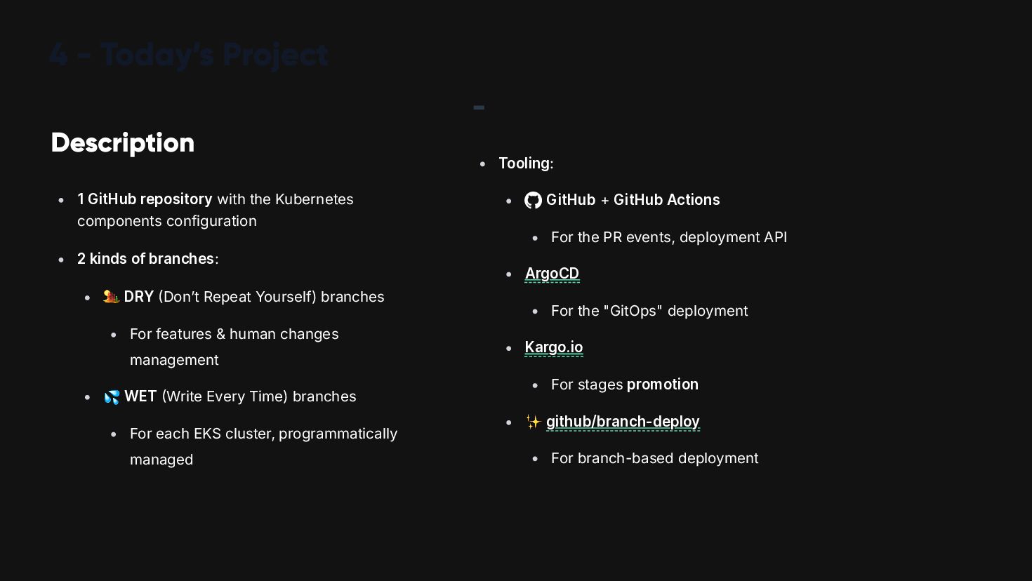 We will explain how the combined use of DRY/WET Git branches, Kustomize/Helm, and tools such as ArgoCD and Kargo.io facilitates the CI/CD process for the "components" required for a Kubernetes-based "platform."
