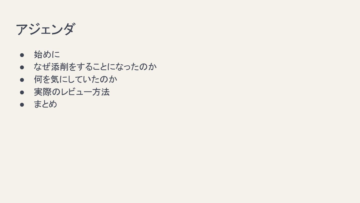 アジェンダ • 始めに • なぜ添削をすることになったのか • 何を気にしていたのか • 実際のレビュー方法 •