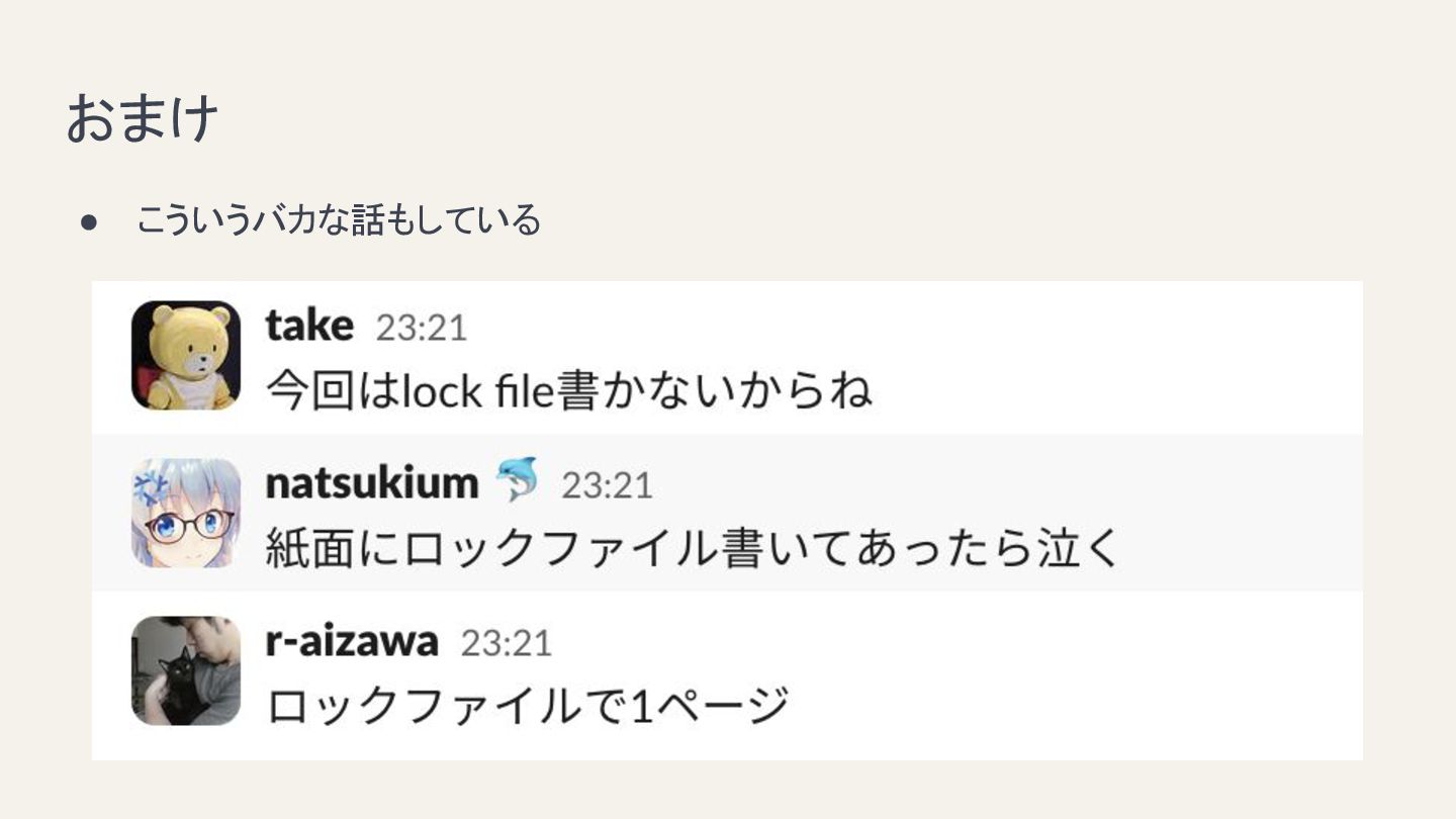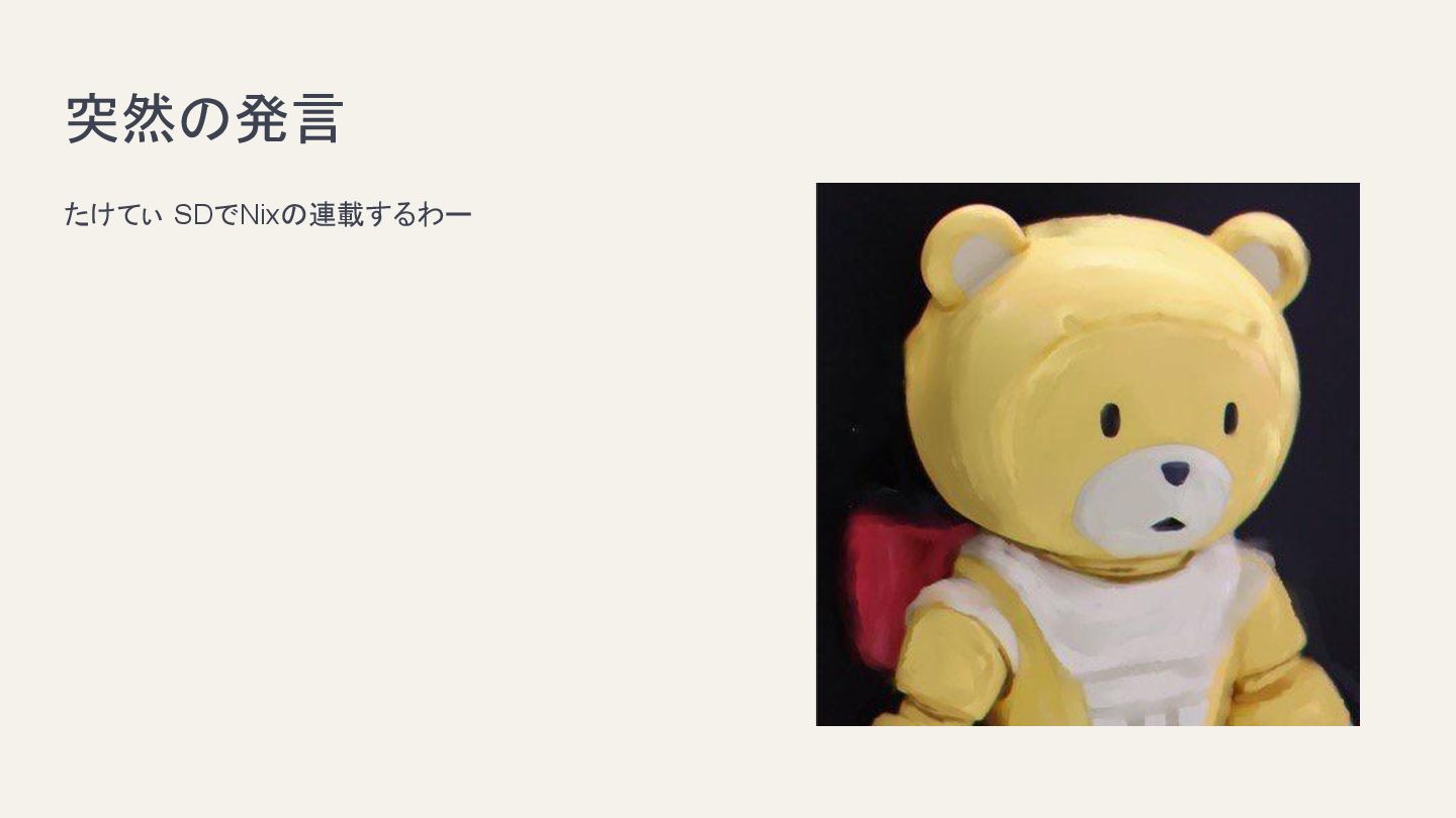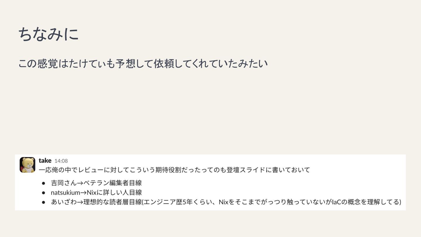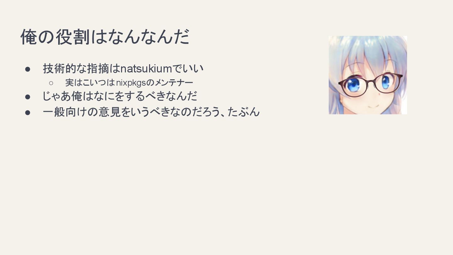 俺の役割はなんなんだ • 技術的な指摘はnatsukiumでいい ◦ 実はこいつはnixpkgsのメンテナー • じゃあ俺はなにをするべきなんだ • 一般向けの意見をいうべきなのだろう、たぶん