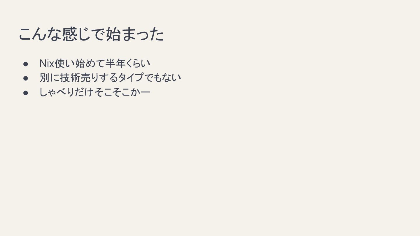 こんな感じで始まった • Nix使い始めて半年くらい • 別に技術売りするタイプでもない • しゃべりだけそこそこかー