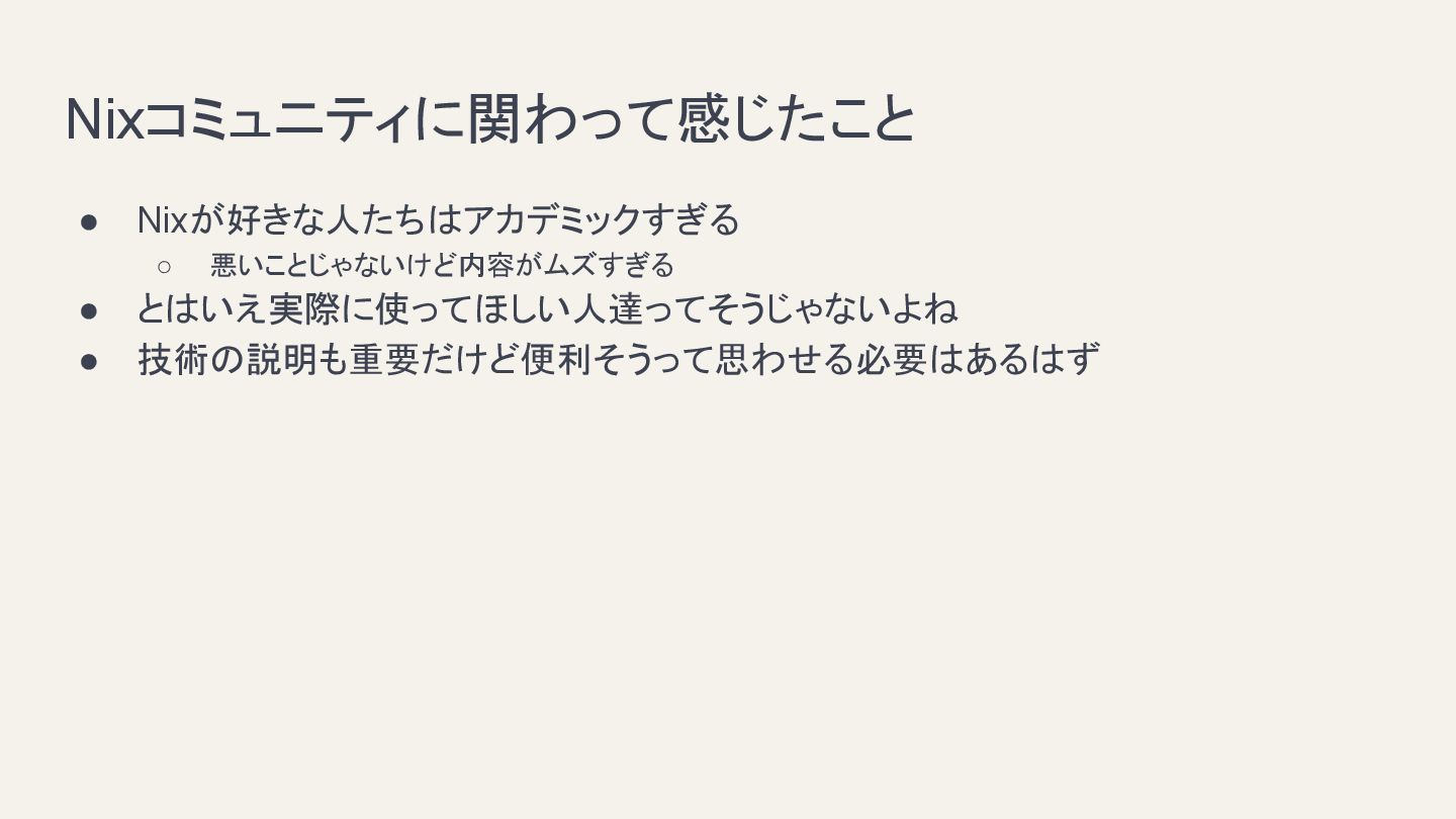 Nixコミュニティに関わって感じたこと • Nixが好きな人たちはアカデミックすぎる ◦ 悪いことじゃないけど内容がムズすぎる • とはいえ実際に使ってほしい人達ってそうじゃないよね • 技術の説明も重要だけど便利そうって思わせる必要はあるはず