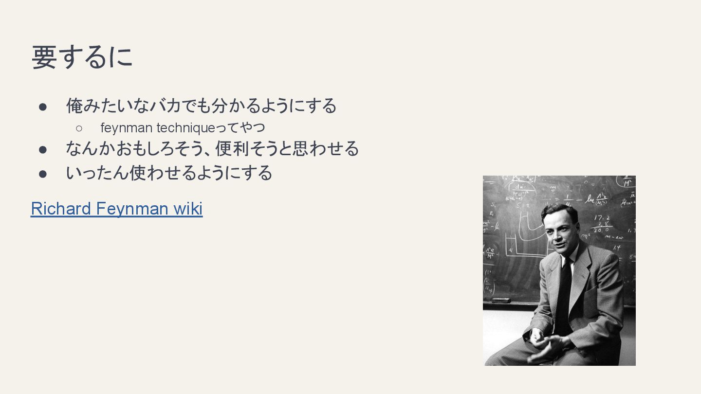 要するに • 俺みたいなバカでも分かるようにする ◦ feynman techniqueってやつ • なんかおもしろそう、便利そうと思わせる • いったん使わせるようにする